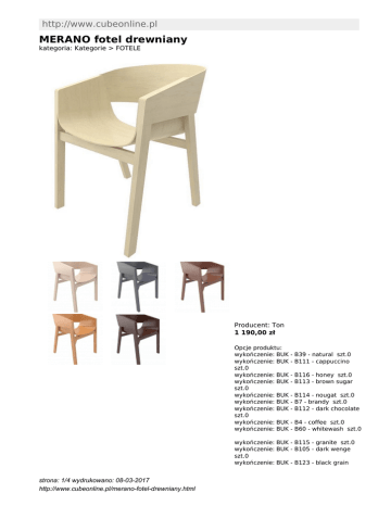 http://www.cubeonline.pl MERANO fotel drewniany kategoria: Kategorie > FOTELE Producent: Ton 1 190,00 zł Opcje produktu: wykończenie: BUK wykończenie: BUK szt.0 wykończenie: BUK wykończenie: BUK szt.0 wykończenie: BUK wykończenie: BUK wykończenie: BUK szt.0 wykończenie: BUK wykończenie: BUK - B39 - natural szt.0 - B111 - cappuccino - B116 - honey szt.0 - B113 - brown sugar - B114 - nougat szt.0 - B7 - brandy szt.0 - B112 - dark chocolate - B4 - coffee szt.0 - B60 - whitewash szt.0 wykończenie: BUK - B115 - granite szt.0 wykończenie: BUK - B105 - dark wenge szt.0 wykończenie: BUK - B123 - black grain strona: 1/4 wydrukowano: 08-03-2017 http://www.cubeonline.pl/merano-fotel-drewniany.html szt.0 wykończenie: BUK - B20 - white 1750 szt.0 wykończenie: BUK wykończenie: BUK classic 1322 szt.0 wykończenie: BUK bianco 1322 szt.0 wykończenie: BUK wykończenie: BUK szt.0 wykończenie: BUK szt.0 wykończenie: BUK szt.0 wykończenie: BUK szt.0 wykończenie: BUK szt.0 wykończenie: BUK wykończenie: wykończenie: szt. wykończenie: szt. wykończenie: szt. wykończenie: szt. wykończenie: 1862 szt. wykończenie: 1862 szt. wykończenie: 1862 szt. wykończenie: szt.0 wykończenie: wykończenie: wykończenie: 1590 szt. wykończenie: szt. wykończenie: 1590 szt. wykończenie: szt. wykończenie: 1590 szt. wykończenie: 1590 szt. wykończenie: wykończenie: 1873 szt. wykończenie: szt. wykończenie: szt. wykończenie: szt. wykończenie: szt. wykończenie: 1873 szt. wykończenie: 1873 szt. strona: 2/4 wydrukowano: 08-03-2017 http://www.cubeonline.pl/merano-fotel-drewniany.html - B21 - black 1862 szt.0 - B130/A - antique - B4/W - antiquue - B80 - red 1862 szt.0 - B92 - cool grey 1862 - B84 - yellow 1862 - B94 - dark blue 1862 - B81 - turquise 1862 - B85 - magenta 1862 - B93 - green 1862 szt.0 BUK - B58 - gold 1862 szt.0 BUK - B36 - light blue 1862 BUK - B37 - ocean blue 1862 BUK - B35 - mint green 1862 BUK - B34 - red berry 1862 BUK - B33 - pumpkin orange BUK - B32 - ginger yellow BUK - B31 - sandy beige DĄB - B39 - natural 1590 DĄB - B7 - brandy 1590 szt. DĄB - B4 - coffee 1590 szt. DĄB - B123 - black grain DĄB - B115 - granite 1590 DĄB - B113 - brown sugar DĄB - B114 - nougat 1590 DĄB - B112 - dark chocolate DĄB - B105 - dark wenge DĄB - B20 - white 1760 szt. DĄB - B38 - grey shadow DĄB - B37 - ocean blue 1873 DĄB - B36 - light blue 1873 DĄB - B35 - mint green 1873 DĄB - B34 - red berry 1873 DĄB - B33 - pumpkin orange DĄB - B32 - ginger yellow wykończenie: DĄB - B31 - sandy beige 1873 szt. Kod QR: MERANO to jeden z najbardziej znanych projektów czeskiej firmy TON. Siedzisko fotela składa się z dwóch giętych elementów, osadzonych na czterech prostych nogach. Lekka, nowoczesna konstrukcja daje gwarnację komfortu i wygody. Fotel Merano otrzymał prestiżową nagrodę za wzornictwo Red Dot Design Award. WYMIARY (cm): wysokość siedziska- 45 wysokość całkowita- 78 szerokość- 47,5 głębokość- 39 strona: 3/4 wydrukowano: 08-03-2017 http://www.cubeonline.pl/merano-fotel-drewniany.html WAGA (kg): 9,06 MATERIAŁ: drewno - buk lub dąb Inne produkty tej firmy: http://cubeonline.pl/manufacturer/ton strona: 4/4 wydrukowano: 08-03-2017 http://www.cubeonline.pl/merano-fotel-drewniany.html
