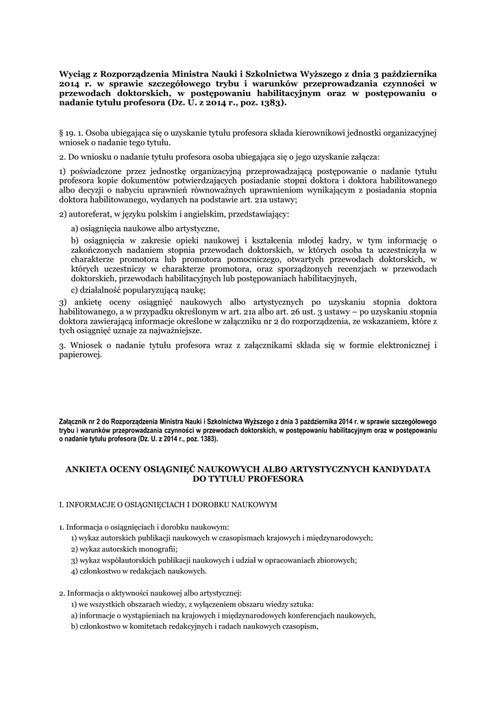 Wyciąg z Rozporządzenia Ministra Nauki i Szkolnictwa Wyższego z dnia 3 października 2014 r. w sprawie szczegółowego trybu i warunków przeprowadzania czynności w przewodach doktorskich, w postępowaniu habilitacyjnym oraz w postępowaniu o nadanie tytułu profesora (Dz. U. z 2014 r., poz. 1383). § 19. 1. Osoba ubiegająca się o uzyskanie tytułu profesora składa kierownikowi jednostki organizacyjnej wniosek o nadanie tego tytułu. 2. Do wniosku o nadanie tytułu profesora osoba ubiegająca się o jego uzyskanie załącza: 1) poświadczone przez jednostkę organizacyjną przeprowadzającą postępowanie o nadanie tytułu profesora kopie dokumentów potwierdzających posiadanie stopni doktora i doktora habilitowanego albo decyzji o nabyciu uprawnień równoważnych uprawnieniom wynikającym z posiadania stopnia doktora habilitowanego, wydanych na podstawie art. 21a ustawy; 2) autoreferat, w języku polskim i angielskim, przedstawiający: a) osiągnięcia naukowe albo artystyczne, b) osiągnięcia w zakresie opieki naukowej i kształcenia młodej kadry, w tym informację o zakończonych nadaniem stopnia przewodach doktorskich, w których osoba ta uczestniczyła w charakterze promotora lub promotora pomocniczego, otwartych przewodach doktorskich, w których uczestniczy w charakterze promotora, oraz sporządzonych recenzjach w przewodach doktorskich, przewodach habilitacyjnych lub postępowaniach habilitacyjnych, c) działalność popularyzującą naukę; 3) ankietę oceny osiągnięć naukowych albo artystycznych po uzyskaniu stopnia doktora habilitowanego, a w przypadku określonym w art. 21a albo art. 26 ust. 3 ustawy – po uzyskaniu stopnia doktora zawierającą informacje określone w załączniku nr 2 do rozporządzenia, ze wskazaniem, które z tych osiągnięć uznaje za najważniejsze. 3. Wniosek o nadanie tytułu profesora wraz z załącznikami składa się w formie elektronicznej i papierowej. Załącznik nr 2 do Rozporządzenia Ministra Nauki i Szkolnictwa Wyższego z dnia 3 października 2014 r. w sprawie szczegółowego trybu i warunków przeprowadzania czynności w przewodach doktorskich, w postępowaniu habilitacyjnym oraz w postępowaniu o nadanie tytułu profesora (Dz. U. z 2014 r., poz. 1383). ANKIETA OCENY OSIĄGNIĘĆ NAUKOWYCH ALBO ARTYSTYCZNYCH KANDYDATA DO TYTUŁU PROFESORA I. INFORMACJE O OSIĄGNIĘCIACH I DOROBKU NAUKOWYM 1. Informacja o osiągnięciach i dorobku naukowym: 1) wykaz autorskich publikacji naukowych w czasopismach krajowych i międzynarodowych; 2) wykaz autorskich monografii; 3) wykaz współautorskich publikacji naukowych i udział w opracowaniach zbiorowych; 4) członkostwo w redakcjach naukowych. 2. Informacja o aktywności naukowej albo artystycznej: 1) we wszystkich obszarach wiedzy, z wyłączeniem obszaru wiedzy sztuka: a) informacje o wystąpieniach na krajowych i międzynarodowych konferencjach naukowych, b) członkostwo w komitetach redakcyjnych i radach naukowych czasopism, c) wykaz zrealizowanych projektów naukowo-badawczych krajowych, europejskich i innych międzynarodowych, d) informacje o kierowaniu zespołami badawczymi realizującymi projekty finansowane w drodze konkursów krajowych i zagranicznych; 2) w obszarze wiedzy sztuka: a) wykaz publicznych realizacji dzieł artystycznych, b) wykaz publikacji utworów lub dzieł artystycznych, c) wykaz współautorskich utworów lub dzieł artystycznych. 3. Informacja o współpracy z otoczeniem społecznym i gospodarczym: 1) w obszarach wiedzy: nauki ścisłe, nauki techniczne, nauki przyrodnicze, nauki rolnicze, leśne i weterynaryjne, nauki medyczne i nauki o zdrowiu oraz nauki o kulturze fizycznej: a) dorobek technologiczny i współpraca z sektorem gospodarczym, b) prawa własności przemysłowej lub prawa do ochrony wyhodowanych albo odkrytych i wyprowadzonych odmian roślin, uzyskane w kraju lub za granicą, c) wdrożenia technologii, konstrukcji, procesów, rozwiązań oraz procedur, d) ekspertyzy i inne opracowania wykonane na zamówienie instytucji publicznych lub przedsiębiorców, e) udziały lub akcje objęte lub nabyte w spółkach w celu wdrożenia lub przygotowania do wdrożenia wyników badań naukowych, prac rozwojowych lub know-how związanych z tymi wynikami, f) udział w zespołach eksperckich i konkursowych; 2) w obszarach wiedzy nauki społeczne i nauki humanistyczne: a) ekspertyzy i inne opracowania wykonane na zamówienie instytucji publicznych lub przedsiębiorców, b) pełnione funkcje zarządcze w spółkach prowadzących działalność badawczo-rozwojową, instytucjach finansowych, kancelariach prawniczych, placówkach terapeutycznych i innych organizacjach o charakterze publicznym, c) udział w zespołach eksperckich i konkursowych; 3) w obszarze wiedzy sztuka: a) projekty zrealizowane we współpracy ze środowiskami pozaartystycznymi, b) prawa własności przemysłowej uzyskane w kraju lub za granicą (dotyczy sztuk projektowych), c) ekspertyzy i inne opracowania wykonane w szczególności na zamówienie instytucji publicznych lub przedsiębiorców, d) udział w zespołach eksperckich i konkursowych. 4. Informacja o współpracy międzynarodowej: 1) we wszystkich obszarach wiedzy, z wyłączeniem obszaru wiedzy sztuka: a) staże zagraniczne (wraz z określeniem czasu ich trwania), b) udział w ocenie projektów międzynarodowych, c) recenzowanie prac publikowanych w czasopismach międzynarodowych z zastosowaniem wskaźnika impact factor, d) członkostwo w międzynarodowych organizacjach i towarzystwach naukowych, e) udział w międzynarodowych zespołach eksperckich, f) uczestnictwo w programach europejskich i innych programach międzynarodowych, g) udział w międzynarodowych zespołach badawczych; 2) w obszarze wiedzy sztuka: a) staże zagraniczne (wraz z określeniem czasu ich trwania), b) udział w międzynarodowych wydarzeniach artystycznych, c) uczestnictwo w projektach europejskich i innych programach międzynarodowych, d) członkostwo w między