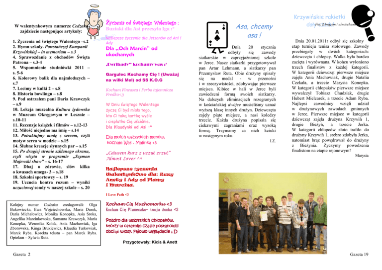W walentynkowym numerze Cedzaka zajdziecie następujące artykuły: 1. śyczenia od świętego Walentego –s.2 2. Hymn szkoły. Powstańczej Kompanii Krzywińskiej – in memoriam – s.3 4. Sprawozdanie z obchodów Święta Patrona – s.3-4 5. Wspomnienie studniówki 2011 – s. 5-6 6. Kolorowy balik dla najmłodszych – s.7 7. Lecimy w kulki 2 – s.8 8. Historia bowlingu – s.8 9. Pod ostrzałem pani Daria Krawczyk – s.9 10. Lekcja muzealna Kultura Ŝydowska w Muzeum Okręgowym w Lesznie – s.10-11 11. Recenzje ksiąŜek i filmów – s.12-13 12. Miłość niejedno ma imię – s.14 13. Potraktujmy modę z sercem, czyli motyw serca w modzie – s.15 14. Ślubne kreacje słynnych par – s.15 15. Po drugiej stronie szklanego ekranu, czyli wizyta w programie „Szymon Majewski show” – s. 16-17 17. Dbaj o zdrowie, słów kilka o kwasach omega- 3 – s.18 18. Szkolni sportowcy – s. 19 19. Uczucia kontra rozum – wyniki uczuciowej sondy w naszej szkole – s. 20 Życzenia yczenia od świ więtego wi tego Walentego : Buziaki dla Asi przesyła Iga :* Najlepsze Ŝyczenia dla Jetsonów od Ani i Ady Dla ,,Och Marcin” od ukochanych ,Ewribady” kochamy was :* Gargulec Kochamy Cię ! (UwaŜaj na wilki Mel) od SS K.O.G Kocham Fineasza i Ferba tajemnicza Fredka<3 W Dniu świętego Walentego Ŝyczę Ci byś miała tego, kto Ci taką kartkę wyśle i cieplutko Cię uściśnie. Dla Klaudynki od Asi :* Dla moich wszystkich menów, kocham Was . Malinka <3 ,,Całusem kurz z uczuć zrzuć” Almost Lover ^^ Asa, chcemy asa ! Dnia 20 stycznia odbyły się zawody siatkarskie w zaprzyjaźnionej szkole w Jerce. Nasze siatkarki przygotowywał pan Artur Lehmann, a siatkarzy pan Przemysław Ruta. Obie druŜyny spisały się na medal w przenośni i w rzeczywistości, zdobywając pierwsze miejsca. Kibice w hali w Jerce byli zawiedzeni formą swoich siatkarzy. Na dalszych eliminacjach rozegranych w kościańskiej dwójce musieliśmy uznać wyŜszą klasę innych druŜyn. Dziewczęta zajęły piąte miejsce, a nasi koledzy trzecie. KaŜda druŜyna popisała się ciekawymi zagraniami oraz wysoką formą. Trzymamy za nich kciuki w następnym roku. I.Z. Krzywińskie rakietki Z brązem i uśmiechami dałyFot. czadu! Dnia 20.01.2011r odbył się szkolny etap turnieju tenisa stołowego. Zawody przebiegały w dwóch kategoriach: dziewczęta i chłopcy. Walka była bardzo zacięta i wyrównana. W końcu wyłoniono trzech finalistów z kaŜdej kategorii. W kategorii dziewcząt pierwsze miejsce zajęła Ania Machowiak, drugie Natalia Czekała, a trzecie Marysia Konopka. W kategorii chłopaków pierwsze miejsce wywalczył Tobiasz Chudziak, drugie Hubert Mielcarek, a trzecie Adam Ryba. Najlepsi zawodnicy wzięli udział w druŜynowych zawodach gminnych w Jerce. Pierwsze miejsce w kategorii dziewcząt zajęła druŜyna Krzywiń 1, drugie BieŜyń, a trzecie Jerka. W kategorii chłopców złoto trafiło do druŜyny Krzywiń 1, srebro zdobyła Jerka, natomiast brąz powędrował do druŜyny z BieŜynia. śyczymy powodzenia finalistom na etapie rejonowym! Marysia Najlepsze życzenia WalentynkOwe dla: Zuzy Anety i Ady od Plamy i Marcina. I Love Path <3 Kolejny numer Cedzaka zredagowali: Olga Bukowiecka, Ewa Wojciechowska, Maria Durek, Daria Michałowicz, Monika Konopka, Asia Sroka, Angelika Marcinkowska, Samanta Krawczyk, Maria Konopka, Weronika Kołak, Ania Machowiak, Iga Zborowska, Kinga Brukiewicz, Klaudia Turkowiak, Marek Ryba. Korekta tekstu – pan Marek Ryba. Opiekun – Sylwia Ruta. Kocham Cię Cię Muchomorku <3 Kocham Cię PlameczkoPlameczko- twoja żonka <3 Pozdro dla wszystkich chłopaków, którzy w ostatnim czasie postanowili obciąć obci włosy. Fajowo wyglądacie wygl dacie ; D Przygotowały: Kicia & Anett Gazeta 2 Gazeta 19