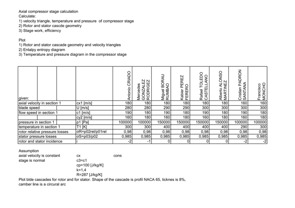 Axial compressor stage calculation Calculate: 1) velocity triangle, temperature and pressure of compressor stage 2) Rotor and stator cascde geometry 3) Stage work, efficiency Assumption axial velocity is constant stage is normal Miguel BORAU RUMBAO Kabier PEREZ FERERO Rafael TOLEDO CASTELLANO Alberto ALONSO MARTINEZ Cristian PADRON SANTANA Francisco MONCHO pressure in section 1 temperature in section 1 rotor relative pressure losses stator pressure losses rotor and stator incidence cx1 [m/s] U [m/s] c1 [m/s] cy2 [m/s] p1 [Pa] T1 [K] σR=p02rel/p01rel σS=p03/p02 i Mercedes GONZALEZ RODRIGEZ given: axial velocity in section 1 blade speed flow speed in section 1 Antonio CRIADO Plot 1) Rotor and stator cascade geometry and velocity triangles 2) Entalpy entropy diagram 3) Temperature and pressure diagram in the compressor stage 180 280 190 160 100000 300 0,98 0,985 -2 180 280 180 180 100000 300 0,98 0,985 -1 180 290 190 160 150000 400 0,98 0,985 0 180 290 180 180 150000 400 0,98 0,985 0 180 300 190 160 150000 400 0,98 0,985 0 180 300 180 180 150000 400 0,98 0,985 0 160 300 190 160 100000 290 0,98 0,985 -2 160 300 180 180 100000 300 0,98 0,985 -2 cx cons c3=c1 cp=100 [J/kg/K] k=1,4 R=287 [J/kg/K] Plot blde cascades for rotor and for stator. Shape of the cascade is profil NACA 65, ticknes is 8%, camber line is a circural arc