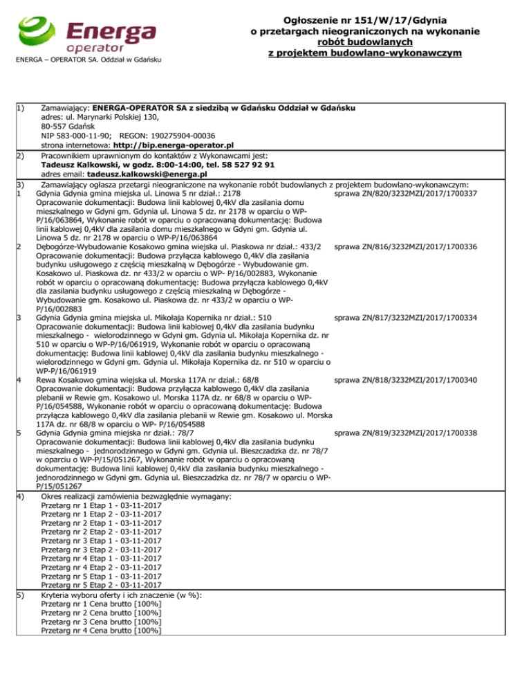 ENERGA – OPERATOR SA. Oddział w Gdańsku 1) 2) 3) 1 2 3 4 5 4) 5) Ogłoszenie nr 151/W/17/Gdynia o przetargach nieograniczonych na wykonanie robót budowlanych z projektem budowlano-wykonawczym Zamawiający: ENERGA-OPERATOR SA z siedzibą w Gdańsku Oddział w Gdańsku adres: ul. Marynarki Polskiej 130, 80-557 Gdańsk NIP 583-000-11-90; REGON: 190275904-00036 strona internetowa: http://bip.energa-operator.pl Pracownikiem uprawnionym do kontaktów z Wykonawcami jest: Tadeusz Kalkowski, w godz. 8:00-14:00, tel. 58 527 92 91 adres email: [email protected] Zamawiający ogłasza przetargi nieograniczone na wykonanie robót budowlanych z projektem budowlano-wykonawczym: Gdynia Gdynia gmina miejska ul. Linowa 5 nr dział.: 2178 sprawa ZN/820/3232MZI/2017/1700337 Opracowanie dokumentacji: Budowa linii kablowej 0,4kV dla zasilania domu mieszkalnego w Gdyni gm. Gdynia ul. Linowa 5 dz. nr 2178 w oparciu o WPP/16/063864, Wykonanie robót w oparciu o opracowaną dokumentację: Budowa linii kablowej 0,4kV dla zasilania domu mieszkalnego w Gdyni gm. Gdynia ul. Linowa 5 dz. nr 2178 w oparciu o WP-P/16/063864 Dębogórze-Wybudowanie Kosakowo gmina wiejska ul. Piaskowa nr dział.: 433/2 sprawa ZN/816/3232MZI/2017/1700336 Opracowanie dokumentacji: Budowa przyłącza kablowego 0,4kV dla zasilania budynku usługowego z częścią mieszkalną w Dębogórze - Wybudowanie gm. Kosakowo ul. Piaskowa dz. nr 433/2 w oparciu o WP- P/16/002883, Wykonanie robót w oparciu o opracowaną dokumentację: Budowa przyłącza kablowego 0,4kV dla zasilania budynku usługowego z częścią mieszkalną w Dębogórze Wybudowanie gm. Kosakowo ul. Piaskowa dz. nr 433/2 w oparciu o WPP/16/002883 Gdynia Gdynia gmina miejska ul. Mikołaja Kopernika nr dział.: 510 sprawa ZN/817/3232MZI/2017/1700334 Opracowanie dokumentacji: Budowa linii kablowej 0,4kV dla zasilania budynku mieszkalnego - wielorodzinnego w Gdyni gm. Gdynia ul. Mikołaja Kopernika dz. nr 510 w oparciu o WP-P/16/061919, Wykonanie robót w oparciu o opracowaną dokumentację: Budowa linii kablowej 0,4kV dla zasilania budynku mieszkalnego wielorodzinnego w Gdyni gm. Gdynia ul. Mikołaja Kopernika dz. nr 510 w oparciu o WP-P/16/061919 Rewa Kosakowo gmina wiejska ul. Morska 117A nr dział.: 68/8 sprawa ZN/818/3232MZI/2017/1700340 Opracowanie dokumentacji: Budowa przyłącza kablowego 0,4kV dla zasilania plebanii w Rewie gm. Kosakowo ul. Morska 117A dz. nr 68/8 w oparciu o WPP/16/054588, Wykonanie robót w oparciu o opracowaną dokumentację: Budowa przyłącza kablowego 0,4kV dla zasilania plebanii w Rewie gm. Kosakowo ul. Morska 117A dz. nr 68/8 w oparciu o WP- P/16/054588 Gdynia Gdynia gmina miejska nr dział.: 78/7 sprawa ZN/819/3232MZI/2017/1700338 Opracowanie dokumentacji: Budowa linii kablowej 0,4kV dla zasilania budynku mieszkalnego - jednorodzinnego w Gdyni gm. Gdynia ul. Bieszczadzka dz. nr 78/7 w oparciu o WP-P/15/051267, Wykonanie robót w oparciu o opracowaną dokumentację: Budowa linii kablowej 0,4kV dla zasilania budynku mieszkalnego jednorodzinnego w Gdyni gm. Gdynia ul. Bieszczadzka dz. nr 78/7 w oparciu o WPP/15/051267 Okres realizacji zamówienia bezwzględnie wymagany: Przetarg nr 1 Etap 1 - 03-11-2017 Przetarg nr 1 Etap 2 - 03-11-2017 Przetarg nr 2 Etap 1 - 03-11-2017 Przetarg nr 2 Etap 2 - 03-11-2017 Przetarg nr 3 Etap 1 - 03-11-2017 Przetarg nr 3 Etap 2 - 03-11-2017 Przetarg nr 4 Etap 1 - 03-11-2017 Przetarg nr 4 Etap 2 - 03-11-2017 Przetarg nr 5 Etap 1 - 03-11-2017 Przetarg nr 5 Etap 2 - 03-11-2017 Kryteria wyboru oferty i ich znaczenie (w %): Przetarg nr 1 Cena brutto [100%] Przetarg nr 2 Cena brutto [100%] Przetarg nr 3 Cena brutto [100%] Przetarg nr 4 Cena brutto [100%] ENERGA – OPERATOR SA. Oddział w Gdańsku 6) Ogłoszenie nr 151/W/17/Gdynia o przetargach nieograniczonych na wykonanie robót budowlanych z projektem budowlano-wykonawczym Przetarg nr 5 Cena brutto [100%] Warunki Zamówienia wraz z załącznikami dla poszczególnych przetargów można pobrać ze strony internetowej Zamawiającego pod adresem: http://bip.energa-operator.pl/centrala/lokalne/przetargi.xml?group=centrala Ogólne Warunki Umów dostępne są na stronie internetowej Zamawiającego pod adresem: http://www.energaoperator.pl/dostawcy_i_przetargi/regulaminy.xml 7) 8) 9) 10) 11) Do przetargu mogą przystąpić Wykonawcy zakwalifikowani do prac na rzecz ENERGA - OPERATOR SA i znajdujący się w Rejestrze Kwalifikowanych Wykonawców oraz spełniają pozostałe wymagania określone w WZ. Wniosek o umieszczenie w RKW wraz z Procedurą można pobrać ze strony: http://www.energa-operator.pl/dostawcy_i_przetargi/regulaminy.xml Miejsce i termin składania ofert: siedziba Zamawiającego, Kancelaria (pok. 2) do 03-03-2017 godz. 08:00 Miejsce i termin publicznego otwarcia ofert: siedziba Zamawiającego, pok 409 data 03-03-2017 godz. 08:50 Termin związania z ofertą: 90 dni od daty upływu terminu składania ofert. Postępowanie o udzielenie zamówienia prowadzone jest w trybie przetargu nieograniczonego, z zachowaniem zasad określonych: ustawą z dnia 23 kwietnia 1964r. Kodeks cywilny (Dz. U. z 1964 r. Nr 16, poz. 93 z późn. zmianami) oraz Regulaminem udzielania zamówień w Energa-Operator SA. Sporządził(a): Tadeusz Kalkowski Gdańsk, 20-02-2017 r. ENERGA – OPERATOR SA Oddział w Gdańsku WARUNKI ZAMÓWIENIA do przetargów nieograniczonych z ogłoszenia nr 151/W/17/Gdynia prowadzonych przez ENERGA – OPERATOR SA Oddział w Gdańsku w oparciu o Regulamin udzielania zamówień w ENERGA-OPERATOR SA przedmiot zamówienia – wykonanie robót budowlanych z projektem budowlano-wykonawczym: 1 2 3 4 5 Gdynia Gdynia gmina miejska ul. Linowa 5 nr dział.: 2178 sprawa Opracowanie dokumentacji: Budowa linii kablowej 0,4kV dla zasilania domu mieszkalnego w Gdyni gm. Gdynia ul. Linowa 5 dz. nr 2178 w oparciu o WPP/16/063864, Wykonanie robót w oparciu o opracowaną dokumentację: Budowa linii kablowej 0,4kV dla zasilania domu mieszkalnego w Gdyni gm. Gdynia ul. Linowa 5 dz. nr 2178 w 