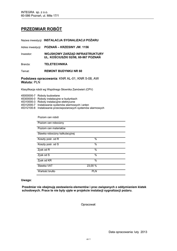INTEGRA sp. z o.o. 60-586 Poznań, ul. Miła 17/1 PRZEDMIAR ROBÓT Nazwa inwestycji: INSTALACJA SYGNALIZACJI POŻARU Adres inwestycji: POZNAŃ – KRZESINY JW. 1156 Inwestor: WOJSKOWY ZARZĄD INFRASTRUKTURY UL. KOŚCIUSZKI 92/98, 60-967 POZNAŃ Branża: TELETECHNIKA Temat: REMONT BUDYNKU NR 60 Podstawa opracowania: KNR AL-01, KNR 5-08, AW Waluta: PLN Klasyfikacja robót wg Wspólnego Słownika Zamówień (CPV) 45000000-7 45300000-0 45310000-3 45312000-7 45312100-8 Roboty budowlane Roboty instalacyjne w budynkach Roboty instalacyjne elektryczne Instalowanie systemów alarmowych i anten Instalowanie przeciwpożarowych systemów alarmowych Poziom cen robót Poziom cen robocizny Poziom cen materiałów Stawka robocizny kalkulacyjnej Koszty pośr. od R % Koszty pośr. od S % Zysk od R % Zysk od S % Zysk od KR % Stawka VAT 23,00 % Wartość brutto PLN Uwaga: Przedmiar nie obejmuję zestawienia elementów i prac związanych z oddymianiem klatek schodowych. Prace te nie były ujęte w projekcie instalacji sygnalizacji pożaru. Opracował: Data opracowania: luty 2013 str 1 INTEGRA sp. z o.o. 60-586 Poznań, ul. Miła 17/1 Lp. Podstawa ustalenia Opis robót Jedn. miary 3 4 Obmiar 1. OKABLOWANIE SYSTEMU 1 2 1 wg nakładów rzeczowych KNR 5-080202-02040 Montaż konsolek pod przewody kabelkowe układane w ciągach wielokrotnych z przygot.podłoża sprzętem mechan.Przykręcanie kołkami rozporowymi do podłoża ceglanego 5 m 150,00 m 70,00 m 80,00 krotność= 1,00 2 wg nakładów rzeczowych KNR 5-080211-01040 Przewody kabelkowe w powłoce polwinitowej n.t. układane na przygotowanym podłożu,mocowane paskami lub klamerkami. Łączny przekrój żył do 6Cu, 12Al mm2 krotność= 1,00 3 wg nakładów rzeczowych KNR 5-080211-01040 Przewody kabelkowe w powłoce polwinitowej n.t. układane na przygotowanym podłożu,mocowane paskami lub klamerkami. Łączny przekrój żył do 6Cu, 12Al mm2 krotność= 1,00 2. MONTAŻ ELEMENTÓW SYSTEMU 1 2 3 4 wg nakładów rzeczowych KNR AL-01L-01 0404-09-020 5 wg nakładów rzeczowych KNR AL-01L-01 0106-03-020 Montaż dodatkowych urządzeń i elementów SAP na gotowym podłożu z podłączeniem - MMI CIP 6 wg nakładów rzeczowych KNR AL-01L-01 0403-02-020 Montaż gniazd pożarowych do samoczynnych ostrzegaczy pożarowych - USB 501-1 7 wg nakładów rzeczowych KNR AL-01L-01 0401-01-020 8 wg nakładów rzeczowych KNR AL-01L-01 0404-06-020 Montaż czujek pożarowych - izotopowa lub optyczna dymu - CUBUS MTD 533X 4 5 szt 1,00 szt 1,00 szt 11,00 szt 11,00 szt 11,00 krotność= 1,00 Montaż dodatkowej karty funkcyjnej centrali alarmowej - karta podłączenia - B5-BAF Charakterystyka Robót: Tablica 0106 Montaż dodatkowej karty funkcyjnej w centrali alarmowej krotność= 1,00 krotność= 1,00 krotność= 1,00 Montaż dodatkowych urządzeń i elementów SAP dodatkowe zewnętrznych wskaźniki zadziałania w wyk. konwencjonalnym w uprzednio zainst. gniazdach i obudowach wraz ze sprawdzeniem BA-UPI krotność= 1,00 str 2 INTEGRA sp. z o.o. 60-586 Poznań, ul. Miła 17/1 3. SPRAWDZENIE I URUCHOMIENIE SYSTEMU 1 2 9 wg nakładów rzeczowych KNR AL-01L-01 0603-08-086 10 wg nakładów rzeczowych KNR AL-01L-01 0604-04-020 11 wg nakładów rzeczowych AW-020 3 Uruchomienie i pomiary linii dozorowych adresowych do 128 adresów 4 5 lin. 3,00 szt 3,00 szt 1,00 krotność= 1,00 Praca próbna i testowanie systemu alarmowego do 96 elementów liniowych krotność= 1,00 Wykonanie dokumentacji powykonawczej krotność= 1,00 str 3 INTEGRA sp. z o.o. 60-586 Poznań, ul. Miła 17/1 Kosztorys ofertowy Lp. Podstawa wyceny 1 2 Opis pozycji kosztorysowych Obmiar J.m C.j. R C.j. M C.j. S Wartość 3 4 5 6 6 7 8 1. OKABLOWANIE SYSTEMU 1. KNR 5-08 0202-02-040 Montaż konsolek pod przewody kabelkowe układane w ciągach wielokrotnych z przygot.podłoża sprzętem mechan.Przykręcanie kołkami rozporowymi do podłoża ceglanego 150,00 m 70,00 m 80,00 m 1,00 szt 1,00 szt 11,00 szt 11,00 szt 11,00 szt Krotność = 1,00 2. KNR 5-08 0211-01-040 Przewody kabelkowe w powłoce polwinitowej n.t. układane na przygotowanym podłożu,mocowane paskami lub klamerkami. Łączny przekrój żył do 6Cu, 12Al mm2 Krotność = 1,00 3. KNR 5-08 0211-01-040 Przewody kabelkowe w powłoce polwinitowej n.t. układane na przygotowanym podłożu,mocowane paskami lub klamerkami. Łączny przekrój żył do 6Cu, 12Al mm2 Krotność = 1,00 Razem: 2. MONTAŻ ELEMENTÓW SYSTEMU 4. KNR AL-01 L-01 040409-020 Montaż dodatkowych urządzeń i elementów SAP na gotowym podłożu z podłączeniem - MMI CIP Krotność = 1,00 5. KNR AL-01 L-01 010603-020 Montaż dodatkowej karty funkcyjnej centrali alarmowej - karta podłączenia - B5-BAF Krotność = 1,00 6. KNR AL-01 L-01 040302-020 Montaż gniazd pożarowych do samoczynnych ostrzegaczy pożarowych USB 501-1 Krotność = 1,00 7. KNR AL-01 L-01 040101-020 Montaż czujek pożarowych - izotopowa lub optyczna dymu - CUBUS MTD 533X Krotność = 1,00 8. KNR AL-01 L-01 040406-020 Montaż dodatkowych urządzeń i elementów SAP - dodatkowe zewnętrznych wskaźniki zadziałania w wyk. konwencjonalnym w uprzednio zainst. gniazdach i obudowach wraz ze sprawdzeniem BA-UPI str 4 INTEGRA sp. z o.o. 60-586 Poznań, ul. Miła 17/1 1 2 3 4 5 6 6 7 8 Krotność = 1,00 Razem: 3. SPRAWDZENIE I URUCHOMIENIE SYSTEMU 9. KNR AL-01 L-01 060308-086 Uruchomienie i pomiary linii dozorowych adresowych - do 128 adresów 3,00 lin. 3,00 szt 1,00 szt Krotność = 1,00 Praca próbna i testowanie systemu alarmowego do 96 elementów liniowych 10. KNR AL-01 L-01 060404-020 Krotność = 1,00 Wykonanie dokumentacji powykonawczej 11. AW-020 Krotność = 1,00 Razem: Razem kosztorys: Skrócone zestawienie RMS Zestawienie robocizny: Lp. W Kod 1 2 3 1. 2. 3. 0 0 0 72 73 999 Zestawienie materiałów: Lp. W Kod Nazwa Jedn. Limit Cena Wartość KB 4 5 6 7 8 Elektromonter linii i urz.elektr. Elektromonter linii i urz.elektr. Robocizna Robocizna pomocnicza Razem: r-g r-g r-g 25,9350 20,3100 371,5930 417,8380 Nazwa Jedn. Limit Cena Wartoś