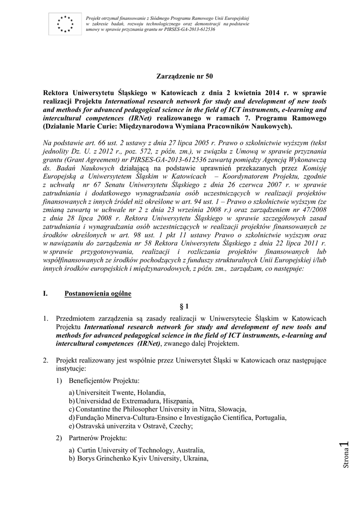 Projekt otrzymał finansowanie z Siódmego Programu Ramowego Unii Europejskiej w zakresie badań, rozwoju technologicznego oraz demonstracji na podstawie umowy w sprawie przyznania grantu nr PIRSES-GA-2013-612536 Zarządzenie nr 50 Rektora Uniwersytetu Śląskiego w Katowicach z dnia 2 kwietnia 2014 r. w sprawie realizacji Projektu International research network for study and development of new tools and methods for advanced pedagogical science in the field of ICT instruments, e-learning and intercultural competences (IRNet) realizowanego w ramach 7. Programu Ramowego (Działanie Marie Curie: Międzynarodowa Wymiana Pracowników Naukowych). Na podstawie art. 66 ust. 2 ustawy z dnia 27 lipca 2005 r. Prawo o szkolnictwie wyższym (tekst jednolity Dz. U. z 2012 r., poz. 572, z późn. zm.), w związku z Umową w sprawie przyznania grantu (Grant Agreement) nr PIRSES-GA-2013-612536 zawartą pomiędzy Agencją Wykonawczą ds. Badań Naukowych działającą na podstawie uprawnień przekazanych przez Komisję Europejską a Uniwersytetem Śląskim w Katowicach – Koordynatorem Projektu, zgodnie z uchwałą nr 67 Senatu Uniwersytetu Śląskiego z dnia 26 czerwca 2007 r. w sprawie zatrudniania i dodatkowego wynagradzania osób uczestniczących w realizacji projektów finansowanych z innych źródeł niż określone w art. 94 ust. 1 – Prawo o szkolnictwie wyższym (ze zmianą zawartą w uchwale nr 2 z dnia 23 września 2008 r.) oraz zarządzeniem nr 47/2008 z dnia 28 lipca 2008 r. Rektora Uniwersytetu Śląskiego w sprawie szczegółowych zasad zatrudniania i wynagradzania osób uczestniczących w realizacji projektów finansowanych ze środków określonych w art. 98 ust. 1 pkt 11 ustawy Prawo o szkolnictwie wyższym oraz w nawiązaniu do zarządzenia nr 58 Rektora Uniwersytetu Śląskiego z dnia 22 lipca 2011 r. w sprawie przygotowywania, realizacji i rozliczania projektów finansowanych lub współfinansowanych ze środków pochodzących z funduszy strukturalnych Unii Europejskiej i/lub innych środków europejskich i międzynarodowych, z późn. zm., zarządzam, co następuje: I. Postanowienia ogólne §1 1. Przedmiotem zarządzenia są zasady realizacji w Uniwersytecie Śląskim w Katowicach Projektu International research network for study and development of new tools and methods for advanced pedagogical science in the field of ICT instruments, e-learning and intercultural competences (IRNet), zwanego dalej Projektem. 2. Projekt realizowany jest wspólnie przez Uniwersytet Śląski w Katowicach oraz następujące instytucje: 1) Beneficjentów Projektu: a) Curtin University of Technology, Australia, b) Borys Grinchenko Kyiv University, Ukraina, Strona 2) Partnerów Projektu: 1 a) Universiteit Twente, Holandia, b) Universidad de Extremadura, Hiszpania, c) Constantine the Philosopher University in Nitra, Słowacja, d) Fundação Minerva-Cultura-Ensino e Investigação Científica, Portugalia, e) Ostravská univerzita v Ostravě, Czechy; Projekt otrzymał finansowanie z Siódmego Programu Ramowego Unii Europejskiej w zakresie badań, rozwoju technologicznego oraz demonstracji na podstawie umowy w sprawie przyznania grantu nr PIRSES-GA-2013-612536 c) Dniprodzerzhinsk State Technical University, Ukraina, d) State Higher Professional Education Institution Herzen State Pedagogical University of Russia, Rosja. 3. Nadrzędnym dokumentem jest Umowa w sprawie przyznania grantu (Grant Agreement) nr PIRSES-GA-2013-612536 wraz z załącznikami, zawarta pomiędzy Agencją Wykonawczą ds. Badań Naukowych działającą na podstawie uprawnień przekazanych przez Komisję Europejską a Koordynatorem Projektu, do której przystąpili wskazani w ust. 2 Beneficjenci Projektu, zwana w dalszej części zarządzenia Umową. 4. Przez Beneficjentów Projektu rozumie się instytucje z krajów Unii Europejskiej (Holandia, Hiszpania, Słowacja, Portugalia, Czechy), które podpisują Umowę z Agencją Wykonawczą ds. Badań Naukowych. 5. Przez Partnerów Projektu rozumie się instytucje z krajów trzecich (Ukraina, Rosja), które nie podpisują Umowy z Agencją Wykonawczą ds. Badań Naukowych. 6. Dokumentem regulującym szczegółowo współpracę pomiędzy Partnerami a Beneficjentami Projektu jest Umowa Partnerska (Partnership Agreement). 7. Zgodnie z Umową Projekt realizowany jest przez 48 miesięcy: od dnia 1 stycznia 2014 r. do dnia 31 grudnia 2017 r. II. Szczególne postanowienia finansowe §2 1. Wkładem finansowym UE na rzecz Partnerów Projektu dysponują Beneficjenci Projektu. Płatności dla naukowców przyjeżdżających z organizacji partnerskich, które kwalifikują się do finansowania przez UE (Ukraina, Rosja) stanowią zadanie Uniwersytetu Śląskiego w Katowicach zaangażowanego w wymianę jako organizacja goszcząca. 2. Zgodnie z postanowieniami Umowy Partnerskiej kwota 4% ogólnego wkładu finansowego UE stanowi koszty zarządzania i pozostaje do wyłącznej dyspozycji Uniwersytetu Śląskiego w Katowicach jako Koordynatora Projektu z przeznaczeniem na cele prac związanych z koordynacją Projektu. Koszty zarządzania są naliczane od rzeczywistego wkładu UE, wyliczonego zgodnie z faktyczną ilością zrealizowanych osobomiesięcy wyjazdu każdego naukowca uczestniczącego w Projekcie. III. Realizacja Projektu §3 Strona 1) Umową w sprawie przyznania grantu (Grant Agreement) nr PIRSES-GA-2013-612536; 2) Umową Partnerską (Partnership Agreement); 3) przepisami zarządzenia nr 58 Rektora Uniwersytetu Śląskiego z dnia 22 lipca 2011 r. w sprawie przygotowywania, realizacji i rozliczania projektów finansowanych lub współfinansowanych ze środków pochodzących z funduszy strukturalnych Unii Europejskiej i/lub innych środków europejskich i międzynarodowych, z późn. zm.; 4) przepisami zarządzenia nr 18 Rektora Uniwersytetu Śląskiego z dnia 19 marca 2012 r. w sprawie wprowadzenia „Obiegu dokumentów dla projektów realizowanych z udziałem 2 Projekt realizowany jest zgodnie z: Projekt otrzy