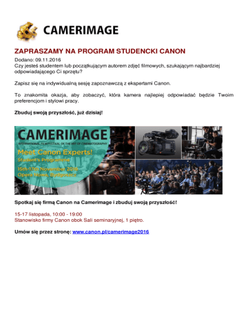 ZAPRASZAMY NA PROGRAM STUDENCKI CANON Dodano: 09.11.2016 Czy jesteś studentem lub początkującym autorem zdjęć filmowych, szukającym najbardziej odpowiadającego Ci sprzętu? Zapisz się na indywidualną sesję zapoznawczą z ekspertami Canon. To znakomita okazja, aby zobaczyć, która kamera najlepiej odpowiadać będzie Twoim preferencjom i stylowi pracy. Zbuduj swoją przyszłość, już dzisiaj! Spotkaj się firmą Canon na Camerimage i zbuduj swoją przyszłość! 15-17 listopada, 10:00 - 19:00 Stanowisko firmy Canon obok Sali seminaryjnej, 1 piętro. Umów się przez stronę: www.canon.pl/camerimage2016