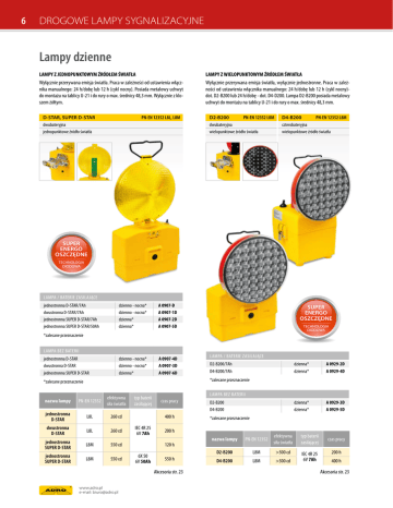 6 DROGOWE LAMPY SYGNALIZACYJNE Lampy dzienne LAMPY Z JEDNOPUNKTOWYM ŹRÓDŁEM ŚWIATŁA LAMPY Z WIELOPUNKTOWYM ŹRÓDŁEM ŚWIATŁA Wyłącznie przerywana emisja światła. Praca w zależności od ustawienia włącznika manualnego: 24 h/dobę lub 12 h (cykl nocny). Posiada metalowy uchwyt do montażu na tablicy U-21 i do rury o max. średnicy 48,3 mm. Wyłącznie z kloszem żółtym. Wyłącznie przerywana emisja światła, wyłącznie jednostronne. Praca w zależności od ustawienia włącznika manualnego: 24 h/dobę lub 12 h (cykl nocny)dot. D2-B200 lub 24 h/dobę - dot. D4-D200. Lampa D2-B200 posiada metalowy uchwyt do montażu na tablicy U-21 i do rury o max. średnicy 48,3 mm. D-STAR, SUPER D-STAR dwubateryjna jednopunktowe źródło światła PN-EN 12352 L8L, L8M D2-B200 PN-EN 12352 L8M dwubateryjna wielopunktowe źródło światła D4-B200 PN-EN 12352 L8M czterobateryjna wielopunktowe źródło światła SUPER ENERGO OSZCZĘDNE TECHNOLOGIA DIODOWA LAMPA / BATERIE ZASILAJĄCE jednostronna D-STAR/7Ah dwustronna D-STAR/7Ah jednostronna SUPER D-STAR/7Ah jednostronna SUPER D-STAR/50Ah dzienno - nocna* dzienno - nocna* dzienna* dzienna* A 0907-D A 0907-1D A 0907-2D A 0907-5D dzienno - nocna* dzienno - nocna* dzienna* A 0907-4D A 0907-3D A 0907-6D SUPER ENERGO OSZCZĘDNE TECHNOLOGIA DIODOWA *zalecane przeznaczenie LAMPA BEZ BATERII jednostronna D-STAR dwustronna D-STAR jednostronna SUPER D-STAR LAMPA / BATERIE ZASILAJĄCE D2-B200/7Ah D4-B200/7Ah dzienna* dzienna* A 0929-2D A 0929-4D dzienna* dzienna* A 0929-3D A 0929-5D *zalecane przeznaczenie *zalecane przeznaczenie nazwa lampy PN-EN 12352 efektywna siła światła jednostronna D-STAR L8L 260 cd dwustronna D-STAR L8L 260 cd jednostronna SUPER D-STAR L8M 550 cd jednostronna SUPER D-STAR L8M 550 cd typ baterii zasilającej LAMPA BEZ BATERII czas pracy 400 h IEC 4R 25 6V 7Ah 550 h Akcesoria str. 23 www.adro.pl e-mail: [email protected] *zalecane przeznaczenie 200 h 120 h 6X 50 6V 50Ah D2-B200 D4-B200 nazwa lampy PN-EN 12352 efektywna siła światła typ baterii zasilającej IEC 4R 25 6V 7Ah D2-B200 L8M >500 cd D4-B200 L8M >500 cd czas pracy 200 h 400 h Akcesoria str. 23
