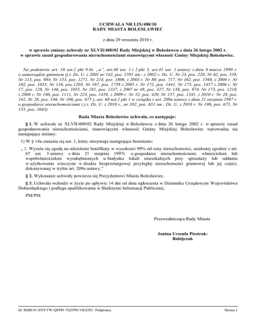 UCHWAŁA NR LIX/480/10 RADY MIASTA BOLESŁAWIEC z dnia 29 września 2010 r. w sprawie zmiany uchwały nr XLVII/400/02 Rady Miejskiej w Bolesławcu z dnia 26 lutego 2002 r. w sprawie zasad gospodarowania nieruchomościami stanowiącymi własność Gminy Miejskiej Bolesławiec. Na podstawie art. 18 ust.2 pkt 9 lit. „a”, art.40 ust. 1 i 2 pkt 3, art.41 ust. 1 ustawy z dnia 8 marca 1990 r. o samorządzie gminnym (j.t. Dz. U. z 2001 nr 142, poz. 1591 zm.: z 2002 r. Dz. U. Nr 23, poz. 220, Nr 62, poz. 558, Nr 113, poz. 984, Nr 153, poz. 1271, Nr 214, poz. 1806, z 2003 r. Nr 80, poz. 717, Nr 162, poz. 1568, z 2004 r. Nr 102, poz. 1055, Nr 116, poz.1203, Nr 167, poz. 1759 z 2005 r. Nr 172, poz. 1441, Nr 175, poz. 1457 z 2006 r. Nr 17, poz. 128, Nr 146, poz. 1055, Nr 181, poz. 1337, z 2007 nr 48, poz. 327, Nr 138, poz. 974, Nr 173, poz. 1218, z 2008 r. Nr 180, poz. 1111, Nr 223, poz. 1458, z 2009 r. Nr 52, poz. 420, Nr 157, poz. 1241, z 2010 r. Nr 28, poz. 142, Nr 28, poz. 146, Nr 106, poz. 675 ), art. 68 ust.1 pkt 1 w związku z art. 209a ustawy z dnia 21 sierpnia 1997 r. o gospodarce nieruchomościami ( j.t. Dz. U. z 2010 r., nr 102, poz. 651 zm.: Dz. U. z 2010 r. Nr 106, poz. 675, Nr 155, poz. 1043) Rada Miasta Bolesławiec uchwala, co następuje: § 1. W uchwale nr XLVII/400/02 Rady Miejskiej w Bolesławcu z dnia 26 lutego 2002 r. w sprawie zasad gospodarowania nieruchomościami, stanowiącymi własność Gminy Miejskiej Bolesławiec wprowadza się następujące zmiany: 1) W § 14a zmienia się ust. 1, który otrzymuje następujące brzmienie: „ 1. Wyraża się zgodę na udzielenie bonifikaty w wysokości 99% od ceny nieruchomości, ustalonej zgodnie z art. 67 ust. 3 ustawy z dnia 21 sierpnia 1997r. o gospodarce nieruchomościami, właścicielom lub współwłaścicielom wyodrębnionych w budynku lokali mieszkalnych przy sprzedaży lub oddaniu w użytkowanie wieczyste w drodze bezprzetargowej przyległej nieruchomości gruntowej lub jej części, dokonywanej w trybie art. 209a ustawy.” § 2. Wykonanie uchwały powierza się Prezydentowi Miasta Bolesławiec. § 3. Uchwała wchodzi w życie po upływie 14 dni od dnia ogłoszenia w Dzienniku Urzędowym Województwa Dolnośląskiego i podlega opublikowaniu w Biuletynie Informacji Publicznej. PM/PM Przewodnicząca Rady Miasta Janina Urszula PiestrakBabijczuk Id: RSBUN-XNYVW-QFPIF-TQTPH-VKXXU. Podpisany Strona 1 Uzasadnienie Zmiana uchwały w sprawie zasad gospodarowania nieruchomościami, stanowiącymi własność Gminy Miejskiej Bolesławiec ma na celu poprawę zagospodarowania nieruchomości zabudowanych budynkami z wyodrębnionymi lokalami mieszkalnymi. Znaczna część tak zabudowanych nieruchomości została sprzedana po obrysie budynków. Nieruchomości z granicami po obrysie budynków są trudne do zarządzania, ze względu na konieczność uzyskania zgody właścicieli sąsiednich działek na wejście na ich teren w celu np. postawienia rusztowań lub przeprowadzenia naprawy i modernizacji infrastruktury technicznej przebiegającej w pobliżu budynków, ale znajdującej się na sąsiedniej nieruchomości. Ponadto zbycie bezpośrednio przyległych gruntów do omawianych nieruchomości zwolni Gminę Miejską z obowiązku utrzymywania terenów np. podwórek, które nie mogą zostać zabudowane i są poprzecinane przebiegającymi sieciami infrastruktury technicznej. Zwiększenie bonifikaty z 90% na 99% ma na celu przyśpieszenie przemian własnościowych w mieście, co przyczyni się do zracjonalizowania zarządzaniem nieruchomościami. PM/PM Id: RSBUN-XNYVW-QFPIF-TQTPH-VKXXU. Podpisany Strona 1