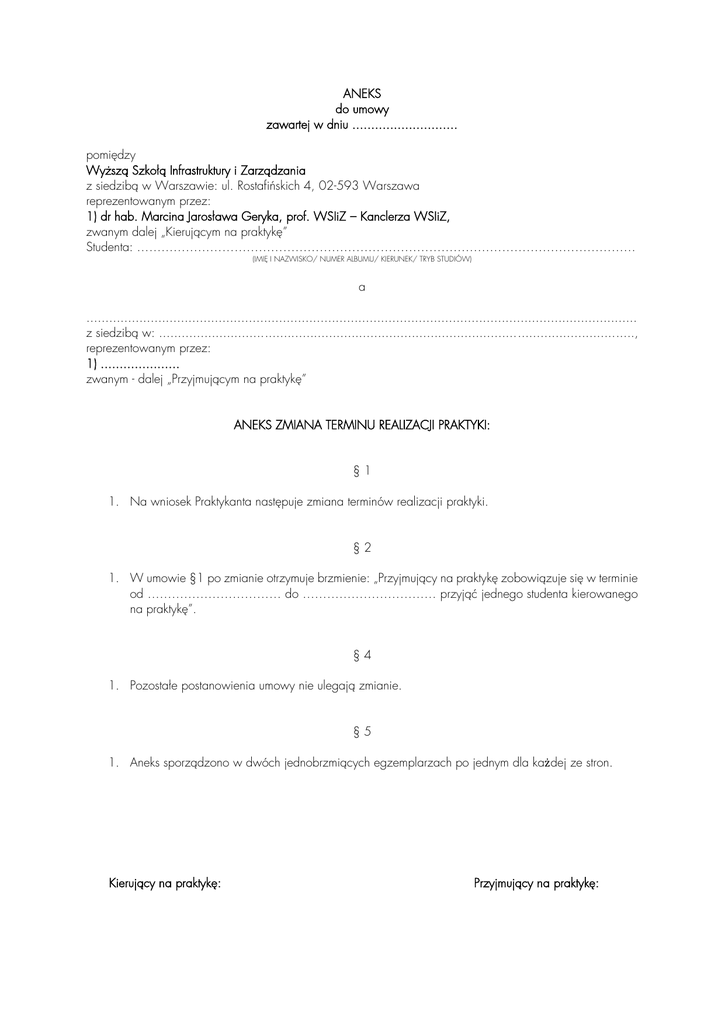 ANEKS do umowy zawartej w dniu ............................ pomiędzy Wyższą Szkołą Infrastruktury i Zarządzania z siedzibą w Warszawie: ul. Rostafińskich 4, 02-593 Warszawa reprezentowanym przez: 1) dr hab. Marcina Jarosława Geryka, prof. WSIiZ – Kanclerza WSIiZ, zwanym dalej „Kierującym na praktykę” Studenta: …………………………………………………………………………………………………………… (IMIĘ I NAZWISKO/ NUMER ALBUMU/ KIERUNEK/ TRYB STUDIÓW) a .................................................................................................................................................. z siedzibą w: .............................................................................................................................., reprezentowanym przez: 1) ..................... zwanym - dalej „Przyjmującym na praktykę” ANEKS ZMIANA TERMINU REALIZACJI PRAKTYKI: §1 1. Na wniosek Praktykanta następuje zmiana terminów realizacji praktyki. §2 1. W umowie §1 po zmianie otrzymuje brzmienie: „Przyjmujący na praktykę zobowiązuje się w terminie od …………………………… do …………………………… przyjąć jednego studenta kierowanego na praktykę”. §4 1. Pozostałe postanowienia umowy nie ulegają zmianie. §5 1. Aneks sporządzono w dwóch jednobrzmiących egzemplarzach po jednym dla każdej ze stron. Kierujący na praktykę: Przyjmujący na praktykę:
