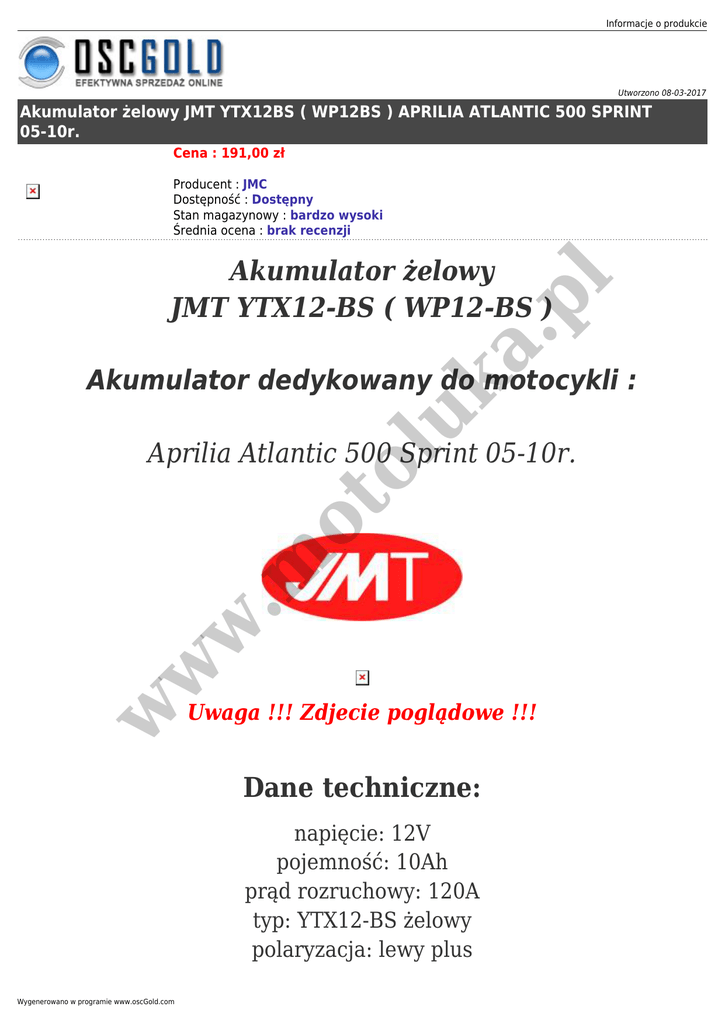 Informacje o produkcie Utworzono 08-03-2017 Akumulator żelowy JMT YTX12BS ( WP12BS ) APRILIA ATLANTIC 500 SPRINT 05-10r. Cena : 191,00 zł Producent : JMC Dostępność : Dostępny Stan magazynowy : bardzo wysoki Średnia ocena : brak recenzji a. pl Akumulator żelowy JMT YTX12-BS ( WP12-BS ) uk Akumulator dedykowany do motocykli : w w w .m ot ol Aprilia Atlantic 500 Sprint 05-10r. Uwaga !!! Zdjecie poglądowe !!! Dane techniczne: napięcie: 12V pojemność: 10Ah prąd rozruchowy: 120A typ: YTX12-BS żelowy polaryzacja: lewy plus Wygenerowano w programie www.oscGold.com w w w .m ot ol uk a. pl wymiary: 152x87x131 mm (szerokość/głębokość/wysokość) waga: 3.90 kg