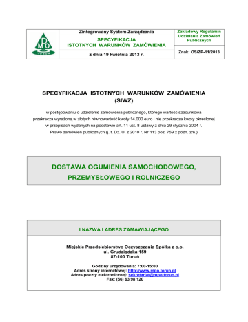 Zintegrowany System Zarządzania SPECYFIKACJA ISTOTNYCH WARUNKÓW ZAMÓWIENIA z dnia 19 kwietnia 2013 r. Zakładowy Regulamin Udzielania Zamówień Publicznych Znak: OS/ZP-11/2013 SPECYFIKACJA ISTOTNYCH WARUNKÓW ZAMÓWIENIA (SIWZ) w postępowaniu o udzielenie zamówienia publicznego, którego wartość szacunkowa przekracza wyrażoną w złotych równowartość kwoty 14.000 euro i nie przekracza kwoty określonej w przepisach wydanych na podstawie art. 11 ust. 8 ustawy z dnia 29 stycznia 2004 r. Prawo zamówień publicznych (j. t. Dz. U. z 2010 r. Nr 113 poz. 759 z późn. zm.) DOSTAWA OGUMIENIA SAMOCHODOWEGO, PRZEMYSŁOWEGO I ROLNICZEGO I NAZWA I ADRES ZAMAWIAJĄCEGO Miejskie Przedsiębiorstwo Oczyszczania Spółka z o.o. ul. Grudziądzka 159 87-100 Toruń Godziny urzędowania: 7:00-15:00 Adres strony internetowej: http://www.mpo.torun.pl Adres poczty elektronicznej: [email protected] Fax: (56) 63 98 120 II Tryb udzielenia zamówienia Postępowanie o udzielenie niniejszego zamówienia publicznego prowadzone jest w trybie przetargu nieograniczonego na podstawie ustawy z dnia 29 stycznia 2004r. Prawo zamówień publicznych (j. t. Dz. U. z 2010 r. Nr 113, poz. 759 z późn. zm.) zwanej dalej „ustawą”. III Opis przedmiotu zamówienia 1. Przedmiotem zamówienia jest sukcesywna dostawa ogumienia samochodowego, przemysłowego i rolniczego dla Miejskiego Przedsiębiorstwa Oczyszczania Sp. z o.o. w Toruniu w następujących ilościach szacunkowych: - opony bezdętkowe radialne samochodowe – 127 szt.; - opony dętkowe radialne samochodowe – 45 szt.; - opony dętkowe ciągnikowe, rolnicze, przemysłowe – 35 szt.; - dętki samochodowe, ciągnikowe i do przyczep – 55 szt.; - ochraniacze dętek – 30 szt. Kod określony we Wspólnym Słowniku Zamówień CPV: 34.35.21.00-0 – Opony do samochodów ciężarowych, 34.35.23.00-2 – Opony do maszyn rolniczych, 19.51.12.00–3 - Dętki, 19.51.11.00-2 – Ochraniacze opon. 2. Opony, dętki i ochraniacze muszą być wyprodukowane nie wcześniej niż w 2011 roku. 3. Opony bieżnikowane muszą posiadać homologacje wydane zgodnie z obowiązującymi przepisami oraz certyfikat zgodności z Regulaminem EKG ONZ, a także certyfikat uprawniający do oznaczania wyrobu znakiem bezpieczeństwa wystawionym przez Polskie Centrum Badań i Certyfikacji. 4. Zamawiający dopuszcza zaoferowanie opon równoważnych dla pozycji Formularza oferty, gdzie podana jest marka opony wraz z rodzajem bieżnika. Pod pojęciem „opon równoważnych” Zamawiający rozumie takie, które zgodnie z Rozporządzeniem Ministra Infrastruktury z dnia 31 grudnia 2002 r. w sprawie warunków technicznych pojazdów oraz zakresu ich niezbędnego wyposażenia (Dz.U. z 2003, Nr 32, poz. 262 z późniejszymi zmianami) mogą być zastosowane na jednej osi z oponami podanymi w opisie przedmiotu zamówienia. W przypadku, gdy Wykonawca powołuje się na rozwiązania równoważne oraz w przypadku wątpliwości Zamawiającego, co do spełnienia warunków równoważności, ciężar udowodnienia równoważności spoczywa na Wykonawcy. 5. Wymagany okres gwarancji na przedmiot dostarczony w ramach zamówienia minimum 24 miesiące, licząc od dnia dostarczenia przedmiotu zamówienia i odbioru ilościowo-jakościowego. 6. Wykonawca zobowiązany jest do bezpłatnego odbioru złomu gumowego z opon. 7. Zamawiający nie dopuszcza możliwości składania ofert częściowych 8. Zamawiający nie dopuszcza możliwości złożenia oferty wariantowej. 9. Zamawiający nie przewiduje udzielenia zamówień uzupełniających, o których mowa w art. 67 ust.1 pkt 7 ustawy. IV Termin wykonania zamówienia Realizacja zamówienia odbywać się będzie przez 6 miesięcy od dnia zawarcia umowy. V Opis warunków udziału w postępowaniu oraz opis sposobu dokonywania oceny spełniania tych warunków 1. O udzielenie zamówienia publicznego mogą ubiegać się Wykonawcy, którzy: 1) spełniają warunki udziału w postępowaniu, o których mowa w art. 22 ust. 1 ustawy, 2) nie podlegają wykluczeniu na podstawie art. 24 ust. 1 i ust. 2 pkt 5 ustawy. 2. Wykonawca jest zobowiązany wykazać nie później niż na dzień składania ofert, spełnienie warunków, o których mowa w art. 22 ust. 1 ustawy i brak podstaw do wykluczenia z powodu nie spełniania warunków, o których mowa w art. art. 24 ust. 1 i ust. 2 pkt 5 ustawy. 3. Wykonawcy mogą wspólnie ubiegać się o udzielenie zamówienia. Przepisy art. 23 ustawy i zapisy SIWZ dotyczące Wykonawcy stosuje się odpowiednio do Wykonawców wspólnie ubiegających się o udzielenie zamówienia. W takim przypadku Wykonawcy ustanawiają pełnomocnika do reprezentowania ich w postępowaniu o udzielenie zamówienia albo reprezentowania w postępowaniu i zawarcia umowy w sprawie zamówienia publicznego. Wykonawcy wspólnie ubiegający się o udzielenie niniejszego zamówienia ponoszą solidarną odpowiedzialność za niewykonanie lub nienależyte wykonanie zamówienia. 4. W przypadku wspólnego ubiegania się o udzielenie niniejszego zamówienia warunki określone w pkt V.1 ppkt 1) muszą być spełnione łącznie przez Wykonawców wspólnie ubiegających się o udzielenie zamówienia, natomiast warunek nie podlegania wykluczeniu z postępowania, o którym mowa w V.1 ppkt. 2) musi być spełniony przez każdego z Wykonawców wspólnie ubiegających się o udzielenie zamówienia. 5. Zamawiający wezwie Wykonawców, którzy w określonym terminie nie złożyli oświadczeń i dokumentów potwierdzających spełnianie warunków udziału w postępowaniu, lub którzy nie złożyli pełnomocnictw, albo którzy złożyli wymagane przez Zamawiającego oświadczenia i dokumenty zawierające błędy lub którzy złożyli wadliwe pełnomocnictwa, do ich złożenia w wyznaczonym terminie, chyba że mimo ich złożenia oferta Wykonawcy podlega odrzuceniu albo konieczne byłoby unieważnienie postępowania. Złożone na wezwanie Zamawiającego oświadczenia i dokumenty powinny potwierdzać spełnian