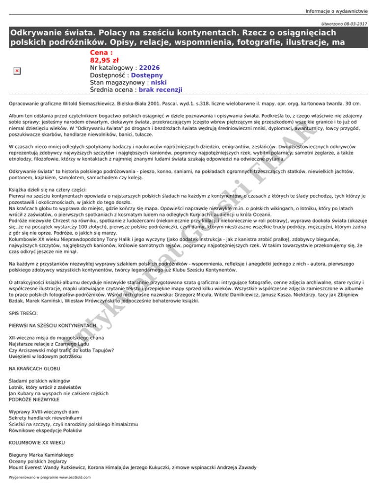 Informacje o wydawnictwie Utworzono 08-03-2017 Odkrywanie świata. Polacy na sześciu kontynentach. Rzecz o osiągnięciach polskich podróżników. Opisy, relacje, wspomnienia, fotografie, ilustracje, ma Cena : 82,95 zł Nr katalogowy : 22026 Dostępność : Dostępny Stan magazynowy : niski Średnia ocena : brak recenzji Opracowanie graficzne Witold Siemaszkiewicz. Bielsko-Biała 2001. Pascal. wyd.1. s.318. liczne wielobarwne il. mapy. opr. oryg. kartonowa twarda. 30 cm. LA R Album ten odsłania przed czytelnikiem bogactwo polskich osiągnięć w dziele poznawania i opisywania świata. Podkreśla to, z czego właściwie nie zdajemy sobie sprawy: jesteśmy narodem otwartym, ciekawym świata, przekraczającym (często wbrew piętrzącym się przeszkodom) wszelkie granice i to już od niemal dziesięciu wieków. W "Odkrywaniu świata" po drogach i bezdrożach świata wędrują średniowieczni mnisi, dyplomaci, awanturnicy, łowcy przygód, poszukiwacze skarbów, handlarze niewolników, banici, tułacze. FI W czasach nieco mniej odległych spotykamy badaczy i naukowców najróżniejszych dziedzin, emigrantów, zesłańców. Dwudziestowiecznych odkrywców reprezentują zdobywcy najwyższych szczytów i najgłębszych kanionów, pogromcy najpotężniejszych rzek, wybitni polarnicy, samotni żeglarze, a także etnolodzy, filozofowie, którzy w kontaktach z najmniej znanymi ludami świata szukają odpowiedzi na odwieczne pytania. Odkrywanie świata" to historia polskiego podróżowania - pieszo, konno, saniami, na pokładach ogromnych trzeszczących statków, niewielkich jachtów, pontonem, kajakiem, samolotem, samochodem czy koleją. ar ia t G ór sk i Książka dzieli się na cztery części: Pierwsi na sześciu kontynentach opowiada o najstarszych polskich śladach na każdym z kontynentów, o czasach z których te ślady pochodzą, tych którzy je pozostawili i okolicznościach, w jakich do tego doszło. Na krańcach globu to wyprawa do miejsc, gdzie kończy się mapa. Opowieści naprawdę niezwykłe m.in. o polskich wikingach, o lotniku, który po latach wrócił z zaświatów, o pierwszych spotkaniach z kosmatym ludem na odległych Kurylach i audiencji u króla Oceanii. Podróże niezwykłe Chrzest na równiku, spotkanie z ludożercami (niekoniecznie przy kolacji i niekoniecznie w roli potrawy), wyprawa dookoła świata (okazuje się, że na początek wystarczy 100 złotych), pierwsze polskie podróżniczki, czyli damy, którym niestraszne wszelkie trudy podróży, mężczyźni, którym żadna z gór się nie oprze. Podróże, o jakich się marzy. Kolumbowie XX wieku Nieprawdopodobny Tony Halik i jego wyczyny (jako dodatek instrukcja - jak z kanistra zrobić pralkę), zdobywcy biegunów, najwyższych szczytów, najgłębszych kanionów, królowie samotnych rejsów, pogromcy najpotężniejszych rzek. W takim towarzystwie przekonujemy się, że czas odkryć jeszcze nie minął. Na każdym z przystanków niezwykłej wyprawy szlakiem polskich podróżników - wspomnienia, refleksje i anegdotki jednego z nich - autora, pierwszego polskiego zdobywcy wszystkich kontynentów, twórcy legendarnego już Klubu Sześciu Kontynentów. ty k w O atrakcyjności książki-albumu decyduje niezwykle starannie przygotowana szata graficzna: intrygujące fotografie, cenne zdjęcia archiwalne, stare ryciny i współczesne ilustracje, mapki ułatwiające czytanie tekstu i przepiękne mapy sprzed kilku wieków. Wszystkie współczesne zdjęcia zamieszczone w albumie to prace polskich fotografów-podróżników. Wśród nich głośne nazwiska: Grzegorz Micuła, Witold Danilkiewicz, Janusz Kasza. Niektórzy, tacy jak Zbigniew Bzdak, Marek Kamiński, Wiesław Mrówczyński to jednocześnie bohaterowie książki. SPIS TREŚCI: An PIERWSI NA SZEŚCIU KONTYNENTACH XII-wieczna misja do mongolskiego chana Najstarsze relacje z Czarnego Lądu Czy Arciszewski mógł trafić do kotła Tapujów? Uwięzieni w lodowym potrzasku NA KRAŃCACH GLOBU Śladami polskich wikingów Lotnik, który wrócił z zaświatów Jan Kubary na wyspach nie całkiem rajskich PODRÓŻE NIEZWYKŁE Wyprawy XVIII-wiecznych dam Sekrety handlarek niewolnikami Ścieżki na szczyty, czyli narodziny polskiego himalaizmu Równikowe ekspedycje Polaków KOLUMBOWIE XX WIEKU Bieguny Marka Kamińskiego Oceany polskich żeglarzy Mount Everest Wandy Rutkiewicz, Korona Himalajów Jerzego Kukuczki, zimowe wspinaczki Andrzeja Zawady Wygenerowano w programie www.oscGold.com Szalone wyprawy Tony`ego Halika Polscy rekordziści: Krystyna Chojnowska-Liskiewicz, Andrzej Urbańczyk, zdobywcy kanionu Colca Piotr Chmieliński w nurtach Amazonki Dostępne opcje Odkrywanie świata. Polacy na sześciu kontynentach. Rzecz o osiągnięciach polskich podróżników. Opisy, relacje, wspomnienia, fotografie, ilustracje, ma An ty k w ar ia t G ór sk i FI LA R Zweryfikowane: Tak. Obszar: inne. Wydawnictwo zwarte: Tak.