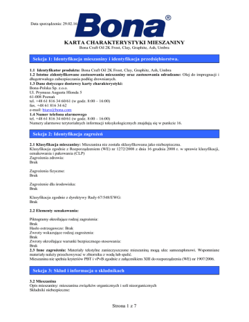 Data sporządzenia: 29.02.16 KARTA CHARAKTERYSTYKI MIESZANINY Bona Craft Oil 2K Frost, Clay, Graphite, Ash, Umbra Sekcja 1: Identyfikacja mieszaniny i identyfikacja przedsiębiorstwa. 1.1 Identyfikator produktu: Bona Craft Oil 2K Frost, Clay, Graphite, Ash, Umbra 1.2 Istotne zidentyfikowane zastosowania mieszaniny oraz zastosowania odradzane: Olej do impregnacji i długotrwałego zabezpieczania podłóg drewnianych. 1.3 Dane dotyczące dostawcy karty charakterystyki: Bona-Polska Sp. z.o.o. Ul. Prymasa Augusta Hlonda 5 61-008 Poznań tel. +48 61 816 34 60/61 (w godz. 8:00 – 16:00) fax. +48 61 816 34 62 e-mail: [email protected] 1.4 Numer telefonu alarmowego tel. +48 61 816 34 60/61 (w godz. 8:00 – 16:00) Numery alarmowe terytorialnych informacji toksykologicznych znajdują się w punkcie 16. Sekcja 2: Identyfikacja zagrożeń 2.1 Klasyfikacja mieszaniny: Mieszanina nie została sklasyfikowana jako niebezpieczna. Klasyfikacja zgodnie z Rozporządzeniem (WE) nr 1272/2008 z dnia 16 grudnia 2008 r. w sprawie klasyfikacji, oznakowania i pakowania (CLP) Zagrożenia zdrowia: Brak Zagrożenia fizyczne: Brak Zagrożenie dla środowiska: Brak Klasyfikacja zgodnie z dyrektywy Rady 67/548/EWG: Brak 2.2 Elementy oznakowania: Piktogramy określające rodzaj zagrożenia: Brak Hasło ostrzegawcze: Brak Zwroty wskazujące rodzaj zagrożenia: Brak Zwroty określające warunki bezpiecznego stosowania: Brak 2.3 Inne zagrożenia: Materiały tekstylne zanieczyszczone mieszaniną mogą ulec samozapłonowi. Wspomniane materiały należy przechowywać w zbiorniku z wodą lub spalić. Mieszanina nie spełnia kryteriów PBT i vPvB zgodnie z załącznikiem XIII do rozporządzenia (WE) nr 1907/2006. Sekcja 3: Skład i informacja o składnikach 3.2 Mieszanina Opis mieszaniny: mieszanina związków organicznych i soli nieorganicznych Składniki niebezpieczne: Strona 1 z 7 Data sporządzenia: 29.02.16 KARTA CHARAKTERYSTYKI MIESZANINY Bona Craft Oil 2K Frost, Clay, Graphite, Ash, Umbra Nazwa Numery Numery rejestr. REACH: benzyna ciężka obrabiana wodorem CAS: 64742-48-9 01-2119486659-16-xxxx WE: 265-150-3 Sole kwasu fosforowego CAS: Brak WE: Brak - Klasyfikacja 1272/2008 Asp. Tox. 1, H304 EUH 066 Flam. Liq. 2, H225 Eye Irrit. 2; H319 Skin Irrit. 2, H315 % wag 1–3 1–3 Pełna treść przytoczonych zwrotów wskazujących rodzaj zagrożenia znajduje się w rozdziale 16. Sekcja 4: Środki pierwszej pomocy 4.1 Opis środków pierwszej pomocy Drogi narażenia: przez drogi oddechowe, przez kontakt ze skórą, z oczami oraz przez przewód pokarmowy. W przypadku wdychania: W razie zawrotów głowy lub nudności wyprowadzić poszkodowanego na świeże powietrze, w razie braku szybkiej poprawy zasięgnąć porady lekarza. W przypadku kontaktu ze skórą: Zdjąć zanieczyszczoną odzież. Umyć skórę wodą z mydłem. W przypadku trwałego podrażnienia skóry zwrócić się do lekarza. W przypadku kontaktu z oczami: Usunąć szkła kontaktowe. Płukać oczy z otwartą powieką przez kilka minut dużą ilością wody. W przypadku utrzymującej się dolegliwości zasięgnąć porady lekarza. W przypadku połknięcia: Nie powodować wymiotów. Przepłukać jamę ustną i wypić dużą ilość wody. W przypadku utrzymującej się dolegliwości zasięgnąć porady lekarza. 4.2 Najważniejsze ostre i opóźnione objawy oraz skutki narażenia Brak. 4.3. Wskazania dotyczące wszelkiej natychmiastowej pomocy lekarskiej i szczególnego postępowania z poszkodowanym O sposobie postępowania decyduje lekarz po ocenie stanu poszkodowanego. Sekcja 5: Postępowanie w przypadku pożaru 5.1. Środki gaśnicze Właściwe środki gaśnicze: Dwutlenek węgla, piana, proszek lub strumień wody. Środki gaśnicze, których nie wolno używać: Strumień wody pod wysokim ciśnieniem. 5.2. Szczególne zagrożenia związane z mieszaniną Mieszanina jest palna. W wyniku działania podwyższonej temperatury mogą wydzielać się szkodliwe gazy. Materiały tekstylne zanieczyszczone mieszaniną mogą ulec samozapłonowi. Wspomniane materiały należy przechowywać w zbiorniku z wodą lub spalić. 5.3. Informacje dla straży pożarnej Podczas gaszenia pożaru stosować urządzenia oddechowe z własnym obiegiem powietrza i odzież ochronną na całą sylwetkę. Sekcja 6: Postępowanie w przypadku niezamierzonego uwolnienia do środowiska 6.1 Indywidualne środki ostrożności, wyposażenie ochronne i procedury w sytuacjach awaryjnych Unikać kontaktu ze skórą. Nie wdychać par. Stosować rękawice ochronne z kauczuku butylowego, gumy nitrylowej lub neoprenu. Jeśli zachodzi potrzeba likwidacji szkód należy nałożyć odzież ochronną gazoszczelną i aparat izolujący drogi oddechowe. 6.2 Środki ostrożności w zakresie ochrony środowiska Strona 2 z 7 Data sporządzenia: 29.02.16 KARTA CHARAKTERYSTYKI MIESZANINY Bona Craft Oil 2K Frost, Clay, Graphite, Ash, Umbra Zapobiegać rozprzestrzenianiu się oraz przedostaniu do kanalizacji i zbiorników wodnych. Powstrzymać lub absorbować wyciekającą ciecz piaskiem, ziemią lub innymi odpowiednimi materiałami. Jeśli substancja dostała się do zbiornika wody, kanału lub została rozlana na glebę oraz roślinność, zawiadomić straż pożarną. 6.3 Metody i materiały zapobiegające rozprzestrzenianiu się skażenia i służące do usuwania skażenia Preparat zebrać mechanicznie. Zebrać materiałami pochłaniającymi ciecze (np. piasek, ziemia, uniwersalne substancje wiążące, krzemionka, trociny, itp.). Usuwaniem powinny zająć się specjalistyczne służby – straż pożarna. 6.4 Odniesienia do innych sekcji Środki ochrony osobistej – sekcja 8. Postępowanie z odpadami – sekcja 13. Sekcja 7: Postępowanie z mieszaniną i jej magazynowanie 7.1 Środki ostrożności dotyczące bezpiecznego postępowania Stosować powszechnie obowiązujące zasady obchodzenia się z chemikaliami. Zabrudzone środkiem ubranie natychmiast zdjąć. Nie wdychać par, unikać bezpośredniego kontaktu ze skórą
