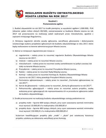 Załącznik do Zarządzenie Nr 51 /2017 Prezydenta Miasta Leszna z dnia 8.02.2017r. REGULAMIN BUDŻETU OBYWATELSKIEGO MIASTA LESZNA NA ROK 2017 Rozdział 1 Postanowienia ogólne 1. Budżet obywatelski na rok 2017 to środki pieniężne, w wysokości ogółem 1.000.000,- PLN (słownie: jeden milion złotych 00/100), zarezerwowane w budżecie Miasta Leszna na rok 2017 rok przeznaczone na realizację zadań wybranych przez mieszkańców, zgodnie z zapisami niniejszego Regulaminu. 2. Niniejszy regulamin określa zasady zgłaszania, weryfikacji, głosowania i dokonywania ostatecznego wyboru projektów zgłoszonych do budżetu obywatelskiego w roku 2017, które będą realizowane na terenie administracyjnym Miasta Leszna. 3. Ilekroć w niniejszym regulaminie jest mowa o: a) regulaminie – należy przez to rozumieć regulamin Budżetu Obywatelskiego Miasta b) c) d) e) f) g) h) i) Leszna na rok 2017; mieście – należy przez to rozumieć Miasto Leszno; mieszkańcach – należy przez to rozumieć osoby zameldowane na pobyt czasowy lub stały na terenie Miasta Leszna; Prezydencie – należy przez to rozumieć Prezydenta Miasta Leszna; Radzie – należy przez to rozumieć Radę Miejską Leszna; Komisji – należy przez to rozumieć Komisję ds. Budżetu Obywatelskiego Miasta Leszna na rok 2017, którą powołuje Prezydent Miasta Leszna; Formularzu zgłoszeniowym – należy przez to rozumieć „Formularz zgłoszeniowy na rok 2017”; Karcie do głosowania – należy przez to rozumieć „Kartę do głosowania na rok 2017”; Pełnomocniku zgłaszających – należy przez to rozumieć autora projektu, osobę wskazaną przez zgłaszających do reprezentowania ich w procedurze zgłaszania zadań do budżetu obywatelskiego; 3. Środki przeznaczone na realizację budżetu obywatelskiego zostają podzielone na: a) projekty małe – łącznie 600 tysięcy złotych, przy czym szacowana wartość minimalna musi wynosić 10.000,00 zł a maksymalna 150.000,00 zł b) projekty duże – łącznie 400 tysięcy złotych, przy czym szacowana wartość minimalna musi wynosić 150.000,01 zł a maksymalna 400.000,00 zł kryterium kwalifikującym projekty jako „małe” i „duże” jest ostateczny kosztorys projektu ustalony po dokonaniu weryfikacji przez Komisję. 1|Strona 4. Ze środków budżetu obywatelskiego finansowe są zadania zgłaszane przez mieszkańców miasta Leszna, należące do zadań własnych gminy lub zadań własnych powiatu, zgodnie z zasadami określonymi w niniejszym regulaminie. 5. Na etapie zgłaszania i popierania projektów oraz głosowania, uprawnionymi do uczestnictwa w procesie budżetu obywatelskiego są mieszkańcy Leszna, który ukończyli 18 rok życia w momencie zgłaszania, popierania projektów lub głosowania. 6. Realizacja projektów w ramach budżetu obywatelskiego odbywa się w ciągu jednego roku budżetowego przy czym, w uzasadnionych przypadkach możliwe jest wydłużenie realizacji zadania inwestycyjnego lub bieżącego na lata następne, na zasadach określonych ustawą o finansach publicznych (instytucja wydatków niewygasających z końcem roku budżetowego). 7. Administratorem danych osobowych zebranych podczas realizacji budżetu obywatelskiego, zarówno osób zgłaszających projekty, popierających je, a także biorących udział w głosowaniu jest Prezydent Miasta Leszna. Dane te będą przetwarzane wyłącznie w celu realizacji budżetu obywatelskiego. Każdemu przysługuje prawo wglądu w jego dane osobowe, a podanie ich jest dobrowolne, jednak niezbędne dla udziału w procesie realizacji budżetu obywatelskiego. Rozdział 2 Zgłaszanie projektów 1. Każdy uprawniony mieszkaniec może zgłosić w ramach budżetu obywatelskiego dowolną liczbę projektów zadań publicznych, złożoną wyłącznie na formularzu zgłoszeniowym którego wzór stanowi załącznik nr 1 niniejszego regulaminu. 2. Złożony formularz uznaje się za ważny, jeśli: 1) zostaną wypełnione czytelnie wszystkie pola obowiązkowe (nazwa projektu /maksymalnie 25 słów/, proponowana lokalizacja, szacunkowy koszt projektu, opis projektu i niezbędne zadania lub inwestycje do realizacji projektu /maksymalnie 150 słów/, uzasadnienie do realizacji projektu, w którym zostanie podany sposób, jak realizacja zadania efektywnie wpłynie pozytywnie na społeczność miasta Leszna /maksymalnie 150 słów/; 2) pod formularzem złożone zostanie minimum 20 podpisów osób uprawnionych zawierających dane osoby popierającej projekt (imię, nazwisko, adres miejsca zamieszkania, PESEL) wraz z czytelnym podpisem. 3) zostanie dostarczony w sposób i terminie wskazanym w pkt.4. 3. Wzór formularza stanowi załącznik nr 1 do niniejszego regulaminu oraz jest dostępny na stronie internetowej pod adresem www.budzetobywatelski.leszno.pl oraz w punkcie obsługi interesantów Urzędu Miasta Leszna przy ul. Kazimierza Karasia 15 w Lesznie. 2|Strona 4. Wypełniony formularz zgłoszeniowy należy dostarczyć w terminie, od dnia 13 lutego 2017 roku do dnia 27 lutego 2017 roku: a) listownie — na adres Urzędu Miasta Leszna, 64-100 Leszno, ul. Karasia 15 z dopiskiem na kopercie „Budżet obywatelski 2017” (liczy się data stempla pocztowego) b) pocztą elektroniczną – poprzez wysłanie skanu wypełnionego formularza zgłoszeniowego na adres: [email protected] wyłącznie w formacie PDF. Z nadaniem tytułu wiadomości: „Budżet obywatelski 2017”. W przypadku wybrania tej formy wymagane jest dostarczenie oryginału formularza zgłoszeniowego do dnia 3.03.2017r. do punktu obsługi interesantów w Urzędzie Miasta Leszna przy ulicy Kazimierza Karasia 15 w Lesznie w zamkniętej kopercie, opisanej „Budżet obywatelski 2017”, lub c) złożyć osobiście w zamkniętej kopercie opisanej „Budżet obywatelski 2017” — w punkcie obsługi interesantów Urzędu Miasta Leszna przy ulicy Kazimierza Karasia 15 w Lesznie Formularze przekazane do Urzędu Miasta po 27 lutego 2017 roku nie będą proc