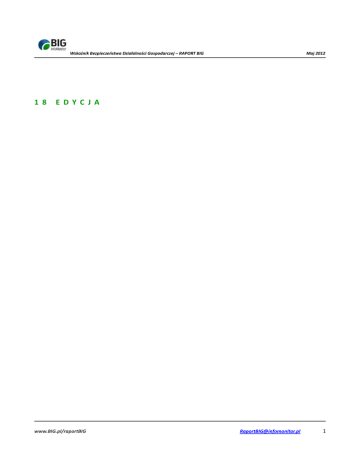 Wskaźnik Bezpieczeństwa Działalności Gospodarczej – RAPORT BIG 1 8 Maj 2012 E DYC J A www.BIG.pl/raportBIG [email protected] 1 Wskaźnik Bezpieczeństwa Działalności Gospodarczej – RAPORT BIG Maj 2012 Spis treści Spis treści.................................................................................................................................................................2 Wstęp.......................................................................................................................................................................3 Badanie – wskaźnik BIG.............................................................................................................................................4 Najważniejsze liczby.................................................................................................................................................. 5 Wskaźnik Bezpieczeństwa Działalności Gospodarczej (BIG) ..........................................................................................6 Wskaźnik BIG w poszczególnych sektorach (1/2) ........................................................................................................7 Wskaźnik BIG w poszczególnych sektorach (2/2).........................................................................................................8 Nieterminowe płatności, a prowadzenie firm w Polsce .................................................................................................9 Nieterminowe płatności częstym problemem? ...........................................................................................................10 Zdolność kontrahentów do regulowania bieżących zobowiązań................................................................................... 11 Udział należności płaconych w terminie.....................................................................................................................12 Szacunkowy poziom przeterminowanych należności...................................................................................................13 Sens organizacji mistrzostw Euro 2012 w Polsce........................................................................................................14 Wpływ ekspresowego tempa realizacji inwestycji na zatory płatnicze.......................................................................... 15 Zmiana zamówień produktów i usług w trakcie Euro 2012..........................................................................................16 Wpływ organizacji Euro 2012 na zatory płatnicze.......................................................................................................17 Wpływ Euro 2012 na liczbę turystów.........................................................................................................................18 www.BIG.pl/raportBIG [email protected] 2 Wskaźnik Bezpieczeństwa Działalności Gospodarczej – RAPORT BIG Maj 2012 Wstęp Szanowni Państwo, Przedstawiamy 18. edycję cyklicznego Raportu BIG o nastrojach wśród polskich przedsiębiorców. Po raz drugi podajemy wyniki badań w rozszerzonej grupie firm, wśród sześciu branży (wcześniej trzech): dostawców usług finansowych, dostawców usług masowych, branży budowlanej, branży turystycznej, branży e-commerce i przedsiębiorców. Podobnie jak w każdym raporcie przygotowaliśmy specjalny zestaw pytań dedykowany jednemu zagadnieniu. Jak mogą się Państwo domyślać tym tematem jest Euro 2012. Zapytaliśmy małe i średnie firmy jak oceniają wpływ tego sportowego wydarzenia na prowadzenie działalności gospodarczej. Mimo wszechobecnych informacji o kiepskich nastrojach na rynkach finansowych i spodziewanych kolejnych falach kryzysu, nastroje polskich przedsiębiorców wyraźnie się poprawiły w porównaniu do pierwszych miesięcy tego roku. Mieliśmy pewne obawy, czy spadek wskaźników odnotowany w lutym okaże się corocznym sezonowym wahnięciem czy początkiem negatywnego trendu. Tym bardziej, że był to najniższy poziom wskaźnika BIG od 2,5 roku. Na szczęście wyniki pokazują, że sytuacja wraca do normy. Wskaźnik BIG w maju 2012 roku wyniósł 11,12 pkt. Oznacza to wzrost o 5,76 pkt. w porównaniu do lutego tego roku. Uwzględniając wszystkie badane branże, również te które po raz pierwszy ankietowaliśmy trzy miesiące temu, wskaźnik BIG dla przedstawicieli sektora usług masowych był jedynym, który nieznacznie spadł. Przedstawiciele pozostałych sektorów wyraźnie odczuli poprawę bezpieczeństwa prowadzenia działalności. Taka pozytywna jednomyślność do tej pory zdarzała się bardzo rzadko, to dobry prognostyk na kolejne miesiące. Największa zmiana w ciągu ostatnich trzech miesięcy nastąpiła wśród dostawców usług finansowych – wzrost wskaźnika BIG o 12,83 pkt. (z 5,5, pkt. do 18,33 pkt.). Specjalne miejsce w najnowszej edycji raportu poświęciliśmy mistrzostwom Euro 2012. Zapytaliśmy przedsiębiorców jak oceniają wpływ inwestycji i samej organizacji tego wydarzenia na ich działalność. Ogólnie podsumowując wyniki, polskie firmy uważają, że organizacja takich imprez ma sens, ale nie oczekują dużego wpływu Euro na ich sytuację, ani na wielkość zamówień. Co ciekawe ekspresowe tempo realizacji inwestycji, zdaniem respondentów, nie wpłynie na wielkość zatorów płatniczych, ale sama organizacja imprezy już tak i to niestety negatywnie. Dobrym prognostykiem są opinie branży turystycznej, której przedstawiciele oczekują rosnącej liczby tradycyjnych turystów zarówno w trakcie jak i po turnieju. Szczególnie zaskakujące mogą wydawać się przewidywania co do liczby odwiedzających Polskę w trakcie Euro, do tej pory raczej pojawiały się komentarze, że w tym roku tradycyjnych turystów będzie mniej, a w kolejnych więcej. Mam nadzieję, że sprawdzi się ten optymistyczny scenariusz i za trzy miesiąc