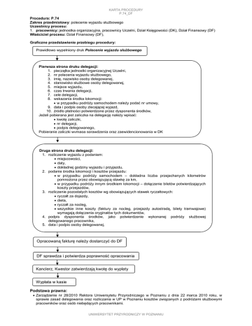 KARTA PROCEDURY P.74_DF Procedura: P.74 Zakres przedmiotowy: polecenie wyjazdu słuŜbowego Uczestnicy procesu: 1. pracownicy: jednostka organizacyjna, pracownicy Uczelni, Dział Księgowości (DK), Dział Finansowy (DF) Właściciel procesu: Dział Finansowy (DF), Graficzne przedstawienie przebiegu procedury: Prawidłowo wypełniony druk Polecenie wyjazdu słuŜbowego Pierwsza strona druku delegacji: 1. pieczątka jednostki organizacyjnej Uczelni, 2. nr polecenia wyjazdu słuŜbowego, 3. imię, nazwisko osoby delegowanej, 4. stanowisko słuŜbowe osoby delegowanej, 5. miejsce wyjazdu, 6. czas trwania delegacji, 7. cele delegacji, 8. wskazania środka lokomocji: • w przypadku podróŜy samochodem naleŜy podać nr umowy, 9. data i podpis osoby zlecającej wyjazd, 10. źródło płatności potwierdzone przez dysponenta środków, JeŜeli pobierana jest zaliczka na delegację naleŜy wpisać: • kwotę zaliczki, • nr delegacji, • podpis delegowanego, Pobieranie zaliczki wymaga sprawdzenia oraz zaewidencjonowania w DK Druga strona druku delegacji: 1. rozliczenie wyjazdu z podaniem: • miejscowości, • daty, • dokładnej godziny wyjazdu i przyjazdu, 2. podanie środka lokomocji i kosztów przejazdu: • w przypadku podróŜy samochodem – dokładna liczba przejechanych kilometrów pomnoŜona przez obowiązującą stawkę za km, • w przypadku podróŜy innym środkiem lokomocji – dołączenie biletów potwierdzających koszty przejazdów, 3. rozliczenie pozostałych kosztów wg obowiązujących stawek ryczałtowych: • ryczałt za dojazdy, • dieta, • ryczałt za nocleg, • wszystkie inne koszty (faktury za nocleg, przejazdy autostradą, bilety tramwajowe) wymagają dołączenia oryginałów tych dokumentów, 4. podpis dysponenta środków, jako potwierdzenie wykonanej podróŜy słuŜbowej delegowanego pracownika, 5. data i podpis osoby delegowanej, Opracowaną fakturę naleŜy dostarczyć do DF DF sprawdza i potwierdza poprawność opracowania Kanclerz, Kwestor zatwierdzają kwotę do wypłaty Wypłata w kasie Podstawa prawna: • Zarządzenie nr 28/2010 Rektora Uniwersytetu Przyrodniczego w Poznaniu z dnia 22 marca 2010 roku, w sprawie zasad delegowania oraz rozliczania w UP w Poznaniu kosztów związanych z podróŜami słuŜbowymi pracowników oraz osób niebędących pracownikami. UNIWERSYTET PRZYRODNICZY W POZNANIU