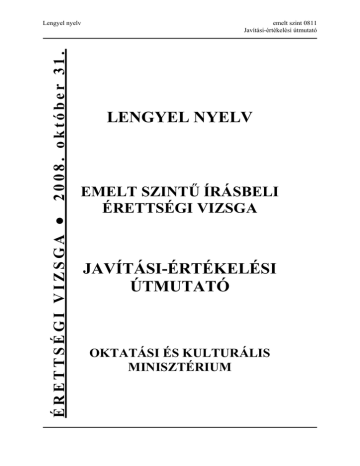 ÉRETTSÉGI VIZSGA ● 2008. október 31. Lengyel nyelv emelt szint 0811 Javítási-értékelési útmutató LENGYEL NYELV EMELT SZINTŰ ÍRÁSBELI ÉRETTSÉGI VIZSGA JAVÍTÁSI-ÉRTÉKELÉSI ÚTMUTATÓ OKTATÁSI ÉS KULTURÁLIS MINISZTÉRIUM Lengyel nyelv — emelt szint Javítási-értékelési útmutató I. Olvasott szöveg értése Ha többféle válasz is elfogadható, a javítási kulcs tartalmazza a szövegből adódó lehetséges válaszokat, illetve azokat a tartalmi elemeket, amelyeket a jó válasznak tartalmaznia kell. A feladatokat kizárólag tartalmi szempontok alapján értékeljük, azaz a nyelvtani és a helyesírási hibákat csak akkor vesszük figyelembe, ha azok a válasz érthetőségét akadályozzák. Ha több választ írt be a vizsgázó, a válasz akkor sem fogadható el, ha tartalmazza a helyes megoldást. Javításkor minden feladat végén (a lap alján) a feladatban szereplő összes kérdéshez tartozó egy-egy szürke négyzetbe, kérjük, írja be a következő kódokat: • • • 1 = jó válasz 0 = nem elfogadható válasz Ha nincs válasz, a négyzetet hagyja üresen! Például: 1. 2. 3. 1 0 1 4. A példában az első és a harmadik kérdésre helyes a válasz, a másodikra nem fogadható el a válasz, a negyedik kérdésre pedig nem válaszolt a vizsgázó. Minden feladat végén (a lap alján a kérdéseket jelölő szürke négyzetben) két külön rubrika található. Az egyikbe előre beírtuk az elérhető maximális pontszámot, a másikba, kérjük, írja be a feladatban a vizsgázó által elért összpontszámot. Például: Max. Elért 5 3 A feladatlap végén található összesítő táblázatba, kérjük, írja be a részeredményeket (az egyes feladatok eredményeit) és az elért összpontszámot. . írásbeli vizsga 0811 2 / 18 2008. október 31. Lengyel nyelv — emelt szint Javítási-értékelési útmutató I. Olvasott szöveg értése Általános útmutató Az elérhető maximális pontszám: 30. Részletes útmutató 1. feladat 0. 1. 2. 3. 4. 5. P F F F P F 2. feladat 0. D 6. G 7. A 8. I 9. L 10. N 11. K 12. C 13. F 14. M 15. H 16. J 17. E 18. B 3. feladat 0. G 19. B 20. A 21. E 22. C 23. F 24. D zbędna H 4. feladat 0. 25. 26. 27. 28. 29. 30. C D B B C A A írásbeli vizsga 0811 3 / 18 2008. október 31. Lengyel nyelv — emelt szint Javítási-értékelési útmutató II. Nyelvhelyesség A javítási útmutató tartalmazza az összes elfogadható választ. Ha a válasz helyesírási hibát tartalmaz, nem fogadható el. Ha több választ írt be a vizsgázó, a válasz akkor sem fogadható el, ha tartalmazza a helyes megoldást. A vizsgarészben szerzett pontok vizsgaponttá való átalakítása a nyelvhelyesség javítási útmutató végén található útmutató alapján történik Javításkor minden feladat végén (a lap alján) a feladatban szereplő összes kérdéshez tartozó egy-egy szürke négyzetbe, kérjük, írja be a következő kódokat: • 1 = jó válasz • 0 = nem elfogadható válasz • Ha nincs válasz, a négyzetet hagyja üresen! Például: 1. 2. 3. 1 0 1 4. A példában az első és a harmadik kérdésre helyes a válasz, a másodikra nem fogadható el a válasz, a negyedik kérdésre pedig nem válaszolt a vizsgázó. Minden feladat végén (a lap alján a kérdéseket jelölő szürke négyzetben) két külön rubrika található. Az egyikbe előre beírtuk az elérhető maximális pontszámot, a másikba, kérjük, írja be a feladatban a vizsgázó által elért összpontszámot. Például: Мax. Elért 5 3 A feladatlap végén található összesítő táblázatba, kérjük, írja be a részeredményeket (az egyes feladatok eredményeit) az elért összpontszámot, illetve a mellékelt táblázat segítségével megállapított vizsgapontokat. írásbeli vizsga 0811 4 / 18 2008. október 31. Lengyel nyelv — emelt szint Javítási-értékelési útmutató II. Nyelvhelyesség Általános útmutató 1. Az elérhető maximális vizsgapontszám: 30 pont. 2. A pontozás számítása: 36 feladatpont = 30 vizsgapont Részletes útmutató 1. feladat 0. 1. 2. 3. 4. 5. 6. znaleźć zamieszkujących charakteryzuje stosowała zachowały wniosła przywiozła 2. feladat 0. 7. 8. 9. 10. 11. 12. 13. 14. 15. 16. Miałbym Wyglądałbym zainteresowałyby zależałoby oddałbym Pomyślałabyś zmieniłbym przestałbym zająłbym zostałabyś przestaliby 3. feladat 0. przed 17. na 18. do 19. w 20. przez 21. po 22. na 23. z 4. feladat Csak akkor fogadható el jónak a megoldás, ha mind a két végződés jó. 0. 24. 25. 26. 27. 28. 29. 30. kultury masowej wielkich aglomeracjach powszechnej oświaty wyższej klasy bezproblemową konsumpcją kultury narodowej telewizji satelitarnej muzyki rozrywkowej írásbeli vizsga 0811 5 / 18 2008. október 31. Lengyel nyelv — emelt szint Javítási-értékelési útmutató 5. feladat 0. 31. 32. 33. 34. 35. 36. dźwięki ludzi czasów kulturach maszyn urządzeń źródeł A feladatpontok átszámítása vizsgapontokra: Feladatpont 36-35 34-32 31-30 29-27 26 25 24 23 22 21 20 19 18 17 16 írásbeli vizsga 0811 Vizsgapont 30 29 28 27 26 25 24 23 22 21 20 19 18 17 16 Feladatpont 15 14 13 12 11 10 9 8 7 6 5 4 3 2 1 0 6 / 18 Vizsgapont 15 14 13 12 11 10 9 8 7 6 5 4 3 2 1 0 2008. október 31. Lengyel nyelv — emelt szint Javítási-értékelési útmutató III. Hallott szöveg értése Ha többféle válasz is elfogadható, a javítási útmutató tartalmazza a szövegből adódó lehetséges válaszokat, illetve azokat a tartalmi elemeket, amelyeket a jó válasznak tartalmaznia kell. A feladatokat kizárólag tartalmi szempontok alapján értékeljük, azaz a nyelvtani és a helyesírási hibákat csak akkor vesszük figyelembe, ha azok a válasz érthetőségét akadályozzák. Ha több választ írt be a vizsgázó, a válasz akkor sem fogadható el, ha tartalmazza a helyes megoldást. A vizsgarészben szerzett pontok vizsgaponttá való átalakítása a hallott szöveg ért
