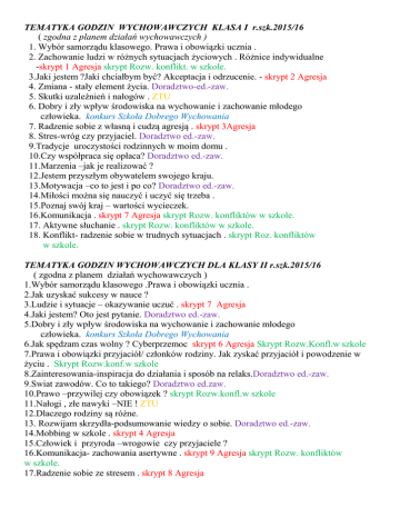 TEMATYKA GODZIN WYCHOWAWCZYCH KLASA I r.szk.2015/16 ( zgodna z planem działań wychowawczych ) 1. Wybór samorządu klasowego. Prawa i obowiązki ucznia . 2. Zachowanie ludzi w różnych sytuacjach życiowych . Różnice indywidualne -skrypt 1 Agresja skrypt Rozw. konflikt. w szkole. 3.Jaki jestem ?Jaki chciałbym być? Akceptacja i odrzucenie. - skrypt 2 Agresja 4. Zmiana - stały element życia. Doradztwo-ed.-zaw. 5. Skutki uzależnień i nałogów . ZTU 6. Dobry i zły wpływ środowiska na wychowanie i zachowanie młodego człowieka. konkurs Szkoła Dobrego Wychowania 7. Radzenie sobie z własną i cudzą agresją . skrypt 3Agresja 8. Stres-wróg czy przyjaciel. Doradztwo ed.-zaw. 9.Tradycje uroczystości rodzinnych w moim domu . 10.Czy współpraca się opłaca? Doradztwo ed.-zaw. 11.Marzenia –jak je realizować ? 12.Jestem przyszłym obywatelem swojego kraju. 13.Motywacja –co to jest i po co? Doradztwo ed.-zaw. 14.Miłości można się nauczyć i uczyć się trzeba . 15.Poznaj swój kraj – wartości wycieczek. 16.Komunikacja . skrypt 7 Agresja skrypt Rozw. konfliktów w szkole. 17. Aktywne słuchanie . skrypt Rozw. konfliktów w szkole. 18. Konflikt- radzenie sobie w trudnych sytuacjach . skrypt Roz. konfliktów w szkole. TEMATYKA GODZIN WYCHOWAWCZYCH DLA KLASY II r.szk.2015/16 ( zgodna z planem działań wychowawczych ) 1.Wybór samorządu klasowego .Prawa i obowiązki ucznia . 2.Jak uzyskać sukcesy w nauce ? 3.Ludzie i sytuacje – okazywanie uczuć . skrypt 7 Agresja 4.Jaki jestem? Oto jest pytanie. Doradztwo ed.-zaw. 5.Dobry i zły wpływ środowiska na wychowanie i zachowanie młodego człowieka. konkurs Szkoła Dobrego Wychowania 6.Jak spędzam czas wolny ? Cyberprzemoc skrypt 6 Agresja Skrypt Rozw.Konfl.w szkole 7.Prawa i obowiązki przyjaciół/ członków rodziny. Jak zyskać przyjaciół i powodzenie w życiu . Skrypt Rozw.konf.w szkole 8.Zainteresowania-inspiracja do działania i sposób na relaks.Doradztwo ed.-zaw. 9.Swiat zawodów. Co to takiego? Doradztwo ed.zaw. 10.Prawo –przywilej czy obowiązek ? skrypt Rozw.konfl.w szkole 11.Nałogi , złe nawyki –NIE ! ZTU 12.Dlaczego rodziny są różne. 13. Rozwijam skrzydła-podsumowanie wiedzy o sobie. Doradztwo ed.-zaw. 14.Mobbing w szkole . skrypt 4 Agresja 15.Człowiek i przyroda –wrogowie czy przyjaciele ? 16.Komunikacja- zachowania asertywne . skrypt 9 Agresja skrypt Rozw. konfliktów w szkole. 17.Radzenie sobie ze stresem . skrypt 8 Agresja TEMATYKA GODZIN WYCHOWAWCZYCH DLA KLASY III r.szk.2015/16 ( zgodna z planem działań wychowawczych ) 1.Prawa i obowiązki ucznia. Poznajemy i akceptujemy prawa człowieka . 2. Rola autorytetu w życiu człowieka . Autorytety rodzinne a kształtowanie się osobowości 3. Decyzje-szanse czy ograniczenia? Doradztwo ed.-zaw. 4. Dobry i zły wpływ środowiska na wychowanie i zachowanie młodego człowieka. konkurs Szkoła Dobrego Wychowania 5. Ochrona środowiska . 6. Informacja zawodowa, czyli co warto wiedzieć o zawodach? Doradztwo ed.-zaw. 7. Kultura a subkultura . Mobbing w szkole skrypt 4 Agresja 8. Przyczyny i skutki złości . Stres. skrypt 8 Agresja 9. Uzależnieniom-Nie ZTU 10.Uczę się akceptacji siebie . Cyberprzemoc skrypt 6 Agresja skrypt Rozw. konfl. w szkole 11. Krok za krokiem, czyli nie od razu Kraków zbudowano. O celach i planach edukacyjnozawodowych. Doradztwo ed.-zaw. 12. Rozwijanie umiejętności asertywnych . skrypt 9 Agresja 13.Doskonalenie umiejętności negocjacyjnych . Kompetencje emocjonalne. skrypt Rozw. konfliktów w szkole. 14. Aktywne słuchanie skrypt 7 Agresja skrypt Rozw. konfliktów w szkole. Dodatkowe godziny wychowawcze w kl.III przeznaczane będą także na próbne egzaminy gimnazjalne oraz zajęcia z doradztwa zawodowego Wykorzystane materiały edukacyjno- informacyjne. 1. Skrypty ze szkolenia Rozwiązywania agresji . 2. Skrypty ze szkolenia Rozwiązywanie konfliktów w szkole 3. Program „Rozwijam Skrzydła” – program doradztwa edukacyjno-zawodowego. 4. Konkurs Szkoła Dobrego Wychowania . 5. Kampania ogólnopolska Zachowaj Trzeźwy Umysł Opracowanie : Joanna Pallach