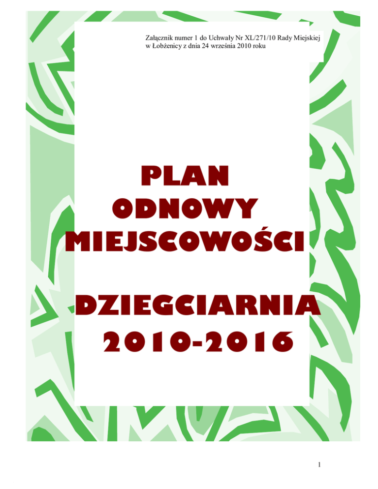 Załącznik numer 1 do Uchwały Nr XL/271/10 Rady Miejskiej w Łobżenicy z dnia 24 września 2010 roku PLAN ODNOWY MIEJSCOWOŚCI DZIEGCIARNIA 2010-2016 1 CHARAKTERYSTYKA MIEJSCOWOŚCI 3 A. B. C. D. POŁOŻENIE MIEJSCOWOŚCI, PRZYNALEŻNOŚĆ ADMNISTRACYJNA, POWIERZCHNIA LICZBA LUDNOŚCI DZIEDZICTWO HISTORYCZNE STRUKTURA PRZESTRZENNA MIEJSCOWOŚCI 3 5 7 8 II. INWENTARYZACJA ZASOBÓW SŁUŻĄCYCH ODNOWIE WSI / MIEJSCOWOŚCI 10 A. ZASOBY PRZYRODNICZE B. DZIEDZICTWO KULTUROWE C. INFRASTRUKTURA SPOŁECZNA D. INFRASTRUKTURA TECHNICZNA E. GOSPODARKA I ROLNICTWO F. KAPITAŁ SPOŁECZNY I LUDZKI 10 10 10 11 12 13 III. 15 A. B. IV. A. B. C. D. OCENA MOCNYCH I SŁABYCH STRON MIEJSCOWOŚCI MOCNE STRONY I SŁABE STRONY SZANSE I ZAGROŻENIA OPIS PLANOWANYCH ZADAŃ PRIORYTETOWE KIERUNKI ROZWOJU WYKAZ PLANOWANYCH ZADAŃ INWESTYCYJNYCH I PRZEDSIĘWZIĘĆ AKTYWIZUJĄCYCH HARMONOGRAM WDRAŻANIA PRZEDSIĘWZIĘĆ INWESTYCYJNYCH I AKTYWIZUJĄCYCH OPIS PLANOWANYCH PRZEDSIĘWZIĘĆ WRAZ Z SZACUNKOWYM KOSZTEM 15 16 18 18 20 22 24 V. OPIS I CHARAKTERYSTYKA OBSZARÓW O SZCZEGÓLNYM ZNACZENIU DLA ZASPOKOJENIA POTRZEB MIESZKAŃCÓW 26 VI. METODOLOGIA POWSTANIA DOKUMENTU 27 2 Charakterystyka miejscowości A. Położenie miejscowości, przynależność admnistracyjna, powierzchnia DZIEGCIARNIA 3 Dziegciarnia to miejscowość wchodząca w skład gminy Łobżenica, która należy do powiatu pilskiego, województwa wielkopolskiego. Dziegciarnia jest miejscowością zlokalizowaną na granicy z innymi, sąsiednimi gminami – tj. gminą Mrocza i gminą Więcbork. Sołectwo graniczy bezpośrednio z innym sołectwami gminy takimi jak: Dźwierszno Wielkie, Topola, Ferdynandowo, Dębno. Usytuowane jest na uboczu głównym ciągów komunikacyjnych gminy Łobżenica. Zlokalizowana jest przy drodze powiatowej. Cechą charakteryzującą Dziegciarnię jest zabudowa jednorodzinna z czerwonej cegły. Sołectwo zajmuje powierzchnię 967,40 ha co stanowi 5,08 % powierzchni gminy. W skład sołectwa wchodzą dwie miejscowości: Dziegciarnia i Puszczka. Puszczka powstała pod koniec XIX wieku. Obecnie jest to spokojna, cicha wieś na trasie letników z Nakła i Bydgoszczy do Gródka Krajeńskiego. Rysunek 1. Zarys zasięgu sołectwa Dziegciarnia Źródło: Opracowanie własne 4 B. Liczba ludności Dziegciarnia jest miejscowością o niskim zaludnieniu. Zamieszkuje ją 138 osób. Liczebność miejscowości w porównaniu do innych wchodzących w skład gminy Łobżenica obrazuje tabela nr 1. przedstawiająca charakterystykę procentowego ujęcia mieszkańców w poszczególnych miejscowościach gminy. Tabela 1. Struktura procentowa mieszkańców poszczególnych miejscowości w gminie Łobżenica LP 1 2 3 Miejscowość Biegodzin Chlebno Dębno 4 Dziegciarnia 5 6 7 8 9 10 11 12 13 14 15 16 18 19 20 21 22 23 24 25 26 27 28 29 30 31 32 33 RAZEM 0,14 2,33 6,92 1,35 Dziunin Dźwierszno Małe Dźwierszno Wielkie Fanianowo Ferdynandowi Izdebki Józefinowo Kościerzyn Mały Kruszki Kunowo Liszkowo Luchowo Łobżonka Młynowo Nowina Piesno Puszczka Rataje Rataje-oś.SEYDY Stebionek Szczerbin Topola Trzeboń Walentynowo Wiktorówko Witrogoszcz Witrogoszcz Kolonia Witrogoszcz Osada 1,38 2,57 2,44 1,46 1,36 1,80 0,28 3,09 2,86 2,02 6,00 6,76 0,23 0,16 0,01 2,25 0,33 3,54 0,07 0,11 2,82 1,47 1,98 1,96 4,79 2,51 1,04 2,55 100 Źródło: Dane Urzędu Miejskiego Gminy Łobżenica- stan na marzec 2008 rok Strukturę wiekową miejscowości Dziegciarnia przedstawia wykres nr 1. 5 Wykres 1. Struktura wiekowa miejscowości Dziegciarnia Procentowa struktura wiekowa mieszkańców Dziegciarni 60% 13% 9% 0-14 lat 18% 15-19 lat 20-59 lat powyżej 60 lat Źródło: Opracowanie własne na podstawie danych Urzędu Miejskiego Gminy Łobżenica Odzwierciedlenie liczebne tych wartości przedstawia tabela nr 2. Tabela 2. Liczba ludności poszczególnych miejscowościach, z uwzględnieniem struktury wiekowej powyżej 60 LP Miejscowość 0-14 lat 15-19 lat 20-59 lat RAZEM lat 1 Dziegciarnia 25 13 82 18 138 RAZEM 25 13 82 18 138 Źródło: Dane Urzędu Miejskiego Gminy Łobżenica- stan na marzec 2008 rok 6 C. Dziedzictwo historyczne W XIX wieku, w okresie zaboru pruskiego, na Krajnie następował systematyczny napływ kolonistów niemieckich, którzy przy jednocześnie malejącej liczbie Polaków, byli dominującą narodowością w wielu wsiach. Do nich należała również Dziegciarnia, która z racji że zamieszkiwała ją prawie wyłącznie ludność pochodzenia niemieckiego, nazywana była w początkach XX wieku „polską Saksonią". W XIX wieku Dziegciarnia, po niemiecku Saxaren liczyła 25 domów, zamieszkiwało ją 290 mieszkańców - 275 ewangelików, 14 katolików. Pierwsza wzmianka o tej miejscowości pojawiła się w 1491 roku. W 1578 roku była wsią szlachecką i należała do Andrzeja i Stanisława Orzelskich, a w 1773 roku do Potulickich. W latach 1565 - 1577 prawdopodobnie istniał folwark, który na skutek ubytku ludności i długotrwałego kryzysu gospodarczego wywołanego zniszczeniami wojennymi, został częściowo rozparcelowany. Natomiast w latach 1653 -1695 żyło tu 6 kmieci, a w 1766 roku folwarku już nie było, natomiast kroniki wspominają o sołtysie, który wraz z kmieciami gospodarował na 12 łanach (l łan = 17 ha). O rozwoju rzemiosła w Dziegciarni świadczy fakt, że w 1577 roku pracował tutaj młyn o 2 kołach, a w 1737 roku sołtys z Dziegciarni palił potaż. W 1773 roku, jak podają dokumenty archiwalne, w Dziegciarni istniała karczma i pracował rzemieślnik. W okresie międzywojennym wieś zamieszkana była przede wszystkim przez ludność niemiecką, która po II wojnie światowej została wysiedlona. W tym czasie tylko dwie rodziny polskie zamieszkiwały Dziegciarnię - Witowie i Walochowie. Całkowicie polska była tylko wchodząca w skład sołectwa Puszczka. Po 1945 roku w Dziegciami osiedlała się ludność napływowa z innych rejonów Polski oraz z kresów wschodnich. W roku 1954 w Dziegciami założona została 1000 spół