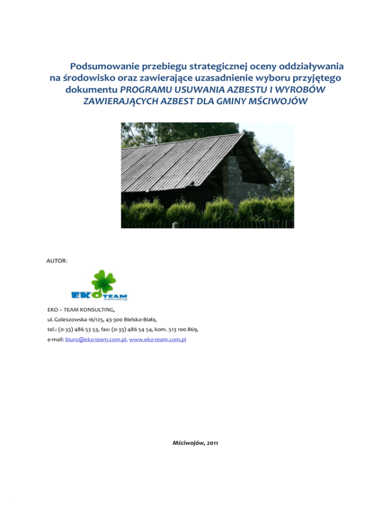 Podsumowanie przebiegu strategicznej oceny oddziaływania na środowisko oraz zawierające uzasadnienie wyboru przyjętego dokumentu PROGRAMU USUWANIA AZBESTU I WYROBÓW ZAWIERAJĄCYCH AZBEST DLA GMINY MŚCIWOJÓW AUTOR: EKO – TEAM KONSULTING, ul. Goleszowska 16/125, 43-300 Bielsko-Biała, tel.: (0-33) 486 53 53, fax: (0-33) 486 54 54, kom. 513 100 869, e-mail: [email protected], www.eko-team.com.pl Mściwojów, 2011 Podsumowanie przebiegu strategicznej oceny oddziaływania na środowisko oraz zawierające uzasadnienie wyboru przyjętego dokumentu „Programu usuwania azbestu i wyrobów zawierających azbest dla Gminy Mściwojów” Po przeprowadzeniu strategicznej oceny oddziaływania na środowisko, zgodnie z art. 55 ust. 3 ustawy z dnia 3 października 2008 r. o udostępnianiu informacji o środowisku i jego ochronie, udziale społeczeństwa w ochronie środowiska oraz o ocenach oddziaływania na środowisko (Dz. U. Nr 199, poz. 1227 z pózn. zm.), do przyjętego dokumentu „Programu usuwania azbestu i wyrobów zawierających azbest dla Gminy Mściwojów” (zwanego w dalszej części „Programem …”) dołącza się niniejsze podsumowanie. Zgodnie z art. 46 pkt. 2 w/w ustawy, wynika obowiązek przeprowadzenia strategicznej oceny oddziaływania na środowisko dla projektów, m.in. programów opracowanych lub przyjmowanych przez organy administracji, wyznaczających ramy dla późniejszej realizacji przedsięwzięć mogących znacząco oddziaływać na środowisko. Mając powyższe na względzie, Wójt wystąpił w dniu 15.09.2011 r. pismem do Regionalnego Dyrektora Ochrony Środowiska we Wrocławiu oraz Dolnośląskiego Państwowego Wojewódzkiego Inspektora Sanitarnego we Wrocławiu o określenie zakresu i stopnia szczegółowości informacji wymaganych w prognozie oddziaływania na środowisko dla projektu „Programu usuwania azbestu i wyrobów zawierających azbest dla Gminy Mściwojów”. Dolnośląski Państwowy Wojewódzki Inspektor Sanitarny we Wrocławiu w piśmie z dnia 27.09.2011 r. znak ZNS-DG-621-1218/11 uzgodnił zakres i stopień szczegółowości prognozy oddziaływania na środowisko w/w dokumentu zgodnie z wymaganiami zawartymi w art. 51 cytowanej wyżej ustawy. Regionalny Dyrektor Ochrony Środowiska we Wrocławiu pismem z dnia 13.10.2011 r. znak WSI.410.406.2011.KM odstąpił od potrzeby przeprowadzenia strategicznej oceny oddziaływania projektu Programu… Po otrzymaniu w/w uzgodnień dotyczących zakresu i stopnia szczegółowości informacji zawartych w prognozie o oddziaływaniu na środowisko dla w/w projektu dokumentu, w październiku 2011 r. przystąpiono do opracowania wymaganej przez ustawę z dnia 3 października 2008 r. (Dz. U. Nr 199, poz. 1227 z pózn. zm.), „Prognozy oddziaływania na środowisko projektu Programu usuwania azbestu i wyrobów zawierających azbest dla Gminy Mściwojów”. W dniu 17.10.2011 r. Dolnośląski Państwowy Wojewódzki Inspektor Sanitarny we Wrocławiu pismem znak:ZNS-DG-621-1330/11 zaopiniował pozytywnie Prognozę oddziaływania na środowisko projektu Programu usuwania azbestu i wyrobów zawierających azbest dla Gminy Mściwojów. Prognozę oddziaływania na środowisko, wraz z dokumentami będącymi przedmiotem oceny (tj. projektem Programu usuwania azbestu i wyrobów zawierających azbest dla Gminy Mściwojów) poddano konsultacjom społecznym Wójt Mściwojowa zapewnił udział społeczeństwa w ramach strategicznej oceny oddziaływania na środowisko projektu „Programu…”. W dniu 4.10.2011 r. Wójt poprzez obwieszczenie podał do publicznej wiadomości informację o możliwości zapoznania się z projektem „Programu usuwania azbestu i wyrobów zawierających azbest dla Gminy Mściwojów” wraz z prognozą oddziaływania na środowisko dla w/w dokumentu w ramach prowadzonej strategicznej oceny oddziaływania na środowisko. W/w obwieszczenie zostało zamieszczone na tablicy ogłoszeń oraz na stronie internetowej Urzędu Gminy Mściwojów www.bip.msciwojow.pl. Ponadto poinformowano społeczeństwo o możliwości wniesienia uwag w terminie od 04.10.2011 r. do 26.10.2011 r. Zgodnie z ustawą z dnia 3 października 2008 r. o udostępnianiu informacji o środowisku i jego ochronie, udziale społeczeństwa w ochronie środowiska oraz o ocenach oddziaływania na środowisko konsultacje społeczne trwały 21 dni. W tym czasie zainteresowani mogli zgłaszać 2 uwagi i zastrzeżenia do dokumentu. W trakcie trwania konsultacji nikt ze społeczeństwa nie wniósł uwag ani zastrzeżeń do projektu „Programu usuwania azbestu i wyrobów zawierających azbest dla Gminy Mściwojów” ani do prognozy oddziaływania na środowisko dla w/w dokumentu. Uwagi dotyczyły wprowadzenia danych ilościowych do dokumentu oraz bazy azbestowej osób prawnych tj.: • Gospodarstwo Nasienno - Rolne „Snowidza” Sp. z o.o. Celem Programu usuwania azbestu i wyrobów zawierających azbest jest: • spowodowanie oczyszczenia obszaru gminy z azbestu oraz usuniecie stosowanych od wielu lat wyrobów zawierających azbest, • wyeliminowanie negatywnych skutków zdrowotnych u mieszkańców spowodowanych azbestem oraz ustalenie koniecznych do tego uwarunkowa ń, • spowodowanie sukcesywnej likwidacji oddziaływania azbestu na środowisko i doprowadzenie w określonym horyzoncie czasowym, do spełnienia wymogów ochrony środowiska, • stworzenie odpowiednich warunków do wdrożenia przepisów prawnych oraz norm postępowania z wyrobami zawierającymi azbest. gminy Program usuwania azbestu i wyrobów zawierających azbest dla Gminy Mściwojów składa się z 11 rozdziałów. W pierwszym rozdziale, we wstępie opisano, jakie są podstawy opracowania Programu i jego założenia, w drugim rozdziale opisano cele i podstawowe plany związane z Programem, a także o powiązaniu z innymi strategicznymi dokumentami wyższych szczebli i źródła informacji zawartych w opracowaniu. W kolejnych dwóch rozdziałach przybliżono specyfikę azbes