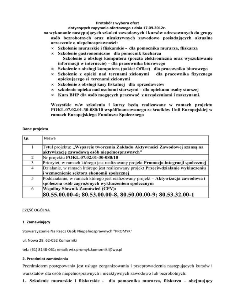 Protokół z wyboru ofert dotyczących zapytania ofertowego z dnia 17.09.2012r. na wykonanie następujących szkoleń zawodowych i kursów adresowanych do grupy osób bezrobotnych oraz nieaktywnych zawodowo posiadających aktualne orzeczenie o niepełnosprawności: • Szkolenie murarskie i fliskarskie - dla pomocnika murarza, fliskarza • Szkolenie gastronomiczne dla pomocnik kucharza Szkolenie z obsługi komputera (poczta elektroniczna oraz wyszukiwanie informacji w internecie) – dla pracownika biurowego • Szkolenie z obsługi komputera (pakiet Office) dla pracownika biurowego • Szkolenie z opieki nad terenami zielonymi dla pracownika fizycznego opiekującego si terenami zielonymi • Szkolenie z obsługi kasy fiskalnej dla sprzedawców • szkolenie opieka nad osobami starszymi – dla opiekuna osoby starszej • Kurs BHP dla osób mogących pracować z urządzeniami i maszynami. Wszystkie w/w szkolenia i kursy będą realizowane w ramach projektu POKL.07.02.01-30-080/10 współfinansowanego ze środków Unii Europejskiej w ramach Europejskiego Funduszu Społecznego Dane projektu Lp. Nazwa 1 2 3 4 5 6 Tytuł projektu: „Wsparcie tworzenia Zakładu Aktywności Zawodowej szansą na aktywizację zawodową osób niepełnosprawnych” Nr projektu POKL.07.02.01-30-080/10 Priorytet, w ramach którego jest realizowany projekt Promocja integracji społecznej Działanie, w ramach którego jest realizowany projekt Przeciwdziałanie wykluczeniu i wzmocnienie sektora ekonomii społecznej Poddziałanie, w ramach którego jest realizowany projekt – Aktywizacja zawodowa i społeczna osób zagrożonych wykluczeniem społecznym Wspólny Słownik Zamówień (CPV): 80.55.00.00-4; 80.53.00.00-8, 80.50.00.00-9; 80.53.32.00-1 CZĘŚĆ OGÓLNA 1. Zamawiający Stowarzyszenie Na Rzecz Osób Niepełnosprawnych "PROMYK" ul. Nowa 28, 62-052 Komorniki tel.: (61) 8148-061; email: [email protected] 2. Przedmiot zamówienia Przedmiotem postępowania jest usługa zorganizowania i przeprowadzenia następujących kursów i warsztatów dla osób niepełnosprawnych i nieaktywnych zawodowo lub bezrobotnych: 1. Szkolenie murarskie i fliskarskie - dla pomocnika murarza, fliskarza – obejmujący przygotowanie pracownika do wykonywania prostych czynności pomocniczych związanych z adaptowaniem i wykończeniem wnętrz – 30 godzin – zakończone wydaniem certyfikatu poświadczającego udział w szkoleniu (1 grupa - 10 osób) –podana cena powinna obejmować również zakup materiałów szkoleniowych 2. Szkolenie gastronomiczne – dla pomocnika kucharza - obejmujący przygotowanie pracownika do wykonywania prostych czynności pomocniczych związanych z pracami w kuchni (mała gastronomia) – 80 godzin – zakończone wydaniem certyfikatu poświadczającego udział w szkoleniu (2 grupy po 6 osób) –podana cena powinna obejmować również zakup materiałów szkoleniowych 3. Szkolenie z obsługi komputera (poczta elektroniczna oraz wyszukiwanie informacji w internecie) – dla pracownika biurowego - 60 godzin – zakończone wydaniem certyfikatu poświadczającego udział w szkoleniu (2 grupy po 6 osób) – firma szkoleniowa zapewni do szkolenia salę wyposażona w stanowiska komputerowe 4. Szkolenie z obsługi komputera (pakiet Office) – dla pracownika biurowego - 60 godzin – zakończone wydaniem certyfikatu poświadczającego udział w szkoleniu (2 grupy po 6 osób) – firma szkoleniowa zapewni do szkolenia salę wyposażona w stanowiska komputerowe 5. Szkolenie z opieki nad terenami zielonymi – dla pracownika fizycznego opiekującego się terenami zielonymi min 60 godzin - dla 20 osób – 2 grupy po 10 osób – zakończony wydaniem certyfikatu poświadczającego udział w szkoleniu –podana cena powinna obejmować również zakup materiałów szkoleniowych 6. Szkolenie z obsługi kasy fiskalnej – dla sprzedawców dla 10 osób – zakończony wydaniem certyfikatu poświadczającego udział w szkoleniu 7. Szkolenie dla opiekunów osób starszych – dla opiekuna osoby starszej 30 godzin zakończone wydaniem certyfikatu poświadczającego udział w szkoleniu (1 grupa 10 osób) 8. Kurs BHP – dla 20 osób zakończony wydaniem certyfikatu 3. Sposób upublicznienia zapytania ofertowego Zapytanie ofertowe zostało zamieszczone na stronie internetowej Zamawiającego www.promykkomorniki.pl, w terminie od 17.09.2012 do 01.10.2012. Zapytanie zostało wysłane listem poleconym pięciu potencjalnym Oferentom. I. CDS- LIDER Consulting&Doradztwo&Szkolenia Małgorzata Szlązak ul. Powstańców Wlkp. 30 64-320 Buk data wysłania zapytania ofertowego: 19.09.2012 r. II. OPERARI ul. Reymonta 1 64-300 Nowy Tomyśl data wysłania zapytania ofertowego: 19.09.2012 r. III. OŚRODEK SZKOLENIA ZAWODOWEGO Oś. Piastowskie 25 61-148 Poznań data wysłania zapytania ofertowego: 19.09.2012 r. IV. ZAKŁAD DOSKONALENIA ZAWODOWEGO Przemysław Głowacz ul. Jeleniogórska 4/6 60-179 Poznań data wysłania zapytania ofertowego: 19.09.2012 r. V. WIELKOPOLSKIE CENTRUM EDUKACJI MEDYCZNEJ ul. Mostowa 6 61-855 Poznań data wysłania zapytania ofertowego: 19.09.2012 r. 4. Tryb udzielenia zamówienia Proces wyboru Wykonawcy przeprowadzono w oparciu o zasadę przejrzystej i uczciwej konkurencji, która obowiązuje podmioty realizujące projekty w ramach Programu Operacyjnego Kapitał Ludzki, które z mocy obowiązujących przepisów prawa nie są zobowiązane do stosowania ustawy Prawo Zamówień Publicznych. CZĘŚĆ SZCZEGÓŁOWA 1. Miejsce i termin składania ofert Miejsce składania ofert: Oferty należało złożyć osobiście, pocztą lub kurierem w siedzibie Stowarzyszenia Na Rzecz Osób Niepełnosprawnych "PROMYK", ul. Nowa 28, 62-052 Komorniki Termin składania ofert minął w dniu 01.10.2012r. o godz. 12.00 2. Otwarcie ofert. Otwarcie ofert odbyło się 02.10.2012 r. o godz. 15:00 w siedzibie Stowarzyszenia Na Rzecz Osób Niepełnosprawnych "PROMYK", ul. Nowa 28, 62-052 Komorniki w obecności: - Prezesa Stowarzyszenia Na Rzecz Os