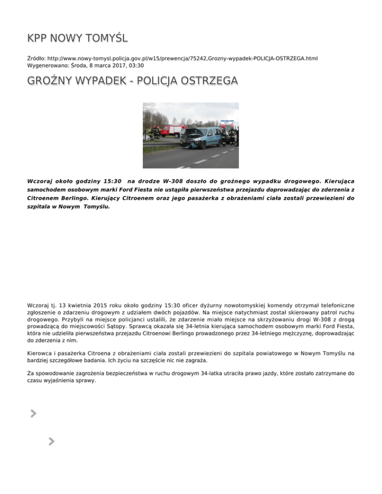 KPP NOWY TOMYŚL Źródło: http://www.nowy-tomysl.policja.gov.pl/w15/prewencja/75242,Grozny-wypadek-POLICJA-OSTRZEGA.html Wygenerowano: Środa, 8 marca 2017, 03:30 GROŹNY WYPADEK - POLICJA OSTRZEGA Wczoraj około godziny 15:30 na drodze W-308 doszło do groźnego wypadku drogowego. Kierująca samochodem osobowym marki Ford Fiesta nie ustąpiła pierwszeństwa przejazdu doprowadzając do zderzenia z Citroenem Berlingo. Kierujący Citroenem oraz jego pasażerka z obrażeniami ciała zostali przewiezieni do szpitala w Nowym Tomyślu. Wczoraj tj. 13 kwietnia 2015 roku około godziny 15:30 oficer dyżurny nowotomyskiej komendy otrzymał telefoniczne zgłoszenie o zdarzeniu drogowym z udziałem dwóch pojazdów. Na miejsce natychmiast został skierowany patrol ruchu drogowego. Przybyli na miejsce policjanci ustalili, że zdarzenie miało miejsce na skrzyżowaniu drogi W-308 z drogą prowadzącą do miejscowości Sątopy. Sprawcą okazała się 34-letnia kierująca samochodem osobowym marki Ford Fiesta, która nie udzieliła pierwszeństwa przejazdu Citroenowi Berlingo prowadzonego przez 34-letniego mężczyznę, doprowadzając do zderzenia z nim. Kierowca i pasażerka Citroena z obrażeniami ciała zostali przewiezieni do szpitala powiatowego w Nowym Tomyślu na bardziej szczegółowe badania. Ich życiu na szczęście nic nie zagraża. Za spowodowanie zagrożenia bezpieczeństwa w ruchu drogowym 34-latka utraciła prawo jazdy, które zostało zatrzymane do czasu wyjaśnienia sprawy. Jakub Czekała ,,Dzień Nowotomysko - Grodziski" Nadal główną przyczyną powstawania wypadków drogowych jest niedostosowanie przez kierujących prędkości do warunków ruchu lub zwyczajna nieuwaga. Wzrost liczby tych zdarzeń zobowiązuje organy odpowiedzialne za bezpieczeństwo i porządek publiczny do zintensyfikowania prowadzonych już działań, a także nakazuje szukania nowych, czasem bardziej radykalnych i dolegliwych dla „piratów drogowych” rozwiązań. Badania dowodzą, że często stosowane w takich przypadkach kary finansowe w drodze postępowania mandatowego są niewystarczającego i zbyt słabo oddziaływają i mobilizują kierowców do jazdy zgodnej z przepisami oraz do poszanowania prawa w przyszłości. W tej sytuacji wydaje się, iż skuteczniejszym, dodatkowym sposobem wyegzekwowania od „sprawców” wykroczeń z art. 86 kodeksu wykroczeń oraz przestępstw z art. 177 kodeksu karnego poszanowania przepisów ruchu drogowego będzie orzekanie środka karnego w postaci zatrzymania prawa jazdy. Pozbawienie czasowe kierowcy prawa jazdy nawet na najkrótszy przewidziany ustawowy okres zmusza go do bardziej restrykcyjnego przestrzegania przepisów i zasad ruchu drogowego. Komenda Powiatowa Policji w Nowym Tomyślu informuje, że policjanci, biorąc pod uwagę rodzaj popełnionego czynu zabronionego mogą i będą korzystać z instytucji zatrzymania prawa jazdy powołując się na ustawę z dnia 20 czerwca 1997 roku Prawo o ruchu drogowym. W takich przypadkach będą jednak brali pod uwagę szereg występujących w danej chwili czynników oraz powagi zaistniałego zdarzenia. Ocena: 0/5 (0) Tweetnij