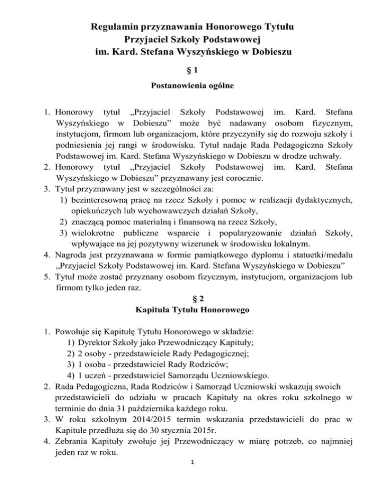 Regulamin przyznawania Honorowego Tytułu Przyjaciel Szkoły Podstawowej im. Kard. Stefana Wyszyńskiego w Dobieszu §1 Postanowienia ogólne 1. Honorowy tytuł „Przyjaciel Szkoły Podstawowej im. Kard. Stefana Wyszyńskiego w Dobieszu” może być nadawany osobom fizycznym, instytucjom, firmom lub organizacjom, które przyczyniły się do rozwoju szkoły i podniesienia jej rangi w środowisku. Tytuł nadaje Rada Pedagogiczna Szkoły Podstawowej im. Kard. Stefana Wyszyńskiego w Dobieszu w drodze uchwały. 2. Honorowy tytuł „Przyjaciel Szkoły Podstawowej im. Kard. Stefana Wyszyńskiego w Dobieszu” przyznawany jest corocznie. 3. Tytuł przyznawany jest w szczególności za: 1) bezinteresowną pracę na rzecz Szkoły i pomoc w realizacji dydaktycznych, opiekuńczych lub wychowawczych działań Szkoły, 2) znaczącą pomoc materialną i finansową na rzecz Szkoły, 3) wielokrotne publiczne wsparcie i popularyzowanie działań Szkoły, wpływające na jej pozytywny wizerunek w środowisku lokalnym. 4. Nagroda jest przyznawana w formie pamiątkowego dyplomu i statuetki/medalu „Przyjaciel Szkoły Podstawowej im. Kard. Stefana Wyszyńskiego w Dobieszu” 5. Tytuł może zostać przyznany osobom fizycznym, instytucjom, organizacjom lub firmom tylko jeden raz. §2 Kapituła Tytułu Honorowego 1. Powołuje się Kapitułę Tytułu Honorowego w składzie: 1) Dyrektor Szkoły jako Przewodniczący Kapituły; 2) 2 osoby - przedstawiciele Rady Pedagogicznej; 3) 1 osoba - przedstawiciel Rady Rodziców; 4) 1 uczeń - przedstawiciel Samorządu Uczniowskiego. 2. Rada Pedagogiczna, Rada Rodziców i Samorząd Uczniowski wskazują swoich przedstawicieli do udziału w pracach Kapituły na okres roku szkolnego w terminie do dnia 31 października każdego roku. 3. W roku szkolnym 2014/2015 termin wskazania przedstawicieli do prac w Kapitule przedłuża się do 30 stycznia 2015r. 4. Zebrania Kapituły zwołuje jej Przewodniczący w miarę potrzeb, co najmniej jeden raz w roku. 1 5. Kapituła podejmuje decyzje w głosowaniu zwykłą większością głosów. W przypadku równej liczby głosów decyduje głos Przewodniczącego Kapituły. §3 Postępowanie w sprawie nadania Tytułu Honorowego 1. Tytuł Honorowy przyznawany jest na wniosek. (załącznik nr 1) 2. Wniosek składany jest na piśmie. Wniosek powinien zawierać uzasadnienie. 3. Z wnioskiem o nadanie tytułu honorowego mogą wystąpić: 1) Dyrektor Szkoły; 2) Rada Rodziców; 3) Samorząd Uczniowski; 4) Rada Pedagogiczna (co najmniej 3 członków). 4. Z wnioskiem o nadanie tytułu honorowego może wystąpić również Kapituła tytułu honorowego. 5. Wnioski o nadanie tytułu honorowego składane są do Dyrektora Szkoły do 30 kwietnia każdego roku szkolnego. 6. Dyrektor Szkoły przedstawia wnioski Kapitule w terminie 30 dni od dnia ich złożenia. 7. Kapituła po zapoznaniu się z wnioskami i dokonaniu ich oceny przedstawia je Radzie Pedagogicznej, z własnym stanowiskiem, co do zasadności wniosku o nadanie tytułu honorowego. 8. Rada Pedagogiczna po rozpatrzeniu wniosków Kapituły podejmuje uchwałę o nadaniu lub odmowie nadania tytułu honorowego „ Przyjaciel Szkoły”. 9. Kapituła prowadzi rejestr nadanych tytułów honorowych. §4 Nadanie Tytułu Honorowego 1. Uroczyste nadanie Honorowego Tytułu „Przyjaciel Szkoły” ma miejsce podczas uroczystości z okazji zakończenia roku szkolnego. 2. Aktu wręczenia, w imieniu Kapituły, dokonuje Dyrektor Szkoły. 3. Osoba, instytucja lub firma, której nadano Honorowy Tytuł „Przyjaciel Szkoły”, otrzymuje: 1) akt nadania tytułu w formie pamiątkowego dyplomu; 2) pamiątkową statuetkę; 3) miejsce w „Galerii Przyjaciół Szkoły”; 4) wpis na stronie internetowej szkoły. 2 §5 Postanowienia końcowe 1. Zmian w niniejszym regulaminie dokonuje Rada Pedagogiczna Szkoły. 2. Regulamin zatwierdzony uchwałą nr 8/2014 Rady Pedagogicznej Szkoły Podstawowej im. Kard. Stefana Wyszyńskiego w Dobieszu z dnia 05.10.2014r. 3. Regulamin wchodzi w życie z dniem uchwalenia. 3 Załącznik nr 1do Regulaminu WNIOSEK O PRZYZNANIE TYTUŁU „PRZYJACIEL SZKOŁY” Zgłaszam wniosek o przyznanie tytułu „Przyjaciel Szkoły Podstawowej im. Kard. Stefana Wyszyńskiego w Dobieszu” w roku szkolnym ……… Pani/Panu, instytucji, firmie: ……………………………………………………………………………………..……. Uzasadnienie wniosku (kryteria opisane w regulaminie nagrody): Pani/Pan, instytucja, firma …………………………………………………………………….…………………….. spełnia następujące kryteria *: 1. Bezinteresowna praca na rzecz Szkoły i pomoc w realizacji dydaktycznych, opiekuńczych lub wychowawczych działań Szkoły, przejawiająca się w: ………………………………………………………………………………………… ………………………………………………………………………………………… ………………………………………………………………………………………… 2. Znacząca pomoc materialna i finansowa na rzecz Szkoły, przejawiająca się w: ………………………………………………………………………………………… ………………………………………………………………………………………… ………………………………………………………………………………………… 3. Wieloletnie publiczne wsparcie i popularyzowanie działań Szkoły wpływające na pozytywny wizerunek w środowisku lokalnym, przejawiające się w: ………………………………………………………………………………………… ………………………………………………………………………………………… ………………………………………………………………………………………… *właściwe zaznaczyć i uzasadnić ……