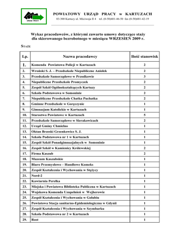 POWIATOWY URZĄD PRACY w KARTUZACH 83-300 Kartuzy ul. Mściwoja II 4 tel. (0-58)681-46-50 fax (0-58)681-42-19 Wykaz pracodawców, z którymi zawarto umowy dotyczące staży dla skierowanego bezrobotnego w miesiącu WRZESIEŃ 2009 r. STAŻE Lp. Nazwa pracodawcy Ilość stanowisk 1. Komenda Powiatowa Policji w Kartuzach 2 2. Wroński S. J. – Przedszkole Niepubliczne Aniołek 2 3. Przedszkole Samorządowe w Przodkowie 3 4. Niepubliczne Przedszkole Promyczek 2 5. Zespół Szkół Ogólnokształcących Kartuzy 2 6. Szkoła Podstawowa w Somoninie 2 7. Niepubliczne Przedszkole Chatka Puchatka 2 8. Gminne Przedszkole w Goręczynie 1 9. Gimnazjum Katolickie w Kartuzach 1 10. Starostwo Powiatowe w Kartuzach 5 11. Przedszkole Samorządowe w Sierakowicach 2 12. Urząd Gminy Chmielno 1 13. Oktan Brzeski Grzenkowicz S. J. 1 14. Szkoła Podstawowa nr 1 w Kartuzach 1 15. Zespół Szkół Ponadgimnazjalnych w Somoninie 1 16. Zespół Szkół w Kamienicy Królewskiej 2 17. Firma Kaszub 2 18. Muzeum Kaszubskie 1 19. Biuro Przemysłowo – Handlowe Komeks 1 20. Zespół Kształcenia i Wychowania w Stężycy 1 21. Nord-2 1 22. Kawiarnia Perełka 1 23. Miejska i Powiatowa Biblioteka Publiczna w Kartuzach 1 24. Wojskowa Komenda Uzupełnień w Wejherowie 1 25. Zespół Kształcenia i Wychowania w Gołubiu 1 26. Powiatowa Stacja sanitarno-Epidemiologiczna w Gdynii 1 27. Zespół Kształcenia i Wychowania w Szymbarku 1 28. Szkoła Podstawowa nr 2 w Kartuzach 1 29. Rost 1 30. Biuro Land 1 31. Niepubliczny Zakład Opieki Zdrowotnej Kaszuby 2 32. Prokuratura Rejonowa w Kartuzach 2 33. Przedsiębiorstwo Handlowo Usługowe Sonia 2 34. Świat Kwiatów Mirela Kuczkowska 1 35. Kwiaciarnia Danuta Zaremba 1 36. Kwiaciarnia Magnolia 1 37. Zieleń Serwis Polbud 1 38. Pracownia Plastyczno Fotograficzna Multi-Color 2 39. P.P.H.U. Arstal 1 Razem: 58
