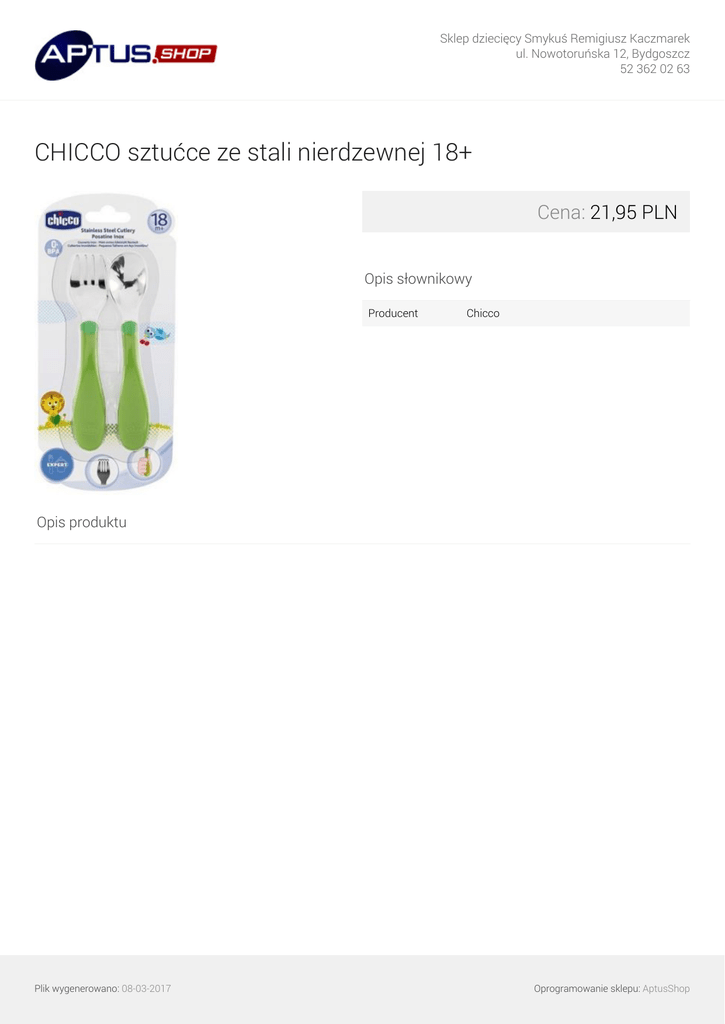 Sklep dziecięcy Smykuś Remigiusz Kaczmarek ul. Nowotoruńska 12, Bydgoszcz 52 362 02 63 CHICCO sztućce ze stali nierdzewnej 18+ Cena: 21,95 PLN Opis słownikowy Producent Chicco Opis produktu Plik wygenerowano: 08-03-2017 Powered by TCPDF (www.tcpdf.org) Oprogramowanie sklepu: AptusShop