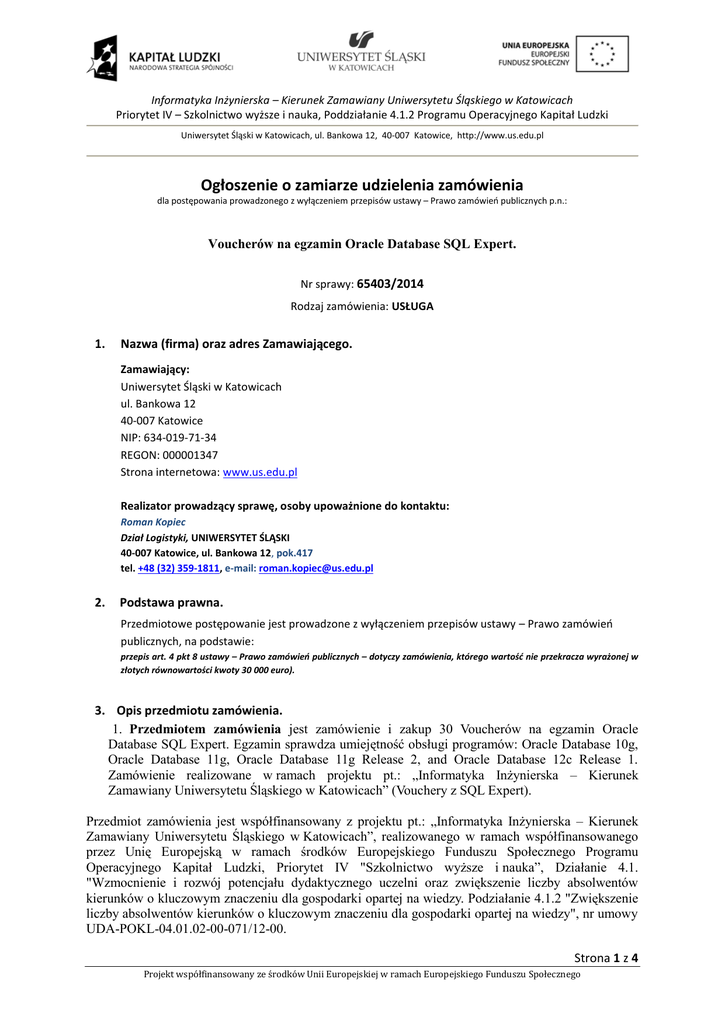 Informatyka Inżynierska – Kierunek Zamawiany Uniwersytetu Śląskiego w Katowicach Priorytet IV – Szkolnictwo wyższe i nauka, Poddziałanie 4.1.2 Programu Operacyjnego Kapitał Ludzki Uniwersytet Śląski w Katowicach, ul. Bankowa 12, 40-007 Katowice, http://www.us.edu.pl Ogłoszenie o zamiarze udzielenia zamówienia dla postępowania prowadzonego z wyłączeniem przepisów ustawy – Prawo zamówień publicznych p.n.: Voucherów na egzamin Oracle Database SQL Expert. Nr sprawy: 65403/2014 Rodzaj zamówienia: USŁUGA 1. Nazwa (firma) oraz adres Zamawiającego. Zamawiający: Uniwersytet Śląski w Katowicach ul. Bankowa 12 40-007 Katowice NIP: 634-019-71-34 REGON: 000001347 Strona internetowa: www.us.edu.pl Realizator prowadzący sprawę, osoby upoważnione do kontaktu: Roman Kopiec Dział Logistyki, UNIWERSYTET ŚLĄSKI 40-007 Katowice, ul. Bankowa 12, pok.417 tel. +48 (32) 359-1811, e-mail: [email protected] 2. Podstawa prawna. Przedmiotowe postępowanie jest prowadzone z wyłączeniem przepisów ustawy – Prawo zamówień publicznych, na podstawie: przepis art. 4 pkt 8 ustawy – Prawo zamówień publicznych – dotyczy zamówienia, którego wartość nie przekracza wyrażonej w złotych równowartości kwoty 30 000 euro). 3. Opis przedmiotu zamówienia. 1. Przedmiotem zamówienia jest zamówienie i zakup 30 Voucherów na egzamin Oracle Database SQL Expert. Egzamin sprawdza umiejętność obsługi programów: Oracle Database 10g, Oracle Database 11g, Oracle Database 11g Release 2, and Oracle Database 12c Release 1. Zamówienie realizowane w ramach projektu pt.: „Informatyka Inżynierska – Kierunek Zamawiany Uniwersytetu Śląskiego w Katowicach” (Vouchery z SQL Expert). Przedmiot zamówienia jest współfinansowany z projektu pt.: „Informatyka Inżynierska – Kierunek Zamawiany Uniwersytetu Śląskiego w Katowicach”, realizowanego w ramach współfinansowanego przez Unię Europejską w ramach środków Europejskiego Funduszu Społecznego Programu Operacyjnego Kapitał Ludzki, Priorytet IV "Szkolnictwo wyższe i nauka”, Działanie 4.1. "Wzmocnienie i rozwój potencjału dydaktycznego uczelni oraz zwiększenie liczby absolwentów kierunków o kluczowym znaczeniu dla gospodarki opartej na wiedzy. Podziałanie 4.1.2 "Zwiększenie liczby absolwentów kierunków o kluczowym znaczeniu dla gospodarki opartej na wiedzy", nr umowy UDA-POKL-04.01.02-00-071/12-00. Strona 1 z 4 Projekt współfinansowany ze środków Unii Europejskiej w ramach Europejskiego Funduszu Społecznego Informatyka Inżynierska – Kierunek Zamawiany Uniwersytetu Śląskiego w Katowicach Priorytet IV – Szkolnictwo wyższe i nauka, Poddziałanie 4.1.2 Programu Operacyjnego Kapitał Ludzki Uniwersytet Śląski w Katowicach, ul. Bankowa 12, 40-007 Katowice, http://www.us.edu.pl Zamawiający zastrzega sobie możliwość zmiany treści ogłoszenia o zamiarze udzielenia zamówienia lub stosownych załączników do ogłoszenia (w tym opisu przedmiotu zamówienia) przed upływem terminu składania ofert, o czym poinformuje Wykonawców ubiegających się o zamówienie, zamieszczając stosowną informację na stronie internetowej, na której zamieszczone zostało ogłoszenie. 4. Warunki realizacji zamówienia. 1. Wymagany termin realizacji zamówienia: Rok 2014: zakup max. 30 Voucherów Rok 2015: wykorzystanie vouchera w ciągu 6 miesięcy od daty zakupu voucheru 2. Miejsce realizacji zamówienia: Uniwersytet Śląski, Dział Logistyki, 40-007 Katowice, Bankowa 12, pok. 417 – Roman Kopiec 3 Pozostałe warunki realizacji zamówienia: a. Liczba uczestników: max. 30 studentów/ek. Vouchery na egzamin Oracle Database SQL Expert skierowane są do studentów/tek studiów stacjonarnych I stopnia kierunku informatyka inżynierska w ramach projektu pt.: „Informatyka Inżynierska – Kierunek Zamawiany Uniwersytetu Śląskiego w Katowicach”. Z Voucherów mogą skorzystać jedynie uczestnicy projektu „Informatyka Inżynierska – Kierunek Zamawiany Uniwersytetu Śląskiego w Katowicach” realizowanego w ramach Priorytetu IV – Szkolnictwo wyższe i nauka, Poddziałania 4.1.2 Programu Operacyjnego Kapitał Ludzki. b. Rekrutacja uczestników Za rekrutację odpowiedzialny jest Zamawiający. Decydująca jest ocena z przedmiotu kierunkowego, rozmowa kwalifikacyjna, średnia ocen. c. Certyfikaty Wykonawca jest zobowiązany do dostarczenia voucherów na egzamin, bądź dostępu do nich. Po zdanym egzaminie studenci/tki powinni otrzymać imienny certyfikat. 5. Warunki płatności: Rozliczenie odbędzie się po przekazaniu Voucherów i po podpisaniu protokołu odbioru bez uwag przez Zamawiającego, który stanowi podstawę do wystawienia rachunku/faktury. Zamawiający zobowiązuje się dokonać zapłaty należności na rachunek Wykonawcy podany na fakturze VAT/rachunku w terminie do 14 dni od daty jej otrzymania. 6. Opis kryteriów oceny ofert. 1. Kryterium – Cena. Waga kryterium – 100%. Strona 2 z 4 Projekt współfinansowany ze środków Unii Europejskiej w ramach Europejskiego Funduszu Społecznego Informatyka Inżynierska – Kierunek Zamawiany Uniwersytetu Śląskiego w Katowicach Priorytet IV – Szkolnictwo wyższe i nauka, Poddziałanie 4.1.2 Programu Operacyjnego Kapitał Ludzki Uniwersytet Śląski w Katowicach, ul. Bankowa 12, 40-007 Katowice, http://www.us.edu.pl 7. Opis sposobu przygotowania ofert. 1. 2. 3. 4. 5. 6. Każdy Wykonawca może złożyć tylko: jedną ofertę w niniejszym postępowaniu. Ofertę należy przedstawić w języku polskim, w formie elektronicznej lub pisemnej wg wzoru stanowiącego załącznik nr 1 do niniejszego ogłoszenia. Oferta oraz wszystkie oświadczenia składane przez Wykonawcę w toku postępowania winny być podpisane przez osoby upoważnione do składania oświadczeń woli w imieniu wykonawcy, zgodnie z zasadą reprezentacji wynikającą z postanowień odpowiednich przepisów prawnych bądź umowy, uchwały lub prawidłowo sporządzonego pełnomocnictwa. W przypadku Wyk