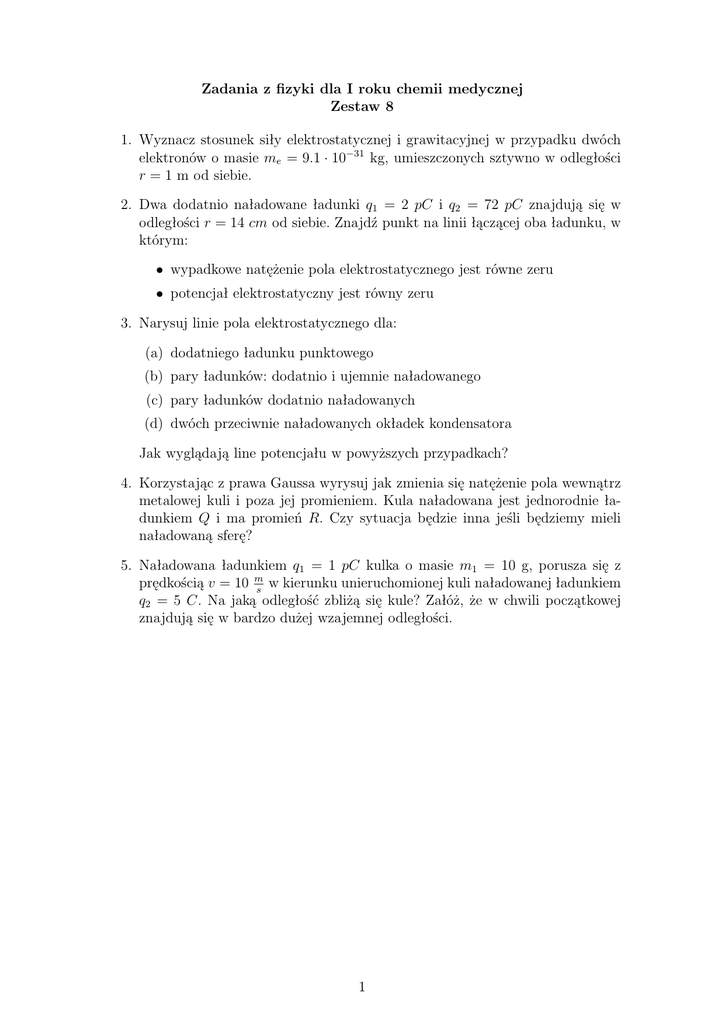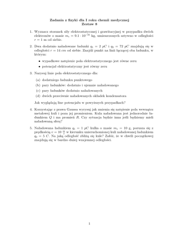 Zadania z fizyki dla I roku chemii medycznej Zestaw 8 1. Wyznacz stosunek siły elektrostatycznej i grawitacyjnej w przypadku dwóch elektronów o masie me = 9.1 · 10−31 kg, umieszczonych sztywno w odległości r = 1 m od siebie. 2. Dwa dodatnio naładowane ładunki q1 = 2 pC i q2 = 72 pC znajdują się w odległości r = 14 cm od siebie. Znajdź punkt na linii łączącej oba ładunku, w którym: • wypadkowe natężenie pola elektrostatycznego jest równe zeru • potencjał elektrostatyczny jest równy zeru 3. Narysuj linie pola elektrostatycznego dla: (a) dodatniego ładunku punktowego (b) pary ładunków: dodatnio i ujemnie naładowanego (c) pary ładunków dodatnio naładowanych (d) dwóch przeciwnie naładowanych okładek kondensatora Jak wyglądają line potencjału w powyższych przypadkach? 4. Korzystając z prawa Gaussa wyrysuj jak zmienia się natężenie pola wewnątrz metalowej kuli i poza jej promieniem. Kula naładowana jest jednorodnie ładunkiem Q i ma promień R. Czy sytuacja będzie inna jeśli będziemy mieli naładowaną sferę? 5. Naładowana ładunkiem q1 = 1 pC kulka o masie m1 = 10 g, porusza się z prędkością v = 10 ms w kierunku unieruchomionej kuli naładowanej ładunkiem q2 = 5 C. Na jaką odległość zbliżą się kule? Załóż, że w chwili początkowej znajdują się w bardzo dużej wzajemnej odległości. 1