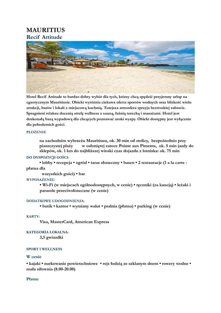 MAURITIUS Recif Attitude Hotel Recif Attitude to bardzo dobry wybór dla tych, którzy chcą spędzić przyjemny urlop na egzotycznym Mauritiusie. Obiekt wyróżnia ciekawa oferta sportów wodnych oraz bliskość wielu atrakcji, barów i lokali z miejscową kuchnią. Tutejsza atmosfera sprzyja beztroskiej zabawie. Spragnieni relaksu docenią strefę wellness z sauną, łaźnią turecką i masażami. Hotel jest doskonałą bazą wypadową dla chcących poznawać uroki wyspy. Obiekt dostępny jest wyłącznie dla pełnoletnich gości. PŁOŻENIE na zachodnim wybrzeżu Mauritiusu, ok. 30 min od stolicy, bezpośrednio przy piaszczystej plaży w osłoniętej zatoce Pointe aux Piments, ok. 5 min jazdy do sklepów, ok. 1 km do najbliższej wioski czas dojazdu z lotniska: ok. 75 min DO DYSPOZYCJI GOŚCI: • lobby • recepcja • ogród • taras słoneczny • basen • 2 restauracje (1 a la carte płatna dla wszystkich gości) • bar WYPOSAŻENIE: • Wi-Fi (w miejscach ogólnodostępnych, w cenie) • ręczniki (za kaucją) • leżaki i parasole przeciwsłoneczne (w cenie) DODATKOWE UDOGODNIENIA: • butik • kantor • wymiany walut • pralnia (płatna) • parking (w cenie) KARTY: Visa, MasterCard, American Express KATEGORIA LOKALNA: 3,5 gwiazdki SPORT I WELLNESS W cenie • kajaki • nurkowanie powierzchniowe • rejs łodzią ze szklanym dnem • rowery wodne • mała siłownia (8.00-20.00) Płatne • wypożyczenie rowerów • katamaran • wypożyczalnia sprzętu do nurkowania • centrum wellness • masaże • zabiegi kosmetyczne OFERTA Uczestnicy: 2 osoby Data wyjazdu: 31 maja 2017 Długość pobytu: 6 dni Lotnisko wylotowe: Warszawa Zakwaterowanie: pokój 2-osobowy Wyżywienie: śniadanie i obiadokolacja Cena: 14580 zł