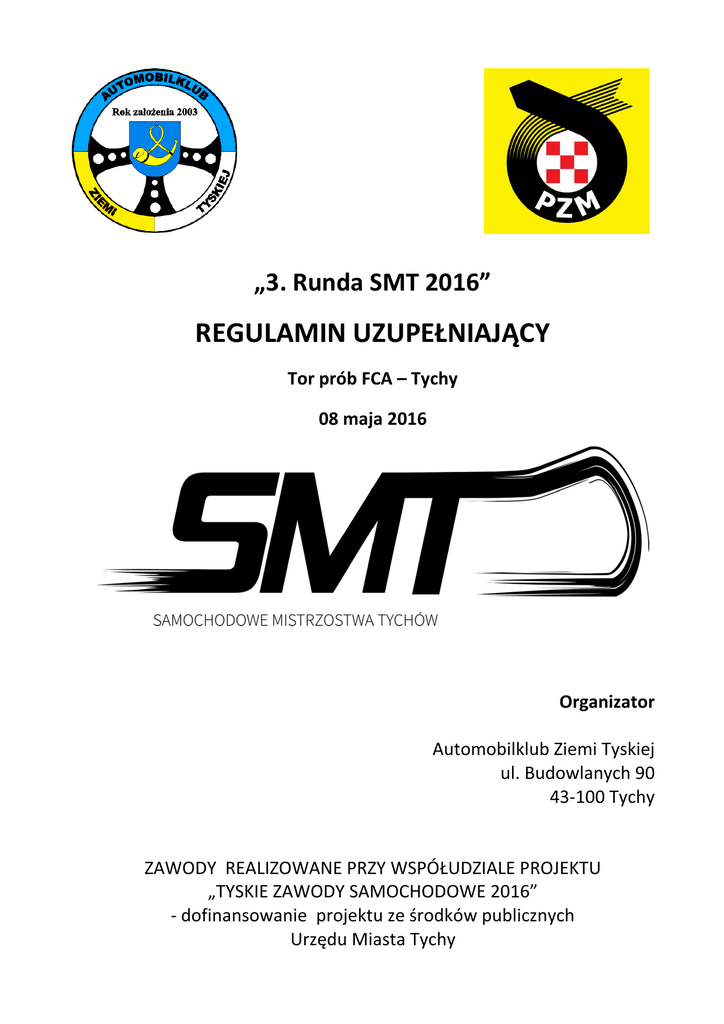 „3. Runda SMT 2016” REGULAMIN UZUPEŁNIAJĄCY Tor prób FCA – Tychy 08 maja 2016 Organizator Automobilklub Ziemi Tyskiej ul. Budowlanych 90 43-100 Tychy ZAWODY REALIZOWANE PRZY WSPÓŁUDZIALE PROJEKTU „TYSKIE ZAWODY SAMOCHODOWE 2016” - dofinansowanie projektu ze środków publicznych Urzędu Miasta Tychy Spis treści 1. USTALENIA OGÓLNE........................................................................................................................... 3 2. ORGANIZACJA..................................................................................................................................... 4 3. ZGŁOSZENIA ....................................................................................................................................... 4 4. UBEZPIECZENIE................................................................................................................................... 6 5. NUMERY IDENTYFIKACYJNE ............................................................................................................... 6 6. REKLAMA ............................................................................................................................................ 6 7. ODBIÓR ADMINISTRACYJNY ............................................................................................................... 7 8. ZAPOZNANIE Z TRASĄ ........................................................................................................................ 7 9. BADANIA KONTROLNE ....................................................................................................................... 7 10. OPONY ................................................................................................................................................ 7 11. ODPRAWA UCZESTNIKÓW ................................................................................................................. 8 12. PRZEBIEG IMPREZY............................................................................................................................. 8 13. PROCEDURA STARTU.......................................................................................................................... 8 14. POMIAR CZASU .................................................................................................................................. 8 15. META ZAWODÓW .............................................................................................................................. 9 16. BEZPIECZEŃSTWO .............................................................................................................................. 9 17. IDENTYFIKACJA OSÓB OFICJALNYCH .................................................................................................. 9 18. NAGRODY ........................................................................................................................................... 9 19. PROTESTY ........................................................................................................................................... 9 20. KARY ................................................................................................................................................... 9 21. POSTANOWIENIA KOŃCOWE ............................................................................................................. 9 2 1. USTALENIA OGÓLNE 1. Runda SMT 2016 zostanie przeprowadzona zgodnie z postanowieniami: • • • • • • • Międzynarodowego Kodeksu Sportowego FIA, Regulaminu Sportowego Rajdów Regionalnych FIA wraz z załącznikami, Regulaminu Konkursowej Jazdy Samochodem 2016, Regulaminu Ochrony Środowiska PZM, Ustawy „Prawo o ruchu drogowym”, Regulaminu ramowego Samochodowych Mistrzostw Tychów 2016, niniejszego regulaminu uzupełniającego. Modyfikacje, zmiany i/lub uzupełnienia do niniejszego regulaminu uzupełniającego będą publikowane wyłącznie w numerowanych i datowanych komunikatach ogłaszanych przez organizatora lub ZSS. Regulamin ramowy Samochodowych Mistrzostw Tychów 2016 znajduje się na stronie internetowej Klubu pod adresem: www.azt.tychy.pl/do-pobrania.html Otwarcie listy zgłoszeń Zamknięcie listy zgłoszeń Odbiór administracyjny Badanie kontrolne BK1 Pierwsze posiedzenie ZSS Publikacja listy załóg dopuszczonych do startu Odprawa uczestników Zapoznanie z trasą Start Meta Opublikowanie końcowej klas. prowizorycznej Rozdanie nagród 1.1. 25.04.2016 08.05.2016 godz. 8:45 08.05.2016 godz. 7:15 – 9:00 08.05.2016 godz. 7:30 – 9:30 08.05.2016 godz. 9:35 08.05.2016 godz. 10:20 08.05.2016 godz. 10:25 08.05.2016 godz. 10:45 08.05.2016 godz. 11:15 08.05.2016 godz. 14:25 30 min po mecie ostatniej załogi. 60 min po mecie ostatniej załogi. Miejsce i termin imprezy Impreza odbędzie się w dniu 08.05.2016 (niedziela), na terenie Toru Prób Fiat Chrysler Automobiles w Bieruniu ul. Oświęcimska, współrzędne GPS 50°06'08.4"N 19°03'50.4"E. 1.2. Nazwa i ranga imprezy 3. Runda SMT zostanie rozegrana jako sprint samochodowy. 1.3. Numer wizy ZO PZM Numer wizy 11 / RS / 2016 wydana przez OKSS w Katowicach w dniu 25 kwietnia 2016 roku. 1.4. Lokalizacja biura zawodów Do dnia 07.05.2016 biuro zawodów znajdować się będzie w Tychach, ul. Budowlanych 43 w biurze sportu Automobilklubu Ziemi Tyskiej. W dniu imprezy biuro zawodów znajdować się będzie w hangarze na terenie Toru Prób Fiat Chrysler Automobiles od godz. 7:15. 1.5. Lokalizacja startu i mety Start - Tor Prób Fiat Chrysler Automobiles, 08.05.2016 godz.: 11:15 Meta – Tor Prób Fiat Chrysler Automobiles, 08.05.2016 godz.:14:25 1.6. Charakterystyka Impreza zostanie przeprowadzona w ciągu jednego dnia i składać się będzie z jednej próby, poprzedzonej stanowiskiem PKC. Długość trasy: 3*3 km = 9 km Nawierzchnia trasy i prób: asfalt, beton 2. ORGANIZACJA 2.1. Nazwa organizatora Automobilklub Ziemi Tyskiej 2.2. Adres ul. Budowlanyc