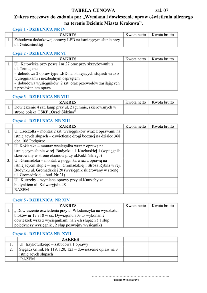 TABELA CENOWA zał. 07 Zakres rzeczowy do zadania pn: „Wymiana i dowieszenie opraw oświetlenia ulicznego na terenie Dzielnic Miasta Krakowa”. Część 1 - DZIELNICA NR IV ZAKRES 1. Zabudowa dodatkowej oprawy LED na istniejącym slupie przy ul. Gnieżnińskiej Część 2 - DZIELNICA NR VI ZAKRES 1. Ul. Katowicka przy posesji nr 27 oraz przy skrzyżowaniu z ul. Tetmajera: - dobudowa 2 opraw typu LED na istniejących słupach wraz z wysięgnikami i niezbędnym osprzętem - dobudowa wysięgników 2 szt. oraz przewodów zasilających z przełożeniem opraw Część 3 - DZIELNICA NR VIII ZAKRES 1. Dowieszenie 4 szt. lamp przy ul. Zagumnie, skierowanych w stronę boiska OSKF „Orzeł Sidzina” 1. 2. 3. 4. Część 4 - DZIELNICA NR XIII ZAKRES Ul.Czeczotta – montaż 2 szt. wysięgników wraz z oprawami na istniejących słupach – oswietlenie drogi bocznej na dzialce 368 obr. 106 Podgórze Ul.Kożlarska – montaż wysięgnika wraz z oprawą na istniejącym słupie w rej. Budynku ul. Kożlarskiej 1 (wysięgnik skierowany w stronę ekranów przy ul.Kuklińskiego) Ul. Gromadzka – montaż wysięgnika wraz z oprawą na istniejącycm slupie – róg ul. Gromadzkiej i Stróża Rybna w rej. Budynku ul. Gromadzkiej 20 (wysięgnik skierowany w stronę ul. Gromadzkiej – bud. Nr 21) Ul. Kutrzeby – wymiana oprawy przy ul.Kutrzeby za budynkiem ul. Kalwaryjska 48 RAZEM Część 5 - DZIELNICA NR XIV ZAKRES 1. „ Dowieszenie oswietlenia przy ul.Włodarczyka na wysokości bloków nr 17 i 18 w os. Dywizjonu 303 „- wykonanie dowieszek wraz z wysięgnikami na 2-ch słupach ( 1 słup pojędynczy wysięgnik , 2 słup poswójny wysięgnik) Kwota netto Kwota brutto Kwota netto Kwota brutto Kwota netto Kwota brutto Kwota netto Kwota brutto Kwota netto Kwota brutto Część 6 - DZIELNICA NR XVII ZAKRES 1. Ul. Irzykowskiego – zabudowa 1 oprawy 2. Sięgacz Glinik Nr 119, 120, 123 – dowieszenie opraw na 3 istniejących słupach RAZEM ……………………………………………….. / podpis Wykonawcy )