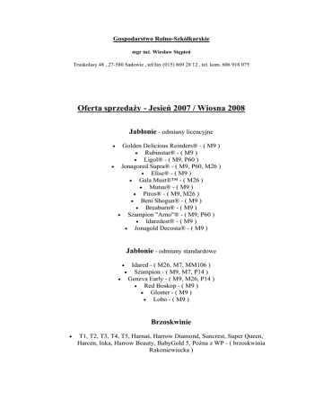 Gospodarstwo Rolno-Szkółkarskie mgr inż. Wiesław Stępień Truskolasy 48 , 27-580 Sadowie , tel/fax (015) 869 28 12 , tel. kom. 606 918 075 Oferta sprzedaży - Jesień 2007 / Wiosna 2008 Jabłonie - odmiany licencyjne Golden Delicious Reinders® - ( M9 ) Rubinstar® - ( M9 ) Ligol® - ( M9, P60 ) Jonagored Supra® - ( M9, P60, M26 ) Elise® - ( M9 ) Gala Must®™ - ( M26 ) Mutsu® - ( M9 ) Piros® - ( M9, M26 ) Beni Shogun® - ( M9 ) Breaburn® - ( M9 ) Szampion "Arno"® - ( M9, P60 ) Idaredest® - ( M9 ) Jonagold Decosta® - ( M9 ) Jabłonie - odmiany standardowe Idared - ( M26, M7, MM106 ) Szampion - ( M9, M7, P14 ) Geneva Early - ( M9, M26, P14 ) Red Boskop - ( M9 ) Gloster - ( M9 ) Lobo - ( M9 ) Brzoskwinie T1, T2, T3, T4, T5, Harnaś, Harrow Diamond, Suncrest, Super Queen, Harcen, Inka, Harrow Beauty, BabyGold 5, Poźna z WP - ( brzoskwinia Rakoniewiecka ) Nektaryny Redgold, Fantasia, Durbin, Harblaze, Harco - ( brzoskwinia Rakoniewiecka ) Śliwy Amers, Empress, President, Węgierka Zwykła, Oneida - ( ałycza ) Grusze Lukasówka, Konferencja, Concorde®, Hortensja®, David®, Izolda®, Carola - ( pigwa S1 ) Wiśnie Łutówka, Kelleris 16, Debreczyn (Debrecemi Botermo)® - ( antypka ) Łutówka, Kelleris 16, Pandy - ( czereśnia Ptasia ) Morele Harlain, Sirene, Goldrich, Bergeron, Orangered - ( ałycza ) Czereśnie Sylvia, Burlat, Summit, Regina, Sam - ( F-12/1 ) Merchant, Vega, Lapins, Sylvia, Karina, Kordia - ( czereśnia Ptasia ) Burlat - ( Colt ) Karłowe Czereśnie Burlat, Kordia, Sam, Regina, Summit, Vega - ( Gizela5 )