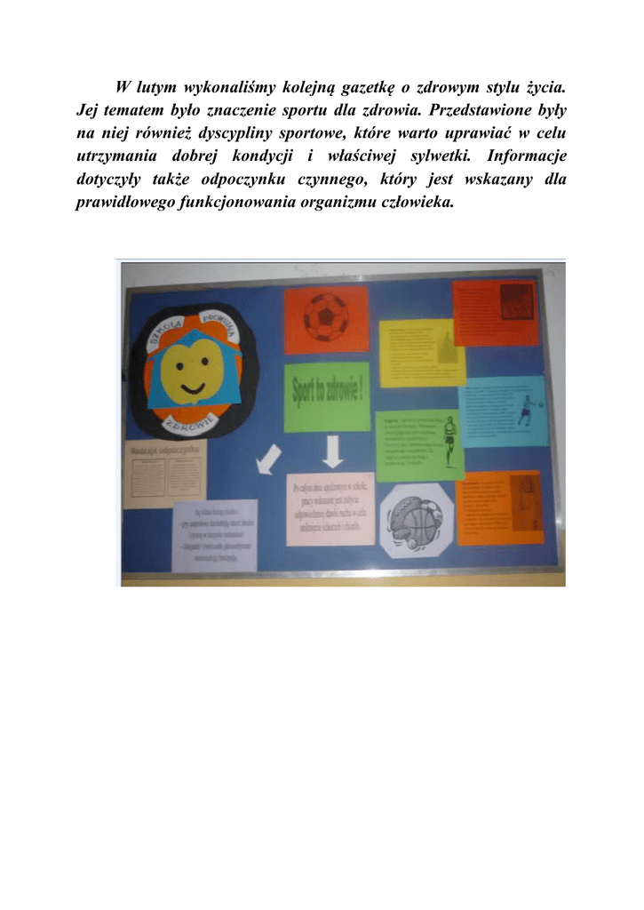 W lutym wykonaliśmy kolejną gazetkę o zdrowym stylu życia. Jej tematem było znaczenie sportu dla zdrowia. Przedstawione były na niej również dyscypliny sportowe, które warto uprawiać w celu utrzymania dobrej kondycji i właściwej sylwetki. Informacje dotyczyły także odpoczynku czynnego, który jest wskazany dla prawidłowego funkcjonowania organizmu człowieka.