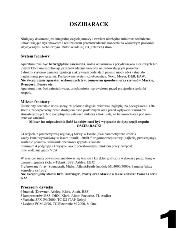OSZIBARACK Niniejszy dokument jest integralną częścią umowy i zawiera niezbędne minimum techniczne, umożliwiające wykonawcom i realizatorom przeprowadzenie koncertu na właściwym poziomie artystycznym i technicznym. Rider składa się z 4 (czterech) stron. System frontowy Aparatura musi być bezwzględnie uziemiona, wolna od szumów i przydźwięków sieciowych lub innych które uniemożliwiają przeprowadzenie koncertu na zadowalającym poziomie. 3 drożny system o uznanej reputacji z aktywnym podziałem pasm o mocy adekwatnej do nagłaśnianej powierzchni. Preferowane systemy:L-Acoustics, Nexo, Meyer, D&B, EAW. Nie akceptujemy aparatur wykonanych tzw. domowym sposobem oraz systemów Mackie, Dynacord, Peavey etc. Aparatura musi być zainstalowana, uruchomiona i sprawdzona przed przyjazdem techniki zespołu. Mikser frontowy Ustawiony centralnie w osi sceny, w połowie długości widowni, najlepiej na podwyższeniu (3040cm), zabezpieczony przed dostępem osób postronnych oraz przed wpływem warunków atmosferycznych. Nie akceptujemy ustawień miksera z boku sali, na balkonach oraz pod nimi oraz we wnękach. Mikser lub odpowiednia ilość kanałów musi być wyłącznie do dyspozycji zespołu OSZIBARACK! 24 wejścia z parametryczną regulacją barwy w kanale (dwa parametryczne środki) każdy kanał wyposażony w insert, tłumik –20dB, filtr górnoprzepustowy (najlepiej przestrajany), zasilanie phantom, wskażnik obecności sygnału w kanale. minimum 4 podgrupy i 4 wysyłki aux z przestawianym punktem pracy pre/post mile widziane grupy VCA W insercie sumy powinnien znajdować się tercjowy korektor graficzny wykonany przez firmę o uznanej reputacji (Klark-Teknik, BSS, Ashley, DBX) Preferowane firmy: Soundcraft, Midas, Allen&Heath (modele ML4000/5000), Yamaha (także konsolety cyfrowe) Nie akceptujemy stołów firm Behringer, Peavey oraz Mackie a także konsolet Yamaha serii GA! Procesory dzwięku 6 bramek (Drawmer, Ashley, Klark, Altair, BSS) 5 kompresorów (BSS, DBX, Klark, Altair, Focusrite, TL Audio) • Yamaha SPX 990/2000, TC D2 (TAP Delay) • Lexicon PCM 80/90, TC.Electronic M-2000, M-One System monitorowy Konsoleta monitorowa: 24 wejscia, min 8 wyjść AUX z możliwością przełaczania PRE/POST. Każda droga wyposażona w tercjowy korektor graficzny (1/3 okt.), 3 monitory odsłuchowe min.350W(RMS) + drumfill min.500W(RMS). 1MIX – BASS – SCENA LEWA – 1 WEDGE MONO 2MIX – PERKUSJA – SCENA SRODEK / TYŁ – 1 DRUMFILL MONO 3/4MIX – INSTR. KLAW. – SCENA PRAWA / FRONT – IEM (Stereo) 5/6 MIX – IEM (Stereo) Wszystkie monitory i wzmacniacze musza być jednego typu! Preferowane miksery to: Soundcraft SM20,SM12 Preferowane systemy monitorowe: Turbosound TFM-212, Martin LE400C, JBL SRX712M, HK Audio SM112II. Mikser lub odpowiednia ilość kanałów musi być wyłącznie do dyspozycji zespołu OSZIBARACK! Prosimy o doświadczonego i miłego realizatora monitorów. Zasilanie System (aparatura + sprzęt muzyków) musi być zasilany z tego samego żródła, umożliwiającego odpowiedni pobór mocy – adekwatnie do potrzeb zainstalowanej aparatury. Zarówno w przypadku zasilania jednofazowego, jak też i trójfazowego, bezwzględnie wymagana jest instalacja z dodatkowym przewodem ochronnym. Firma zapewniająca nagłośnienie i zasilanie sprzętu zespołu bierze na siebie całkowitą odpowiedzialność za bezpieczeństwo wykonawców, realizatorów i techniki zaspołu podczas prób i koncertu. Uwagi Wszystkie połączenia powinny być prowadzone w sposób symetryczny przy użyciu kabli dobrej jakości i zakończone końcówkami XLR. Między sceną a konsoletą frontową musi być poprowadzona komunikacja TalkBack! Dla perkusji wymagany jest podest (solidny!) o wymiarach 3m x 2m x 30cm, lub ekran akustyczny (pleksa) W czasie prób i koncertu obowiązkowa jest obecność doświadczonej ekipy technicznej odpowiedzialnej za aparaturę nagłaśniającą. Dopuszcza się możliwość zmian – po wcześniejszym ich zaakceptowaniu przez zespół. W przypadku wątpliwości lub uzyskania dodatkowych informacji prosimy o kontakt. Jacek Mazur tel. +48 666 008 087 [email protected] Mixer 1 2 3 4 5 6 7 8 9 10 11 12 13 14 15 16 17 18 19 20 21 22 23 24 25 26 Instrument KICK KICK SUB SNARE top SNARE btm TOM 1 TOM 2 TOM 3 HH OH L OH R RIDE BASS line DBL. BASS line GUITAR/THER. SYNTH L SYNTH R BRASS L BRASS R CHOIR L CHOIR R VOCAL VOCAL SPARE FX FX Mic Audix D6 Y from ch.1 e604 e604 e604 e604 e604 SM81 AT4050 AT4050 AT4020 Active DI Active DI Active DI Active DI Active DI Active DI Active DI Active DI Active DI N/D967 N/D967 provided provided measurement mic provided Replacement ATM25HE Beta52 ATM23HE / SM57 ATM23HE / SM57 ATM23HE / SM57 ATM23HE / SM57 ATM23HE / SM57 ATPro37R SM81 SM81 SM81 DI DI DI DI DI DI DI DI DI SM58 SM58 Stand Short Insert Gate Short Short Boom Boom Boom Boom Boom Boom Boom Gate Gate Gate Gate Gate Misc 48V 48V 48V 48V Comp Comp Comp Boom Comp Comp Straight Direct Out 48V Group Grp Insert 1-2 1-2 1-2 1-2 1-2 1-2 1-2 1-2 1-2 1-2 1-2 L-R L-R L-R L-R L-R L-R L-R L-R L-R L-R / 3-4 L-R / 3-4 EQ L-R EQ L-R EQ L-R EQ mono-MATRIX Zmazik – MIX 4, Drum‐Fill, 3x230V Tomek – MIX 3, 3x230V Agim – MIX 5/6 IEM stereo, 4x230V Patrisia – IEM stereo MIX 1/2