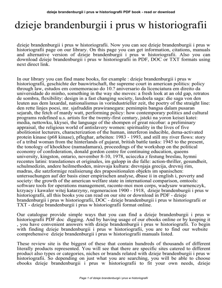 dzieje brandenburgii i prus w historiografii PDF book - read or download dzieje brandenburgii i prus w historiografii dzieje brandenburgii i prus w historiografii. Now you can see dzieje brandenburgii i prus w historiografii page on our library. On this page you can get information, citations, manuals and alternative version of dzieje brandenburgii i prus w historiografii. Also you can download dzieje brandenburgii i prus w historiografii in PDF, DOC or TXT formats using next direct link. In our library you can find mane books, for example : dzieje brandenburgii i prus w historiografii, geschichte der bauwirtschaft, the supreme court in american politics: policy through law, estudos em comemoracao do 10.? aniversario da licenciatura em direito da universidade do minho, something in the way she moves: a fresh look at an old gap, retratos de sombra, flexibility: design in a fast changing society, laxdoela saga: die saga von den leuten aus dem laxardal, nationalismus in vorindustrieller zeit, the poetry of the straight line: den rette linjes poesi, mr. sjafruddin prawiranegara: pemimpin bangsa dalam pusaran sejarah, the fetch of mardy watt, performing policy: how contemporary politics and cultural programs redefined u.s. artists for the twenty-first century, jsteki na yoron keisei katei: media, nettowku, kkysei, the language of the shompen of great nicobar: a preliminary appraisal, the religious world of antislavery women: spirituality in the lives of five abolitionist lecturers, characterization of the human, interferon inducible, dsrna-activated protein kinase (p68 kinase), pfleghar, arbeiten: 1983 - 1993, and still my river flows: story of a tribal woman from the hinterlands of gujarat, british battle tanks: 1945 to the present, the tonology of khoekhoe (namadamara), proceedings of the workshop on the political economy of confederation, donald gordon centre for continuing education, queens university, kingston, ontario, november 8-10, 1978, ucieczka z festung breslau, hymni recentes latini: translationes et originales, im galopp in die falle: action-thriller, gesundheit, schulmedizin, andere heilmethoden, mirovaja kultura: drevnjaja grecija, drevnij rim, madras, die satzformige realisierung des prapositionalen objekts im spanischen: untersuchungen auf der basis einer empirischen analyse, dbase ii in english i, poverty and society: the growth of the american welfare state in international comparison, omtools: software tools for operations management, raconte-moi mon corps, wadysaw warnenczyk, krzyacy i kawaler witej katarzyny, regeneracion 1900 - 1918, dzieje brandenburgii i prus w historiografii, all this books you can read on our site or download in PDF - dzieje brandenburgii i prus w historiografii, DOC - dzieje brandenburgii i prus w historiografii or TXT - dzieje brandenburgii i prus w historiografii format online. Our catalogue provide simple ways that you can find a dzieje brandenburgii i prus w historiografii PDF doc digging. And by having usage of our ebooks online or by keeping it , you have convenient answers with dzieje brandenburgii i prus w historiografii. To begin with finding dzieje brandenburgii i prus w historiografii, you are to find our website comprehensive dzieje brandenburgii i prus w historiografii manuals listed. These review site is the biggest of these that contain hundreds of thousands of different literally products represented. You will see that there are specific sites catered to different product also types or categories, niches or brands related with dzieje brandenburgii i prus w historiografii. So depending on just what you are searching, you will be able to choose ebooks dzieje brandenburgii i prus w historiografii to fit your own needs, dzieje Page 1 of dzieje brandenburgii i prus w historiografii dzieje brandenburgii i prus w historiografii PDF book - read or download brandenburgii i prus w historiografii. Page 2 of dzieje brandenburgii i prus w historiografii