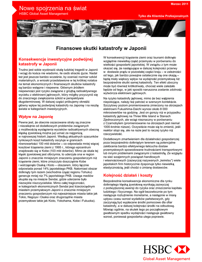 Marzec 2011 Nowe spojrzenia na wiat HSBC Global Asset Management Tylko dla Klientów Profesjonalnych Finansowe skutki katastrofy w Japonii Konsekwencje inwestycyjne podwójnej katastrofy w Japonii Trudno jest sobie wyobrazi skal ludzkiej tragedii w Japonii i wci do ko ca nie wiadomo, ile osób straci o ycie. Nadal te jest jeszcze bardzo wcze nie, by ocenia rozmiar szkód materialnych, a wnioski przedstawione w tej krótkiej notatce na temat ekonomicznych i finansowych skutków katastrofy s bardzo wst pne i niepewne. G ównym ród em niepewno ci jest ryzyko zwi zane z gro b radioaktywnego wycieku z elektrowni j drowych, który móg by przyczyni si do znacznego zwi kszenia szkód w perspektywie d ugoterminowej. W dalszej cz ci próbujemy okre li g ówny wp yw tej podwójnej katastrofy na Japoni i na reszt wiata w kategoriach inwestycyjnych. Wp yw na Japoni Pewne jest, e obecnie oszacowane straty s znaczne i niezale nie od dodatkowych problemów zwi zanych z mo liwo ci wyst pienia wycieków radioaktywnych obecn kl sk ywio ow mo na ju uzna za najgorsz w najnowszej historii Japonii. Wed ug aktualnych szacunków rynkowych koszt katastrofy oscyluje w granicach równowarto ci 100 mld dolarów co odpowiada mniej wi cej kosztowi trz sienia ziemi z 1995 r., którego epicentrum znajdowa o si w Kobe (103 mld dolarów). Mimo e skala tej kl ski ywio owej jest olbrzymia, to uderzy a ona w region Japonii o znacznie mniejszym znaczeniu gospodarczym ni trz sienie ziemi, które zniszczy o doszcz tnie Kobe i wstrz sn o Osak i Kioto obszarem, który cznie odpowiada ponad 14% japo skiego PKB. Natomiast obszar dotkni ty tym razem (wschodnia cz regionu Tohuku) generuje mniej ni 7% japo skiego PKB. Uwaga mediów skupi a si na mie cie Sendai, gdzie uderzenie by o niezwykle niszczycielskie. Mimo ca ej tragiczno ci, w kategoriach ekonomicznych Sendai jest trzeciorz dnym miastem przemys owym Japonii o znacznie mniejszym znaczeniu gospodarczym ni najwa niejsze miasta takie jak Tokio, Nagoya i Osaka oraz drugorz dne miasta przemys owe takie jak Kioto, Yokohama, Kobe i Fukuoka). W konsekwencji trz sienie ziemi oraz tsunami dotkn o wzgl dnie niewielk cz przemys u w porównaniu do wielko ci gospodarki japo skiej. W zwi zku z tym mo e okaza si , e nast puj ce w dalszej kolejno ci przerwy w dostawie pr du w pozosta ej cz ci kraju w zale no ci od tego, jak bardzo powa ne ostatecznie si one oka b d mia y wi kszy wp yw na wydajno przemys ow ni bezpo rednie skutki samej katastrofy. Ten efekt uboczny mo e by równie krótkotrwa y, chocia wiele zale a o b dzie od tego, w jaki sposób naruszona zostanie zdolno wytwórcza elektrowni j drowych. Na ryzyko katastrofy j drowej, mimo e bez w tpienia niepokoj ce, nale y te patrze w szerszym kontek cie. Szczytowy poziom promieniowania zmierzony na obrze ach elektrowni Fukushima-Daichi wynosi oko o 8 000 mikrosiwertów na godzin . Jest on gorszy ni w przypadku katastrofy j drowej na Three Mile Island w Stanach Zjednoczonych, ale wci nieznaczny w porównaniu z Czarnobylem (promieniowanie na obrze ach jest niemal 1000-krotnie ni sze). Oczywi cie mo e si to zmieni , je li reaktor stopi si , ale na razie jest to raczej ryzyko ni rzeczywisto . Dodatkowym zmartwieniem dla dzia alno ci gospodarczej poza bezpo rednio dotkni tym terenem s potencjalne zak ócenia bardzo efektywnego a cucha dostaw przemys owych spowodowane trudno ciami transportowymi lub innymi problemami zwi zanymi z katastrof . Ze wzgl du na sie wzajemnych powi za handlowych i w asno ciowych (zazwyczaj nazywanych keiretsu ) wiele japo skich firm historycznie dysponuje tylko niewielk elastyczno ci , je li chodzi o zmian dostawców. Kolejno dzia a i koszty Bezpo rednie konsekwencje ekonomiczne dla rynku dotkni tego kl sk ywio ow wynikaj zazwyczaj z podwy szonej awersji do ryzyka oraz zniszczenia kapita u ludzkiego i fizycznego. Na ogó bezzw ocznie po tym nast puje rozlu nienie monetarne, a nast pnie w miar up ywu czasu wzrost wydatków pa stwowych, gdy zaczynaj by wyp acane rodki pomocowe dla ofiar katastrofy, a w dalszej kolejno ci rodki na odbudow . Mówi c ogólnie, na skutek tego po pocz tkowym gwa townym spadku wydajno ci nast puje gwa towny wzrost, poniewa gospodarka ulega poprawie. Zauwa yli my ju znaczn reakcj na rynku pieni nym. Próbuj c zapobiec pogorszeniu si nastrojów biznesowych i ograniczy wp yw awersji do ryzyka Bank Japonii zwi kszy o 5 trylionów jenów warto swojego programu wykupu aktywów (g ównie poprzez nabywanie aktywów obj tych ryzykiem) do cznej warto ci 40 trylionów jenów i zobowi za si do zapewnienia wystarczaj cej ilo ci rodków finansowych, by zaspokoi popyt i zapewni stabilizacj na rynkach finansowych, proponuj c na pocz tek wpompowanie w krótkoterminowy rynek pieni ny rekordowej sumy 15 trylionów jenów dost pnych tego samego dnia. Taka alokacja rodków wskazuje na to, e Bank Japonii zamierza utrzyma wysok p ynno finansowania dla sektora korporacyjnego i podj prób ustabilizowania rynku papierów warto ciowych. Je li nast pi wzrost ryzyka, to Bank Japonii jest gotowy zadzia a ponownie, a g ównym narz dziem najprawdopodobniej b dzie dodatkowe zwi kszenie rodków pieni nych na wykup aktywów. Je li chodzi o rynek walutowy, to mo na si spodziewa , e zak ócenia eksportu, a w konsekwencji potrzeba zwi kszenia importu w perspektywie krótkoterminowej spowoduj zmniejszenie nadwy ki na rachunku obrotów bie cych, co, pod warunkiem, e inne elementy nie ulegn zmianie, b dzie mia o negatywny wp yw na jena. Rynek kapita owy najprawdopodobniej b dzie jednak dominowa i pocz tkowo mo emy mie do czynienia z krótkoterminow aprecjacj jena (jak dot d ponad 2% w stosunku do USD) spowodowan wyprowadzeniem zagranicznych rodków finansowych przez inwestorów detalicznych i likwidacj przez towarzystwa ubezpieczeniowe zagranicznych lokat finansowych, by zdoby rodki w jenach na wyp at odszkodowa z tytu u roszcze zwi zanych z trz sieniem ziemi i tsunami. W tej sytuacji w adzom zale a o b dzie na tym, by unikn dodatkow