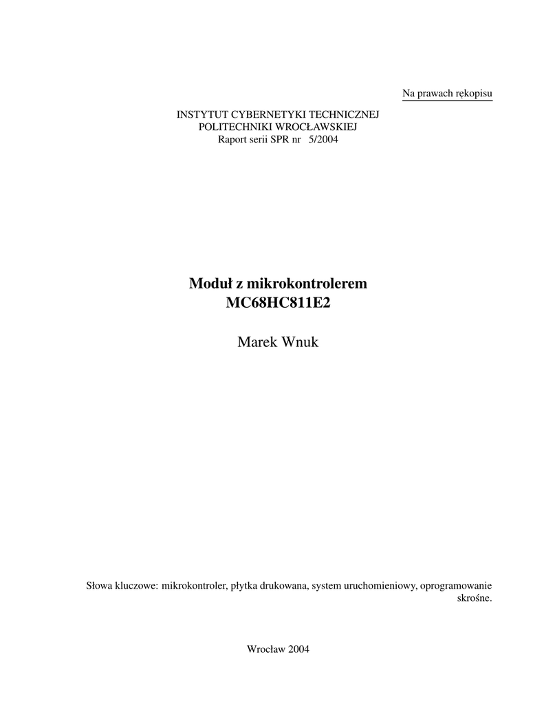 Na prawach rekopisu , INSTYTUT CYBERNETYKI TECHNICZNEJ POLITECHNIKI WROCŁAWSKIEJ Raport serii SPR nr 5/2004 Moduł z mikrokontrolerem MC68HC811E2 Marek Wnuk Słowa kluczowe: mikrokontroler, płytka drukowana, system uruchomieniowy, oprogramowanie skrośne. Wrocław 2004 Spis treści 1 Wstep , 2 2 Własności mikrokontrolera MC68HC811E2 2 3 Schemat i montaż 4 4 Złacza i sygnały , 4 5 Uruchamianie sprzetu , 4 6 Dokumentacje i oprogramowanie pomocnicze 7 Bibliografia 7 1 Wstep , Opisywana płytka zawiera 8-bitowy mikrokontroler MC68HC11E2 firmy Motorola oraz minimalny zestaw elementów towarzyszacych (rezonator kwarcowy, zworka do wyboru trybu pracy, rezystory , podciagaj ace wybrane sygnały do stanu wysokiego i kondensatory blokuj ace zasilanie). Wszyst, , , kie sygnały mikrokontrolera sa, wyprowadzone na złacza w standardowym rozstawie (0.1 “), co , umożliwia dołaczenie zewn etrznych rozszerzeń również przy użyciu uniwersalnej płytki drukowa, , nej. Ma to szczególne znaczenie przy projektach badawczych i dydaktycznyh, do których płytka jest przeznaczona. Widok modułu przedstawiono na rys. 1. widok z góry widok z dołu Rysunek 1: Wyglad , zmontowanej płytki 2 Własności mikrokontrolera MC68HC811E2 Mikrokontrolery firmy Motorola z rodziny HC11 sa, od wielu lat stosowane w bardzo wielu konstrukcjach sterowników i układów sensorycznych, w szczególności w robotyce. Sw a, poularność zawdzieczaj a, wydajnej jednostce centalnej (M68HC11), małemu poborowi mocy (zwłaszcza w try, bach enrgooszczednych) oraz dobremu wyposażeniu w układy wejścia/wyjścia (porty równoległe i , szeregowe, timery i przetwornik analogowo–cyfrowy). Podstawowe własności zastosowenej wersji mikrokontrolera to: • jednostka centralna M68HC11 • energooszczedne tryby pracy (stop, wait), , • 256 bajtów wbudowanej pamieci , RAM z możliwościa, wyboru adresu dostepu, , • 2048 bajtów wbudowanej pamieci , EEPROM z możliwościa, wyboru adresu dostepu, , • asynchroniczny interfejs szeregowy NRZ (SCI), • synchroniczny interfejs szeregowy urzadzeń zewnetrznych (SPI), , , 2 XTAL EXTAL XIRQ/ RESET V PPE INTERRUPT LOGIC ROM / EPROM - 0 EEPROM - 2048 M68HC11 CPU STROBE AND HANDSHAKE PARALLEL I/O SPI (SERIAL PERIPHEAL INTERFACE) A/D PORT D PORTB PORT C PC7/ADDR7/DATA7 PC6/ADDR6/DATA6 PC5/ADDR5/DATA5 PC4/ADDR4/DATA4 PC3/ADDR3/DATA3 PC2/ADDR2/DATA2 PC1/ADDR1/DATA1 PC0/ADDR0/DATA0 CONTROL PB7/ADDR15 PB6/ADDR14 PB5/ADDR13 PB4/ADDR12 PB3/ADDR11 PB2/ADDR10 PB1/ADDR9 PB0/ADDR8 CONTROL PORT A SCI (SERIAL COMMUNICATION INTERFACE) CONVERTER PORT E PE7/AN7 PE6/AN6 PE5/AN5 PE4/AN4 PE3/AN3 PE2/AN2 PE1/AN1 PE0/AN0 BUS EXPANSION ADDRESS/DATA PD5/SS PD4/SCK PD3/MOSI PD2/MISO PD1/TxD PD0/RxD BUS EXPANSION ADDRESS R/W AS RAM - 256 PA7/PAI PA6/OC2/OC1 PA5/OC3/OC1 PA4/OC4/OC1 PA3/OC5/IC4/OC1 PA2/IC1 PA1/IC2 PA0/IC3 TIMER SYSTEM OSC CLOCK/LOGIC IRQ STRB STRA PAI PULSE ACCUMULATOR COP OC2 OC3 OC4 OC5/IC4/OC1 IC1 IC2 IC3 PERIODIC INTERRUPT MODE CONTROL E STRB/R/W STRA/AS MODA/ MODB/ LIR V S T D B Y Rysunek 2: Struktura i zasoby MC68HC811E2 • 8-kanałowy, 8-bitowy przetwornik analogowo/cyfrowy, • 16-bitowy system timerów: – 3 IC (Input Capture), – 4 OC (Output Compare), – 1 kanał z możliwościa, wyboru (IC, OC), • 8-bitowy akumulator impulsów, • układ przerwań cyklicznych o programowalnym okresie, • COP watchdog (Computer Operates Properly), • 38 uniwersalnych wejść-wyjść binarnych: – 16 dwukierunkowych, – 11 wyłacznie wejściowych, , – 11 wyłacznie wyjściowych, , • obudowa PLCC 52. Strukture, i zasoby mikrokontrolera MC68HC811E2 [4] przedstawiono na rys. 2. 3 V RH V RL 3 Schemat i montaż Schemat modułu przedstawiono na rys. 3, a sposób montażu na płytce drukowanej na rys. 4. 1 W tab. 1 podano zestawienie użytych elementów. liczba wartość obudowa 4 1 4k7 10M 0805 0805 2 4 2 22p 100n 100u/6,3V 1206 1206 6032 1 8MHz HC49/S 1 MC68HC811E2 PLCC52 oznaczenie na schemacie rezystory R8, R9, R10, R11 R7 kondensatory C7, C10 C11, C12, C13, C14 C8, C9 rezonatory Q1 półprzewodniki IC1 Tablica 1: Zestawienie elementów modułu HC811E2 Na płytce zamontowano: mikrokontroler MC68HC811E2 w obudowie PLCC bez podstawki (IC1), rezonator kwarcowy 8MHz (Q1) wraz z elementami towarzyszacymi (C7, C10 - 22pF, R7 - 10MΩ), , kondensatory blokujace zasilanie (C11, C12, C13, C14 100nF, C8, C9 - 100µF) oraz rezystory , podciagaj ace sygnały wejściowe przerwań (IRQ, XIRQ), restartu (RESET) i wyboru trybu pracy , , (MODB) do stanu wysokiego (R8, R9, R10, R11 - 4.7kΩ). Wszystkie elementy poza R7 s a, zamontowane na wierzchniej stronie płytki. Tam również zamontowano zwork e, MODB służac , a, do wybory trybu pracy (Single Chip – Special Bootstrap). 4 Złacza i sygnały , Sygnały mikrokontrolera wyprowadzono na dwa dwurzedowe złacza (SL, SP) zawierajace po 26 , , , styków. Użycie listew wtykowych SLP zamontowanych od spodniej strony płytki pozwala wł aczyć , moduł do odpowiednich gniazd zamontowanych na innej płytce. Możliwe jest również użycie dwurzedowych listew stykowych zamontowanych od wierzchniej strony płytki w celu dokonania poł aczeń , , zewnetrznych przewodem taśmowym. , Rozmieszczenie sygnałów na złaczach SL i SP podano w tab. 2, a ich opis w tab. 3. Założenie zworki , MODB wymusza tryb Special Bootstrap pozwalajacy m.in. programować EEPROM w układzie. , 5 Uruchamianie sprzetu , Poprawnie zmontowany moduł nie wymaga uruchmiania. Przy wł aczonej zworce MODB proce, sor startuje w trybie Special Bootstrap i wystawia na TxD sygnał BREAK [3]. W celu załadowania 256 bajtów programu do pamieci RAM należy wysłać z zewnetrznego komputera znak $FF, a po , , odebraniu jego echa – 256 kolejnych bajtów w postaci binarnej (tryb transmisji: 1200, 8, N, 1). Odebrany blok jest ładowany do pamieci RAM i uruchamiany od adresu 0. Typowe jest załadowanie , w tym bloku programatora pamieci , EEPROM, który po uruchomieniu komunikuje s e, z komputerem 1 Pr