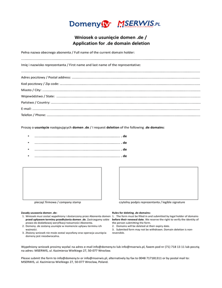 Wniosek o usunięcie domen .de / Application for .de domain deletion Pełna nazwa obecnego abonenta / Full name of the current domain holder: .............................................................................................................................................................................................. Imię i nazwisko reprezentanta / First name and last name of the representative: .............................................................................................................................................................................................. Adres pocztowy / Postal address: ........................................................................................................................................ Kod pocztowy / Zip code: ….................................................................................................................................................. Miasto / City: ........................................................................................................................................................................ Województwo / State: ......................................................................................................................................................... Państwo / Country: ............................................................................................................................................................... E-mail: .................................................................................................................................................................................. Telefon / Phone: ................................................................................................................................................................... Proszę o usunięcie następujących domen .de / I request deletion of the following .de domains: • ........................................................................................... . de • ........................................................................................... . de • ........................................................................................... . de • ........................................................................................... . de pieczęć firmowa / company stamp Zasady usuwania domen .de: 1. Wniosek musi zostać wypełniony i dostarczony przez Abonenta domen przed upływem terminu przedłużenia domen .de. Zastrzegamy sobie prawo do dodatkowej weryfikacji tożsamości Abonenta. 2. Domeny .de zostaną usunięte w momencie upływu terminu ich ważności. 3. Złożony wniosek nie może zostać wycofany oraz operacja usunięcia domeny jest nieodwracalna. czytelny podpis reprezentanta / legible signature Rules for deleting .de domains: 1. The form must be filled in and submitted by legal holder of domains before their renewal date. We reserve the right to verify the identity of the person submitting the form. 2. Domains will be deleted at their expiry date. 3. Submited form may not be withdrawn. Domain deletion is nonreversible. Wypełniony wniosek prosimy wysłać na adres e-mail [email protected] lub [email protected], faxem pod nr (71) 718 13 11 lub pocztą na adres: MSERWIS, ul. Kazimierza Wielkiego 27, 50-077 Wrocław. Please submit the form to [email protected] or [email protected], alternatively by fax to 0048 717181311 or by postal mail to: MSERWIS, ul. Kazimierza Wielkiego 27, 50-077 Wroclaw, Poland.