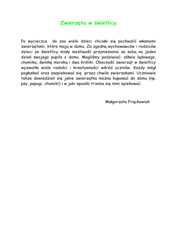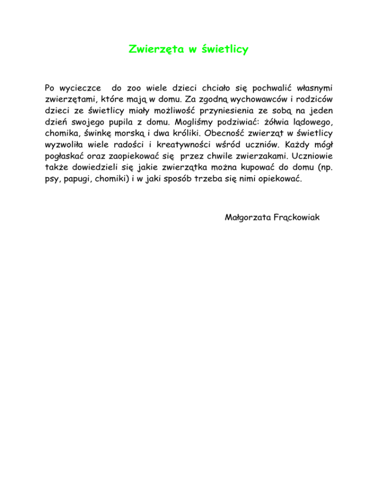 Zwierzęta w świetlicy Po wycieczce do zoo wiele dzieci chciało się pochwalić własnymi zwierzętami, które mają w domu. Za zgodną wychowawców i rodziców dzieci ze świetlicy miały możliwość przyniesienia ze sobą na jeden dzień swojego pupila z domu. Mogliśmy podziwiać: żółwia lądowego, chomika, świnkę morską i dwa króliki. Obecność zwierząt w świetlicy wyzwoliła wiele radości i kreatywności wśród uczniów. Każdy mógł pogłaskać oraz zaopiekować się przez chwile zwierzakami. Uczniowie także dowiedzieli się jakie zwierzątka można kupować do domu (np. psy, papugi, chomiki) i w jaki sposób trzeba się nimi opiekować. Małgorzata Frąckowiak