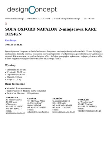 www.momastudio.pl | INFOLINIA.: 22 2437671 | e-mail: [email protected] | 2017-03-08 SOFA OXFORD NAPALON 2-miejscowa KARE DESIGN Kare Design 3987.00 3588.30 Dwumiejscowa klasyczna sofa Oxford swoim designiem nawiązuje do stylu chesterfield. Uroku dodają jej zaokrąglone kształty oparcia, elegancka skórzana tapicerka oraz łączenia na podłokietnikach wykończone napami. Pikowane oparcia podkreślają ten efekt. Sofa jest precyzyjne wykonana z najlepszych materiałów. Będzie wyjątkowo eleganckim dodatkiem do każdego salonu. Wymiary ● ● ● ● ● Szerokość: 95.00 cm Wysokość: 76.00 cm Głębokość: 0.00 cm Długość: 160 cm Waga: 37.00 kg Dane techniczne ● ● ● Materiał: drewno sosnowe Tapicerka przód: Tkanina 100% poliuretan Tapicerka: Tkanina: 100% poliester WARSZAWA Al. Krakowska 6a 05-090 Janki k/Warszawy tel: +48 22 2437671 +48 664 890 337 e-mail: [email protected] GDAŃSK CH RENTAL PARK ul. Przywidzka 7 80-001 Gdańsk tel: +48 58 3508790 e-mail: [email protected] KRAKÓW ul. Zakopiańska 56 30-418 Kraków tel: +48 505 436 669 tel: +48 12 3070112 e-mail: [email protected] WROCŁAW ul. Wrocławska 7 55-040 Wrocław tel: +48 71 3461885 e-mail: [email protected]