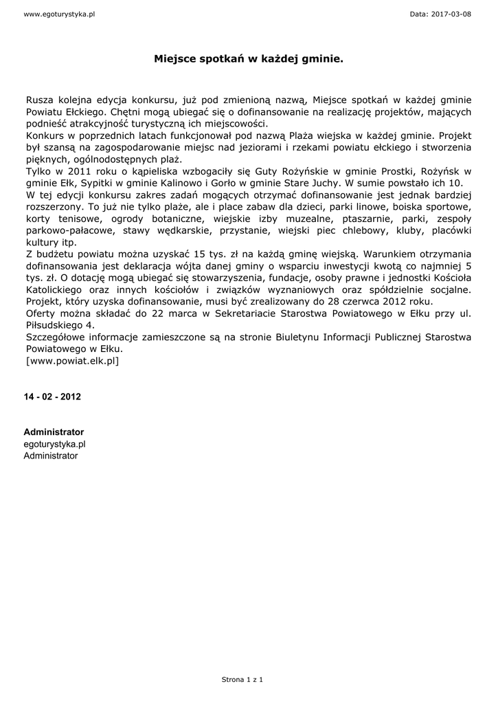 www.egoturystyka.pl Data: 2017-03-08 Miejsce spotkań w każdej gminie. Rusza kolejna edycja konkursu, już pod zmienioną nazwą, Miejsce spotkań w każdej gminie Powiatu Ełckiego. Chętni mogą ubiegać się o dofinansowanie na realizację projektów, mających podnieść atrakcyjność turystyczną ich miejscowości. Konkurs w poprzednich latach funkcjonował pod nazwą Plaża wiejska w każdej gminie. Projekt był szansą na zagospodarowanie miejsc nad jeziorami i rzekami powiatu ełckiego i stworzenia pięknych, ogólnodostępnych plaż. Tylko w 2011 roku o kąpieliska wzbogaciły się Guty Rożyńskie w gminie Prostki, Rożyńsk w gminie Ełk, Sypitki w gminie Kalinowo i Gorło w gminie Stare Juchy. W sumie powstało ich 10. W tej edycji konkursu zakres zadań mogących otrzymać dofinansowanie jest jednak bardziej rozszerzony. To już nie tylko plaże, ale i place zabaw dla dzieci, parki linowe, boiska sportowe, korty tenisowe, ogrody botaniczne, wiejskie izby muzealne, ptaszarnie, parki, zespoły parkowo-pałacowe, stawy wędkarskie, przystanie, wiejski piec chlebowy, kluby, placówki kultury itp. Z budżetu powiatu można uzyskać 15 tys. zł na każdą gminę wiejską. Warunkiem otrzymania dofinansowania jest deklaracja wójta danej gminy o wsparciu inwestycji kwotą co najmniej 5 tys. zł. O dotację mogą ubiegać się stowarzyszenia, fundacje, osoby prawne i jednostki Kościoła Katolickiego oraz innych kościołów i związków wyznaniowych oraz spółdzielnie socjalne. Projekt, który uzyska dofinansowanie, musi być zrealizowany do 28 czerwca 2012 roku. Oferty można składać do 22 marca w Sekretariacie Starostwa Powiatowego w Ełku przy ul. Piłsudskiego 4. Szczegółowe informacje zamieszczone są na stronie Biuletynu Informacji Publicznej Starostwa Powiatowego w Ełku. [www.powiat.elk.pl] 14 - 02 - 2012 Administrator egoturystyka.pl Administrator Strona 1 z 1