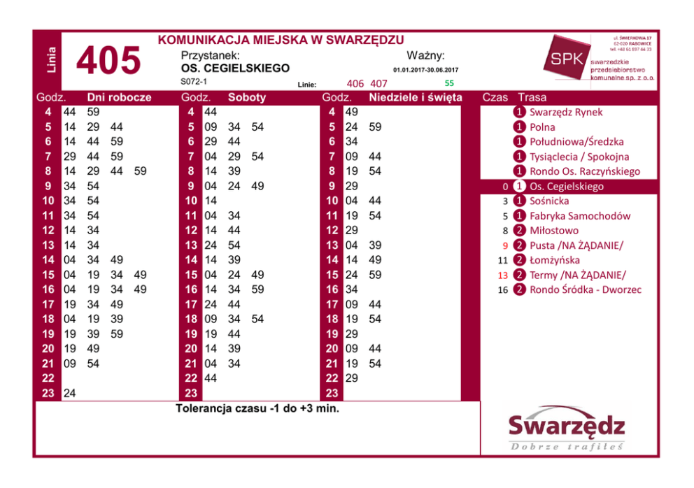 Linia Godz. 4 44 5 14 6 14 7 29 8 14 9 34 10 34 11 34 12 14 13 14 14 04 15 04 16 04 17 19 18 04 19 19 20 19 21 09 22 23 24 405 Dni robocze 59 29 44 44 59 44 59 29 44 59 54 54 54 34 34 34 49 19 34 49 19 34 49 34 49 19 39 39 59 49 54 KOMUNIKACJA MIEJSKA W SWARZĘDZU Ważny: Przystanek: OS. CEGIELSKIEGO 406 Linie: Godz. Soboty Godz. 4 44 4 49 5 09 34 54 5 24 6 29 44 6 34 7 04 29 54 7 09 8 14 39 8 19 9 04 24 49 9 29 10 14 10 04 11 04 34 11 19 12 14 44 12 29 13 24 54 13 04 14 14 39 14 14 15 04 24 49 15 24 16 14 34 59 16 34 17 24 44 17 09 18 09 34 54 18 19 19 19 44 19 29 20 14 39 20 09 21 04 34 21 19 22 44 22 29 23 23 Tolerancja czasu -1 do +3 min. S072-1 01.01.2017-30.06.2017 55 407 Niedziele i święta 59 44 54 44 54 39 49 59 44 54 44 54 Czas Trasa ❶ Swarzędz Rynek ❶ Polna ❶ Południowa/Średzka ❶ Tysiąclecia / Spokojna ❶ Rondo Os. Raczyńskiego 0 ❶ Os. Cegielskiego 3 ❶ Sośnicka 5 ❶ Fabryka Samochodów 8 ❷ Miłostowo 9 ❷ Pusta /NA ŻĄDANIE/ 11 ❷ Łomżyńska 13 ❷ Termy /NA ŻĄDANIE/ 16 ❷ Rondo Śródka - Dworzec