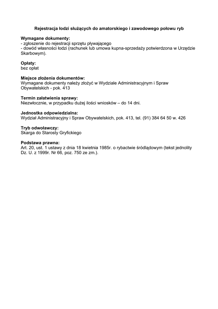Rejestracja łodzi służących do amatorskiego i zawodowego połowu ryb Wymagane dokumenty: - zgłoszenie do rejestracji sprzętu pływającego - dowód własności łodzi (rachunek lub umowa kupna-sprzedaży potwierdzona w Urzędzie Skarbowym). Opłaty: bez opłat Miejsce złożenia dokumentów: Wymagane dokumenty należy złożyć w Wydziale Administracyjnym i Spraw Obywatelskich - pok. 413 Termin załatwienia sprawy: Niezwłocznie, w przypadku dużej ilości wniosków – do 14 dni. Jednostka odpowiedzialna: Wydział Administracyjny i Spraw Obywatelskich, pok. 413, tel. (91) 384 64 50 w. 426 Tryb odwoławczy: Skarga do Starosty Gryfickiego Podstawa prawna: Art. 20, ust. 1 ustawy z dnia 18 kwietnia 1985r. o rybactwie śródlądowym (tekst jednolity Dz. U. z 1999r. Nr 66, poz. 750 ze zm.).