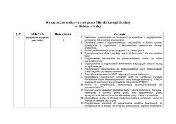 Wykaz zadań realizowanych przez Miejski Zarząd Oświaty w Bielsku – Białej L.P. 1. SEKCJA Stanowisko do spraw kadr MZO Ilość etatów 1 Zadanie 1. Zakładanie i prowadzenie akt osobowych pracowników z uwzględnieniem wymaganej dokumentacji pracowników. 2. Określanie zadań i odpowiedzialności pracowników w formie zakresu obowiązków w uzgodnieniu z bezpośrednim przełożonym danego pracownika. 3. Prowadzenie ewidencji spraw związanych z czasem pracy. 4. Sporządzanie wniosków o wypłatę nagród jubileuszowych dla pracowników MZO. 5. Przygotowanie dokumentów do przeprowadzenia naboru na wolne stanowisko pracy. 6. Organizowanie i przygotowanie dokumentów dotyczących odbycia służby przygotowawczej. 7. Przygotowanie dokumentacji do przeprowadzenia ocen pracowniczych, przestrzeganie zachowania terminów. 8. Sporządzanie sprawozdań GUS dotyczących spraw kadrowych. 9. Sporządzanie miesięcznych deklaracji wpłat na Państwowy Fundusz Rehabilitacji Osób Niepełnosprawnych oraz obsługa aplikacji E- PFRON służącej do elektronicznego przesyłania dokumentów PFRON. 10. Pomoc w kompletowaniu dokumentacji emerytalno-rentowej dla pracowników MZO. 11. Opracowywanie zarządzeń Dyrektora MZO ( strona techniczna, formalna i rejestrowa) z zakresu prawa pracy oraz regulaminów: pracy, wynagradzania, naboru na wolne stanowisko pracy, oceny pracowników. 12. Sporządzanie umów na obsługę medyczną (badania okresowe), umów na obsługę w zakresie bhp i p.poż. 13. Przygotowanie informacji do zaplanowania środków finansowych na wynagrodzenia na kolejny rok (nagrody jubileuszowe, odprawy emerytalno- rentowe, świadczenia socjalne). 14. Nadzór nad terminowością wykonania badań okresowych, szkoleń bhp i p.poż. oraz zakupu odzieży ochronnej dla pracowników. 15. Wystawianie zaświadczeń o zatrudnieniu na prośbę pracowników. 2. 3. Stanowisko do spraw zarządzania zasobami ludzkimi/Administrat or Bezpieczeństwa Informacji Stanowisko do spraw rozliczeń ZUS 1 1 1.Opracowywanie, wdrażanie, doskonalenie, nadzorowanie oraz kontrola systemu zarządzania zasobami ludzkimi. 2. Projektowanie i realizacja polityki szkoleniowej w MZO. 3. Projektowanie rozwiązań organizacyjnych w odniesieniu do procesów realizowanych w MZO. 4. Koordynowanie procesu adaptacji nowo zatrudnionych pracowników. 5.Budowanie, wdrażanie i monitorowanie systemów motywacyjnych oraz systemów wynagrodzeń. 6. Wspieranie Dyrekcji w konsultacjach z reprezentacjami pracowników. 7.Pomoc w rozwiązywaniu konfliktów w tym sposobów rozstawania się z pracownikiem. 8.Wsparcie dla kierowników, specjalistów koordynujących w wykonywaniu zadań z zakresu zarządzania. 9. Wdrażanie i nadzorowanie działań z zakresu komunikacji wewnętrznej. 10. Administracja systemem BIP. 11.Raportowanie i analiza informacji ze spotkań z kierownikami, specjalistami koordynującymi. 12.Przestrzeganie stosowania środków technicznych i organizacyjnych zapewniających ochronę przetwarzania danych osobowych-pełnienie funkcji Administratora Bezpieczeństwa Informacji. 13.Koordynowanie i monitorowanie zadań z zakresu funkcjonowania kontroli zarządczej w MZO. 1. Analiza i wykonywanie korekt w dokumentacji ZUS w zakresie wszystkich obsługiwanych placówek oświatowych 2. Kontrola wewnętrzna rozliczeń stanów kont ZUS 3. Obsługa i administracja systemem rozliczeń z ZUS – „Płatnik” 4. Monitorowanie i raportowanie rozbieżności w systemach informatycznych ( tj. płacowym „Płace-Kadry” oraz „Płatnik”) 4. Stanowisko inspektora nadzoru inwestorskiego 1 5. Nadzór nad prawidłowością zaimplementowanych zmian w w/w systemach 1 Sprawowanie nadzoru inwestorskiego nad realizacją robót budowlanych wykonywanych w placówkach oświatowych prowadzonych przez Miasto Bielsko-Biała. 2 Przeprowadzanie okresowej kontroli technicznej utrzymania obiektów budowlanych placówek oświatowych. 3 4 5 5. Sekcja Informatyki 3 Przygotowanie projektów wieloletnich planów inwestycyjnych placówek oświatowych. Współpraca z Wydziałem Inwestycji UM w zakresie remontów realizowanych w placówkach oświatowych. Weryfikacja wniosków o dokonanie remontów budowlanych w placówkach oświatowych wynikających z awarii. 1. Określanie potrzeb i budżetu na zakupy sprzętu teleinformatycznego dla placówek oświatowych 2. Sporządzanie dokumentacji na potrzeby procedur zakupowych sprzętu, rozeznanie rynku 3. Montaż i instalacja sprzętu komputerowego, konfiguracja połączeń sieciowych 4. Okresowe przeglądy urządzeń komputerowych 5. Serwis upgrade i wymiana zużytych urządzeń 6. Analiza potrzeb i budżetu na zakupy oprogramowania 7. Sporządzanie dokumentacji na potrzeby procedur zakupowych oprogramowania 8. Wdrożenie oprogramowania, szkolenia z systemów informatycznych 9. Utrzymanie i rozwój systemów, analiza ich wykorzystania, sugerowanie zmian 10. Wymiana przestarzałych technologicznie systemów na nowsze 11. Wdrożenie i przyjęcie do stosowania dokumentacji dotyczącej integracji baz danych, sposobu przepływu informacji pomiędzy systemami 12. Wdrożenie i utrzymanie integracji systemów już istniejących oraz przewidzianych do wdrożenia 13. Określenie zasad i dbałość o bezpieczeństwo już wdrożonych systemów 6. Zespół Radców Prawnych 2 7. Sekcja mienia oświatowego i organizacji MZO 9,64 informatycznych 1. Konsultacje i porady prawne 2. Opracowywanie wyjaśnień i opinii prawnych 3. Opiniowanie pod względem formalno – prawnym umów cywilnoprawnych, których stroną jest MZO lub placówka oświatowa prowadzona przez Miasto Bielsko-Biała 4. Zastępstwa procesowe w sprawach, w których stroną jest MZO lub placówka oświatowa prowadzona przez Miasto Bielsko-Biała 5. Świadczenie pomocy prawnej dla placówek oświatowych prowadzonych przez Miasto Bielsko-Biała 1. Prowadzenie spraw związanych z administrowaniem budynku MZO. 2. Nadzór nad sprawami związanymi z administrowaniem nieruchomościa