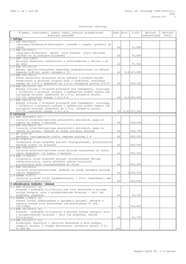 ZSNr.1 od + asf.LE Zuzia (C) DataComp 1994-2009(lic. 260) strona nr: 1 Kosztorys ofertowy Element, asortyment, rodzaj robót, pozycja przedmiarowa Jedn. Krot. Ilość Wartość podstawy nakładów jednostkowa 1 wykopy 1.1 KNR 404/302/2 -Analogia Rozebranie betonowych schodów i zsypów grubości do 100cm m3 11,090 1.2 KNR 231/815/1 -Analogia Rozebranie opaski przy budynku płyty betonowe 35x35x5·cm na podsypce piaskowej m2 56,000 1.3 KNR 1323/108/5 Analogia Rozbiórki nawierzchni z asfaltobetonu i betonu o gr do 20cm m2 87,950 1.4 KNR 201/221/9 Wykopy jamiste wykonywane koparkami podsiębiernymi na odkład, koparka 0,60·m3, grunt kategorii IV m3 0,8 447,000 1.5 KNR 201/321/2 Pełne umocnienie pionowych ścian wykopów liniowych balami drewnianymi w gruntach suchych wraz z rozbiórką, szerokość wykopu do 1.0·m i głębokość do 3.0·m, kategoria gruntu III-IV m2 234,150 1.6 KNR 201/317/2 (2) Wykopy liniowe o ścianach pionowych pod fundamenty, rurociągi i kolektory w gruntach suchych z wydobyciem urobku łopatą lub wyciągiem ręcznym, głębokość do 1.5·m, kategoria gruntu III-IV, szerokość wykopu 1.6-2.5·m m3 0,2 250,600 1.7 KNR 201/317/5 (2) Wykopy liniowe o ścianach pionowych pod fundamenty, rurociągi i kolektory w gruntach suchych z wydobyciem urobku łopatą lub wyciągiem ręcznym, głębokość do 3.0·m, kategoria gruntu III-IV, szerokość wykopu 1.6-2.5·m m3 0,30 375,300 2 izolacje 2.1 KNR 202/604/5 (1) Izolacje przeciwwilgociowe powierzchni poziomych, papą na lepiku na zimno, 1·warstwa m2 126,140 2.2 KNR 202/604/4 (1) Izolacje przeciwwilgociowe powierzchni poziomych, papą na lepiku na gorąco, dodatek za każdą następną warstwę m2 126,140 2.3 BC 2/607/6 Analogia -zaciągnięcie siatki zaprawą klejową 2 x m2 320,250 2.4 BC 2/607/6 Ocieplenie ścian budynków płytami styropianowymi, przyklejenie warstwy siatki na ścianach m2 320,250 2.5 KNR 202/603/7 Izolacje przeciwwilgociowe scian pionowa wykonywane na zimno, lepik dysperbit na zimno, 1·warstwa m2 320,250 2.6 KNR 17/2609/1 Ocieplenie ścian budynków płytami styropianowymi metodą lekką-mokrą przy użyciu gotowych zapraw klejących, przyklejenie płyt styropianowych do ścian m2 320,250 2.7 KNR 202/603/2 Izolacje przeciwwilgociowe dodatek za każdą następną warstwę lepiku dysperbit m2 3 320,250 2.8 KNNRW 3/207/1 Izolacje pionowe ścian fundamentowych, z folii kubełkowej, bez gruntowania powierzchni m2 320,250 3 odwodnienie budynku -drenaż 3.1 KNR 201/610/2 (2) Drenaże - podsypka filtracyjna pod rure drenarske w gotowym suchym wykopie, wraz z przygotowaniem kruszywa - żwir lub pospółka, pospółka m3 12,132 3.2 KNKRB 1/438/4 (1) Drenaż rurowy jednorzędowy w uprzednio przygot. obsypce w wykopie suchym rury kamionkowe lub perforowane Fi nom. 100-150mm m 144,800 3.3 KNR 201/610/2 (1) Drenaże - podsypka filtracyjna w gotowym suchym wykopie, wraz z przygotowaniem kruszywa - żwir lub pospółka, żwirek filtracyjny m3 21,720 3.4 KNR 201/621/1 (1) Studzienki rewizyjne i zbiorcze drenażowe w dnie wykopu, osadniki piasku, z kręgów betonowych, kategoria gruntu I-II, Fi·800·mm szt 5 Wartość netto Zespół Szkół Nr. 1 w Sanoku ZSNr.1 od + asf.LE Zuzia (C) DataComp 1994-2009(lic. 260) strona nr: 2 Element, asortyment, rodzaj robót, pozycja przedmiarowa Jedn. Krot. Ilość Wartość podstawy nakładów jednostkowa 3.5 KNBK 2/303/9 Wykopy nieumocnione wykonywane na zewnątrz budynku zasypanie wykopów ziemia z ukopów z 1-przerzutem na odległość do 3 m z ubiciem warstwami co 20 cm w gruncie kategorii IV (poz 169) m3 319,080 4 płytka odbojowa +schody+ dywanik asfaltowy+ parking 4.1 KNR 231/102/1 Koryta wykonywane na poszerzeniach, na jezdniach, grunt kategorii II-IV, głębokość 10·cm m2 86,880 4.2 KNR 231/102/2 Koryta wykonywane na poszerzeniach, na jezdniach, grunt kategorii II-IV, dodatek każde dalsze 5·cm głębokości m2 2 86,880 4.3 KNR 202/218/1 (2) Schody żelbetowe, stopnie betonowe zewnętrzne i wewnętrzne na gotowym podłożu, beton podawany pompą m3 4,480 4.4 KNR 231/114/5 Podbudowy z kruszyw, tłuczeń, warstwa dolna, grubość warstwy po zagęszczeniu 15·cm m2 144,800 4.5 KNR 231/407/3 Obrzeża betonowe, 30x8·cm na podsypce piaskowej z wypełnieniem spoin piaskiem m 165,00 4.6 KNR 231/314/1 Nawierzchnie z mieszanki asfaltu lanego (warstwa ścieralna), mieszanka grysowa, grubość warstwy 2·cm m2 600,380 4.7 KNR 231/313/2 Nawierzchnie z mieszanki asfaltu lanego (warstwa wiążąca), mieszanka grysowa, dodatek za każdy dalszy 1·cm m2 3 600,380 4.8 KNRW 220/116/1 Analogia Kraty ściekowe typu cięzkiego drogowe szt 8 4.9 KNR 231/502/6 Chodniki z płyt betonowych, 50x50x7·cm na podsypce piaskowej z wypełnieniem spoin piaskiem m2 139,320 5 wywóz gruzu 5.1 KNR 401/108/7 Wywóz samochodami samowyładowczymi do 1·km, grunt kategorii IV m3 26,693 5.2 KNR 401/108/8 Wywóz samochodami samowyładowczymi, ziemia, dodatek za każdy następny 1·km m3 5 26,693 Wartość netto Zespół Szkół Nr. 1 w Sanoku ZSNr.1 od + asf.LE Zuzia (C) DataComp 1994-2009(lic. 260) strona nr: 3 Zestawienie robocizny Lp. 1. 2. 3. 4. 5. 6. 7. 8. 9. 10. 11. 12. 13. Nazwa zawodu Jedn. Ilość Betoniarze grupa II . . . . . . . . . . . . . . . . . . . . . . . . . . . . . . . . r-g 22,62443 Bitumiarze grupa III . . . . . . . . . . . . . . . . . . . . . . . . . . . . . . . . r-g 60,87853 Brukarze grupa II . . . . . . . . . . . . . . . . . . . . . . . . . . . . . . . . . r-g 50,30228 Cieśle grupa I . . . . . . . . . . . . . . . . . . . . . . . . . . . . . . . . . . . r-g 77,52707 Cieśle grupa II . . . . . . . . . . . . . . . . . . . . . . . . . . . . . . . . . . r-g 67,8272 Dekarze grupa II . . . . . . . . . . . . . . . . . . . . . . . . . . . . . . . . . . r-g 82,60011 Monter grupa II . . . . . . . . . . . . . . . . . . . . . . . . . . . . . . . . . . r-g 144,85 Robotnicy . . . . . . . . . . . . . . . . . . . . . . . . . . . . . . . . . . . . . r-g 251,7165 Robotnicy budowlani . . . . . . . .