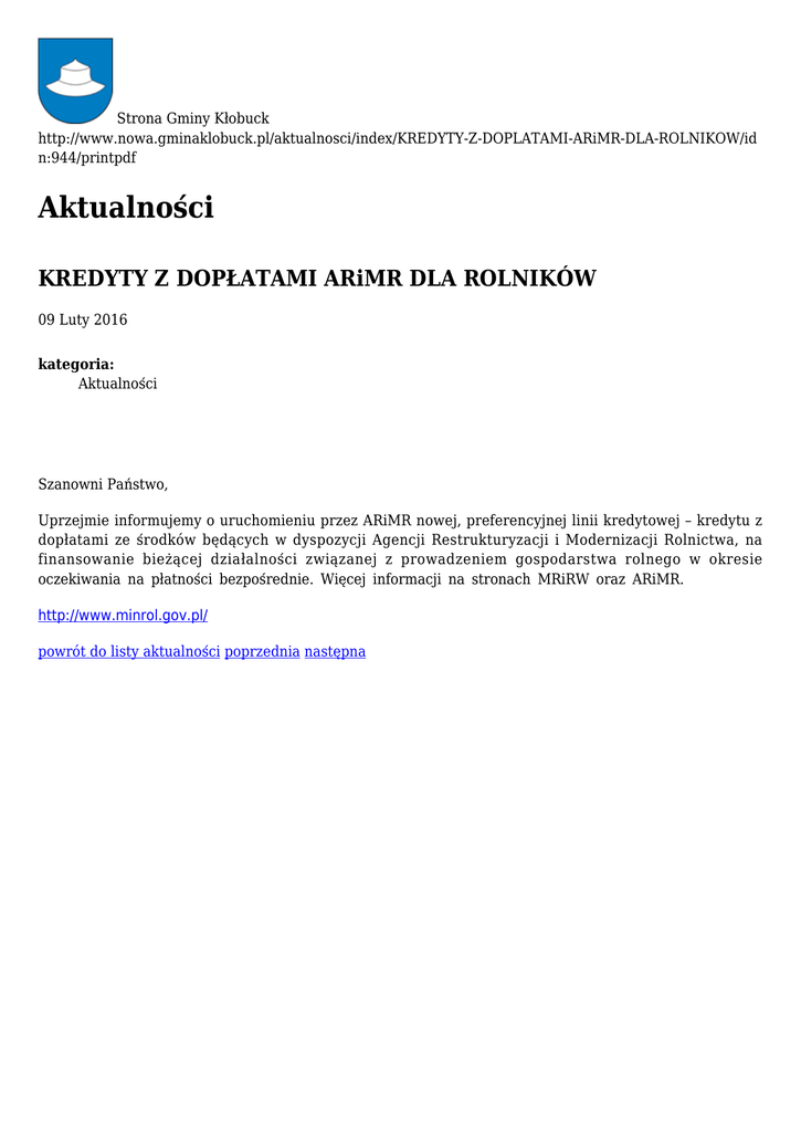 Strona Gminy Kłobuck http://www.nowa.gminaklobuck.pl/aktualnosci/index/KREDYTY-Z-DOPLATAMI-ARiMR-DLA-ROLNIKOW/id n:944/printpdf Aktualności KREDYTY Z DOPŁATAMI ARiMR DLA ROLNIKÓW 09 Luty 2016 kategoria: Aktualności Szanowni Państwo, Uprzejmie informujemy o uruchomieniu przez ARiMR nowej, preferencyjnej linii kredytowej – kredytu z dopłatami ze środków będących w dyspozycji Agencji Restrukturyzacji i Modernizacji Rolnictwa, na finansowanie bieżącej działalności związanej z prowadzeniem gospodarstwa rolnego w okresie oczekiwania na płatności bezpośrednie. Więcej informacji na stronach MRiRW oraz ARiMR. http://www.minrol.gov.pl/ powrót do listy aktualności poprzednia następna