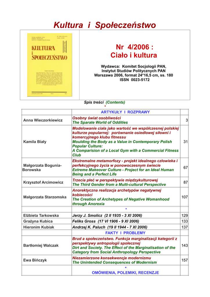 Kultura i Społeczeństwo Nr 4/2006 : Ciało i kultura Wydawca: Komitet Socjologii PAN, Instytut Studiów Politycznych PAN Warszawa 2006, format 24*16,5 cm, ss. 180 ISSN 0023-5172 Spis treści (Contents) * ARTYKUŁY I ROZPRAWY Anna Wieczorkiewicz Kamila Biały Małgorzata BoguniaBorowska Krzysztof Arcimowicz Małgorzata Starzomska Osobny świat osobliwości The Sparate World of Oddities 3 Modelowanie ciała jako wartość we współczesnej polskiej kulturze popularnej: porównanie osiedlowej siłowni i komercyjnego klubu fitnessu Moulding the Body as a Value in Contemporary Polish 31 Popular Culture: A Comparision of a Local Gym with a Commercial Fitness Club Ekstremalne metamorfozy - projekt idealnego człowieka i perfekcyjnego życia w ponowoczesnym świecie 67 Extreme Makeover Culture - Project for an Ideal Human Being and a Perfect Life Trzecia płeć w perspektywie międzykulturowej 87 The Third Gender from a Multi-cultural Perspective Anorektyczna realizacja archetypów negatywnej kobiecości 107 The Creation of Archetypes of Negative Womanhood through Anorexia * Elżbieta Tarkowska Grażyna Kubica Jerzy J. Smolicz (2 II 1935 - 3 XI 2006) Feliks Gross (17 VI 1906 - 9 XI 2006) 129 133 Hieronim Kubiak Andrzej K. Paluch (19 II 1944 - 7 XI 2006) FAKTY I PROBLEMY 137 Bartłomiej Walczak Brud a społeczeństwo. Funkcja marginalizacji kategorii z perspektywy antropologii społecznej Dirt and Society. The Effect of the Marginalisation of the Category from Social Anthropology Perspective 143 Ewa Bińczyk Niezamierzone konsekwencje modernizmu The Unintended Consequences of Modernism 157 * OMÓWIENIA, POLEMIKI, RECENZJE (Books Review and Discussions) Anna Krajewska, Aneta Gawkowska Ciało - triumfalny powrót? (rec.: Jacek Maria Kurczewski 169 i in., Praktyki cielesne, Warszawa 2006) Elżbieta Tarkowska Upośledzenie umysłowe w ujęciu socjologicznym (rec.: Agnieszka Kumaniecka-Wiśniewska, Kim jestem? Tożsamość kobiet upośledzonych umysłowo, Warszawa 2006) Ewa Malinowska Joanna Zalewska Być kobietą, być mężczyzną w Ameryce! (rec.: Claire M. Renzetti, Daniel J. Curran, Kobiety, mężczyźni i społeczeństwo, Warszawa 2005) Trzeci wiek jako kontynuacja młodości (rec.: Chris Gilleard, Paul Higgs, Contexts of Ageing: Class, Cohort and Community, Cambridge 2005) Contents 172 175 178 181