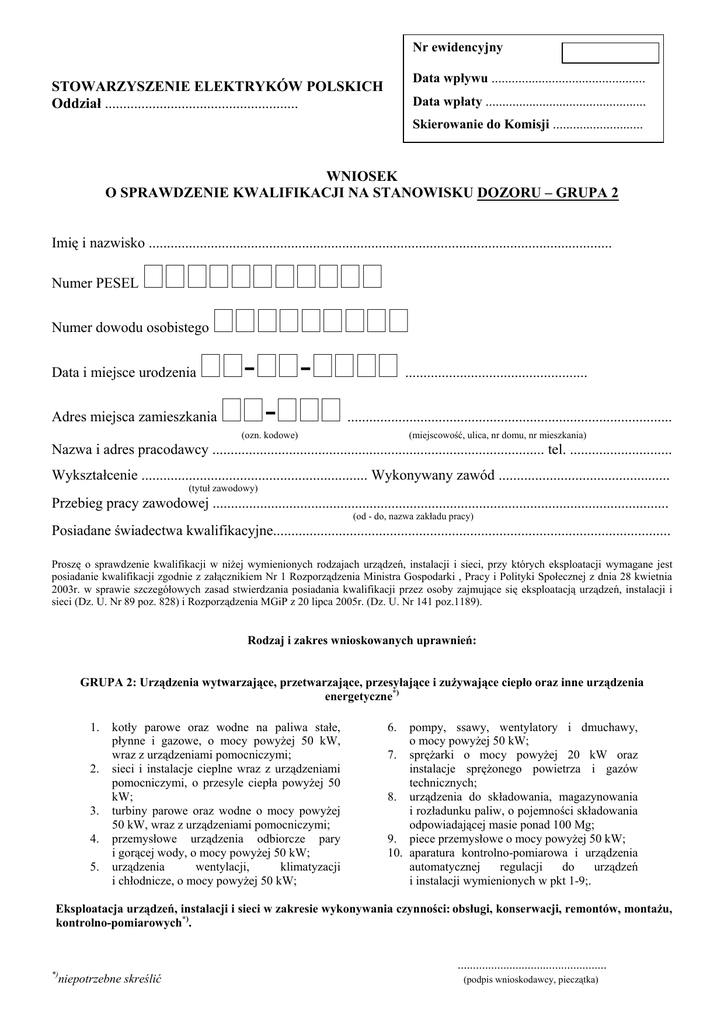 Nr ewidencyjny Data wpływu .............................................. STOWARZYSZENIE ELEKTRYKÓW POLSKICH Oddział ..................................................... Data wpłaty ................................................ Skierowanie do Komisji ........................... WNIOSEK O SPRAWDZENIE KWALIFIKACJI NA STANOWISKU DOZORU – GRUPA 2 Imię i nazwisko ............................................................................................................................... Numer PESEL -- - Numer dowodu osobistego Data i miejsce urodzenia .................................................. Adres miejsca zamieszkania ......................................................................................... (ozn. kodowe) (miejscowość, ulica, nr domu, nr mieszkania) Nazwa i adres pracodawcy ........................................................................................... tel. ............................ Wykształcenie .............................................................. Wykonywany zawód ............................................... (tytuł zawodowy) Przebieg pracy zawodowej ............................................................................................................................. (od - do, nazwa zakładu pracy) Posiadane świadectwa kwalifikacyjne............................................................................................................. Proszę o sprawdzenie kwalifikacji w niżej wymienionych rodzajach urządzeń, instalacji i sieci, przy których eksploatacji wymagane jest posiadanie kwalifikacji zgodnie z załącznikiem Nr 1 Rozporządzenia Ministra Gospodarki , Pracy i Polityki Społecznej z dnia 28 kwietnia 2003r. w sprawie szczegółowych zasad stwierdzania posiadania kwalifikacji przez osoby zajmujące się eksploatacją urządzeń, instalacji i sieci (Dz. U. Nr 89 poz. 828) i Rozporządzenia MGiP z 20 lipca 2005r. (Dz. U. Nr 141 poz.1189). Rodzaj i zakres wnioskowanych uprawnień: GRUPA 2: Urządzenia wytwarzające, przetwarzające, przesyłające i zużywające ciepło oraz inne urządzenia energetyczne*) 1. 2. 3. 4. 5. kotły parowe oraz wodne na paliwa stałe, płynne i gazowe, o mocy powyżej 50 kW, wraz z urządzeniami pomocniczymi; sieci i instalacje cieplne wraz z urządzeniami pomocniczymi, o przesyle ciepła powyżej 50 kW; turbiny parowe oraz wodne o mocy powyżej 50 kW, wraz z urządzeniami pomocniczymi; przemysłowe urządzenia odbiorcze pary i gorącej wody, o mocy powyżej 50 kW; urządzenia wentylacji, klimatyzacji i chłodnicze, o mocy powyżej 50 kW; 6. pompy, ssawy, wentylatory i dmuchawy, o mocy powyżej 50 kW; 7. sprężarki o mocy powyżej 20 kW oraz instalacje sprężonego powietrza i gazów technicznych; 8. urządzenia do składowania, magazynowania i rozładunku paliw, o pojemności składowania odpowiadającej masie ponad 100 Mg; 9. piece przemysłowe o mocy powyżej 50 kW; 10. aparatura kontrolno-pomiarowa i urządzenia automatycznej regulacji do urządzeń i instalacji wymienionych w pkt 1-9;. Eksploatacja urządzeń, instalacji i sieci w zakresie wykonywania czynności: obsługi, konserwacji, remontów, montażu, kontrolno-pomiarowych*). *) niepotrzebne skreślić ................................................. (podpis wnioskodawcy, pieczątka) ............................................, dnia .......................... ............................................ (pieczęć Komisji Kwalifikacyjnej) PROTOKÓŁ NR ................................................. z egzaminu sprawdzającego znajomość przepisów i zasad w zakresie eksploatacji na stanowisku DOZORU ............................................................................................................................ (imię i nazwisko egzaminowanego) 1. Wynik egzaminu ze znajomości przepisów i zasad: Lp. Wyszczególnienie zakresu 1. 2. 3. 4. 5. 6. 7. 8. Wynik Przepisy dotyczące przyłączania urządzeń i instalacji do sieci, dostarczania paliw i energii oraz prowadzenia ruchu i eksploatacji urządzeń, instalacji i sieci Przepisy i zasady postępowania przy programowaniu pracy urządzeń, instalacji i sieci , z uwzględnieniem zasad racjonalnego użytkowania paliw i energii Przepisy dotyczące eksploatacji, wymagania w zakresie prowadzenia dokumentacji technicznej i eksploatacyjnej oraz stosowania instrukcji eksploatacji urządzeń, instalacji i sieci Przepisy dotyczące budowy urządzeń, instalacji i sieci oraz normy i warunki techniczne , jakim powinny odpowiadać urządzenia, instalacje i sieci Przepisy dotyczące bezpieczeństwa i higieny pracy oraz ochrony przeciwpożarowej, z uwzględnieniem udzielania pierwszej pomocy oraz wymagań ochrony środowiska Zasady postępowania w razie awarii, pożaru lub innego zagrożenia bezpieczeństwa ruchu urządzeń przyłączonych do sieci Zasady dysponowania mocą urządzeń przyłączonych do sieci Zasady i warunki wykonywania prac kontrolno-pomiarowych i montażowych 2. Wynik ogólny egzaminu: pozytywny – negatywny*) 3. W wyniku egzaminu stwierdzono, że egzaminowany spełnia (nie spełnia)*) wymagania kwalifikacyjne do wykonywania prac na stanowisku Dozoru w zakresie: obsługi, konserwacji, remontów, montażu, kontrolno-pomiarowym*) dla następujących rodzajów urządzeń, instalacji i sieci wymienionych we wniosku pod pozycją: .................................................................................................................................................................. .................................................................................................................................................................. .................................................................................................................................................................. ................................................................................................................................................