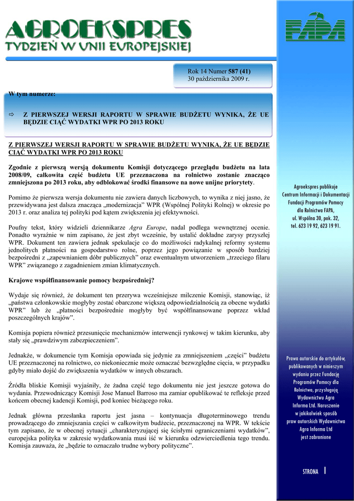 Rok 14 Numer 587 (41) 30 października 2009 r. W tym numerze: Ö Z PIERWSZEJ WERSJI RAPORTU W SPRAWIE BUDŻETU WYNIKA, ŻE UE BĘDZIE CIĄĆ WYDATKI WPR PO 2013 ROKU Z PIERWSZEJ WERSJI RAPORTU W SPRAWIE BUDŻETU WYNIKA, ŻE UE BĘDZIE CIĄĆ WYDATKI WPR PO 2013 ROKU Zgodnie z pierwszą wersją dokumentu Komisji dotyczącego przeglądu budżetu na lata 2008/09, całkowita część budżetu UE przeznaczona na rolnictwo zostanie znacząco zmniejszona po 2013 roku, aby odblokować środki finansowe na nowe unijne priorytety. Pomimo że pierwsza wersja dokumentu nie zawiera danych liczbowych, to wynika z niej jasno, że przewidywana jest dalsza znacząca „modernizacja” WPR (Wspólnej Polityki Rolnej) w okresie po 2013 r. oraz analiza tej polityki pod kątem zwiększenia jej efektywności. Poufny tekst, który widzieli dziennikarze Agra Europe, nadal podlega wewnętrznej ocenie. Ponadto wyraźnie w nim zapisano, że jest zbyt wcześnie, by ustalić dokładne zarysy przyszłej WPR. Dokument ten zawiera jednak spekulacje co do możliwości radykalnej reformy systemu jednolitych płatności na gospodarstwo rolne, poprzez jego powiązanie w sposób bardziej bezpośredni z „zapewnianiem dóbr publicznych” oraz ewentualnym utworzeniem „trzeciego filaru WPR” związanego z zagadnieniem zmian klimatycznych. Krajowe współfinansowanie pomocy bezpośredniej? Wydaje się również, że dokument ten przerywa wcześniejsze milczenie Komisji, stanowiąc, iż „państwa członkowskie mogłyby zostać obarczone większą odpowiedzialnością za obecne wydatki WPR” lub że „płatności bezpośrednie mogłyby być współfinansowane poprzez wkład poszczególnych krajów”. Komisja popiera również przesunięcie mechanizmów interwencji rynkowej w takim kierunku, aby stały się „prawdziwym zabezpieczeniem”. Jednakże, w dokumencie tym Komisja opowiada się jedynie za zmniejszeniem „części” budżetu UE przeznaczonej na rolnictwo, co niekoniecznie może oznaczać bezwzględne cięcia, w przypadku gdyby miało dojść do zwiększenia wydatków w innych obszarach. Źródła bliskie Komisji wyjaśniły, że żadna część tego dokumentu nie jest jeszcze gotowa do wydania. Przewodniczący Komisji Jose Manuel Barroso ma zamiar opublikować te refleksje przed końcem obecnej kadencji Komisji, pod koniec bieżącego roku. Jednak główna przesłanka raportu jest jasna – kontynuacja długoterminowego trendu prowadzącego do zmniejszania części w całkowitym budżecie, przeznaczonej na WPR. W tekście tym zapisano, że w obecnej sytuacji „charakteryzującej się ścisłymi ograniczeniami wydatków”, europejska polityka w zakresie wydatkowania musi iść w kierunku odzwierciedlenia tego trendu. Komisja zauważa, że „będzie to oznaczało trudne wybory polityczne”. STRONA 1 Trzydziestojednostronicowa pierwsza wersja raportu określa trzy istotne sprawy priorytetowe dla UE w kolejnych perspektywach finansowych: „promocja wzrostu [gospodarczego] i tworzenie miejsc pracy, klimat i bezpieczeństwo energetyczne oraz wzmocnienie globalnej Europy charakteryzującej się solidarnością, dobrobytem i bezpieczeństwem”. Tylko około dwie strony dokumentu poświęcono omówieniu ewentualnego przyszłego kierunku WPR. Komisja zauważa, że pomiędzy 1988 a 2013 r. ogólny udział wsparcia bezpośredniego dla rolnictwa w budżecie UE skurczył się z 61% do 32%. Ten trend zniżkowy pojawił się zarówno w wyniku przeprowadzenia istotnych reform, jak i zwiększonej modulacji obejmującej przesuwanie płatności w kierunku wsparcia działań na rzecz rozwoju obszarów wiejskich. Ponadto raport przewiduje, że prawdopodobnie nastąpi kontynuacja podejścia tego typu po roku 2013, ze względu na środki uzgodnione w ramach przeglądu Health Check w listopadzie ubiegłego roku. Kluczowym celem reformy rolnej jest „stanowcze dążenie do modernizacji WPR, dzięki czemu będzie ona mogła sprostać nowym wyzwaniom, a także umożliwi koncentrowanie wydatków tam, gdzie są one najbardziej efektywne”. Zmiany klimatu – trzeci filar Jednym z takich nowych wyzwań są zmiany klimatyczne. Według raportu rolnictwo musi w większym stopniu przyczyniać się do łagodzenia skutków tych zmian, o ile nie będzie to zagrażać jego konkurencyjności i rentowności. Raport zawiera sugestię, że aby lepiej wykorzystywać fundusze UE skierowane na walkę ze zmianami klimatu, należy utworzyć „trzeci filar” WPR związany konkretnie z tymi problemami. Dokument jednak zawiera również ostrzeżenie, że te nowe problemy i obawy o środowisko naturalne mogą być rozwiązywane jedynie w ramach „szerszej strategii” – najlepiej, gdyby były uwzględniane w innych politykach. Wydaje się, że również szerzej rozumiana polityka rozwoju obszarów wiejskich zostanie poddana przeglądowi, przy czym Komisja dzieli się refleksją, że „można by przeznaczyć więcej środków na działalność pozarolniczą i ochronę środowiska naturalnego.” W dokumencie dodano jednak że: „Prowadzi to do pytania o związek pomiędzy polityką spójności a polityką rozwoju obszarów wiejskich” – uwaga, która ponownie wywoła debatę na temat kwestii, czy środki na rzecz działalności pozarolniczej i rozwój obszarów wiejskich powinny rzeczywiście stanowić integralną część WPR. Bardziej ogólnie w przeglądzie określono, że „rolnictwo europejskie musi robić więcej, by zmniejszyć emisję gazów cieplarnianych i rozwijać użytkowanie gruntów w celu tworzenia tzw. zielonych płuc [przyp. red.]. Będzie musiało także sprostać oczekiwaniom społeczeństwa europejskiego co do zapewnienia jakości artykułów żywnościowych, bioróżnorodności, zasobów wodnych i dobrostanu zwierząt.” Wsparcie dochodów Odzwierciedlając poglądy Komisji wyrażone w trakcie ubiegłorocznej dyskusji w ramach Health Check, w raporcie odnotowano, że płatności bezpośrednie dla rolników nie powinny 
